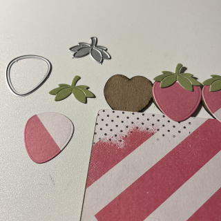 Taking the same die cut collection, I've cut strawberry leaves and added the toppers, and a flower to the front. My final touch is to stamp the word "sweet" on the front of the divider.