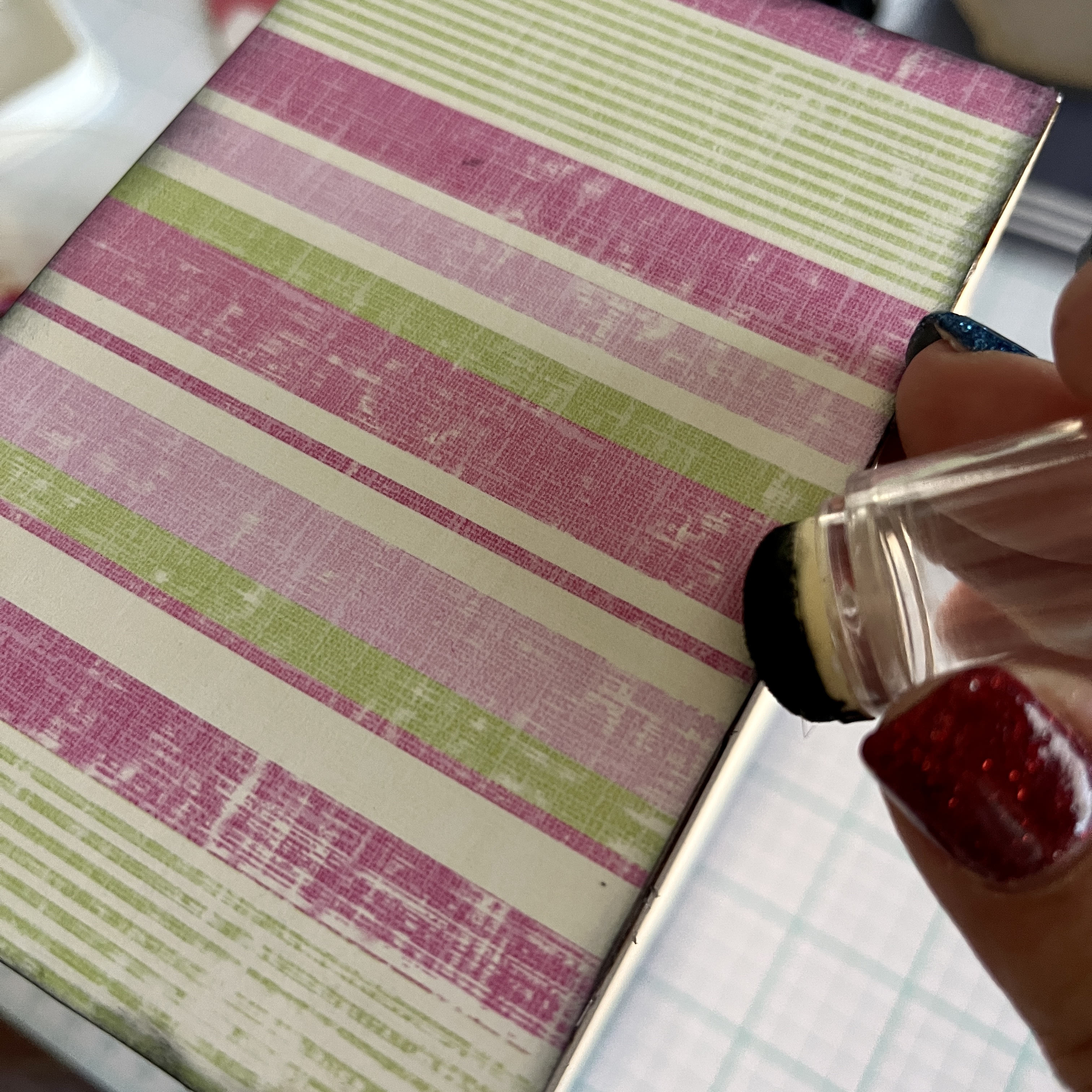 Finish the top off with the acetate layer, remembering to remove the protective film. The top layer is more of the pretty paper and dusted with ink on the edges. And I have cut out a green strawberry top that is stamped with a pattern stamp and attached a flower and sentiment to the front. So cute!!