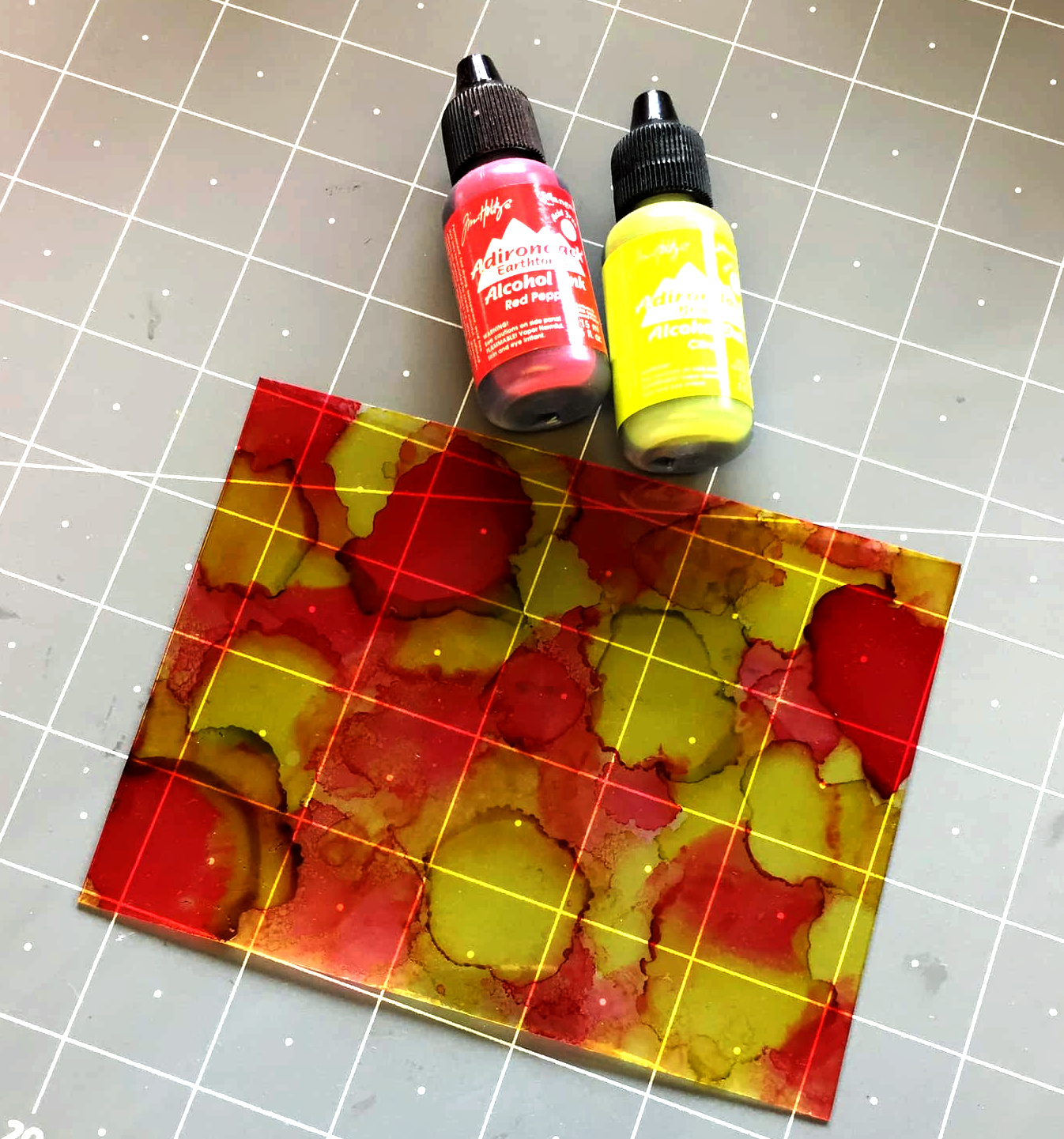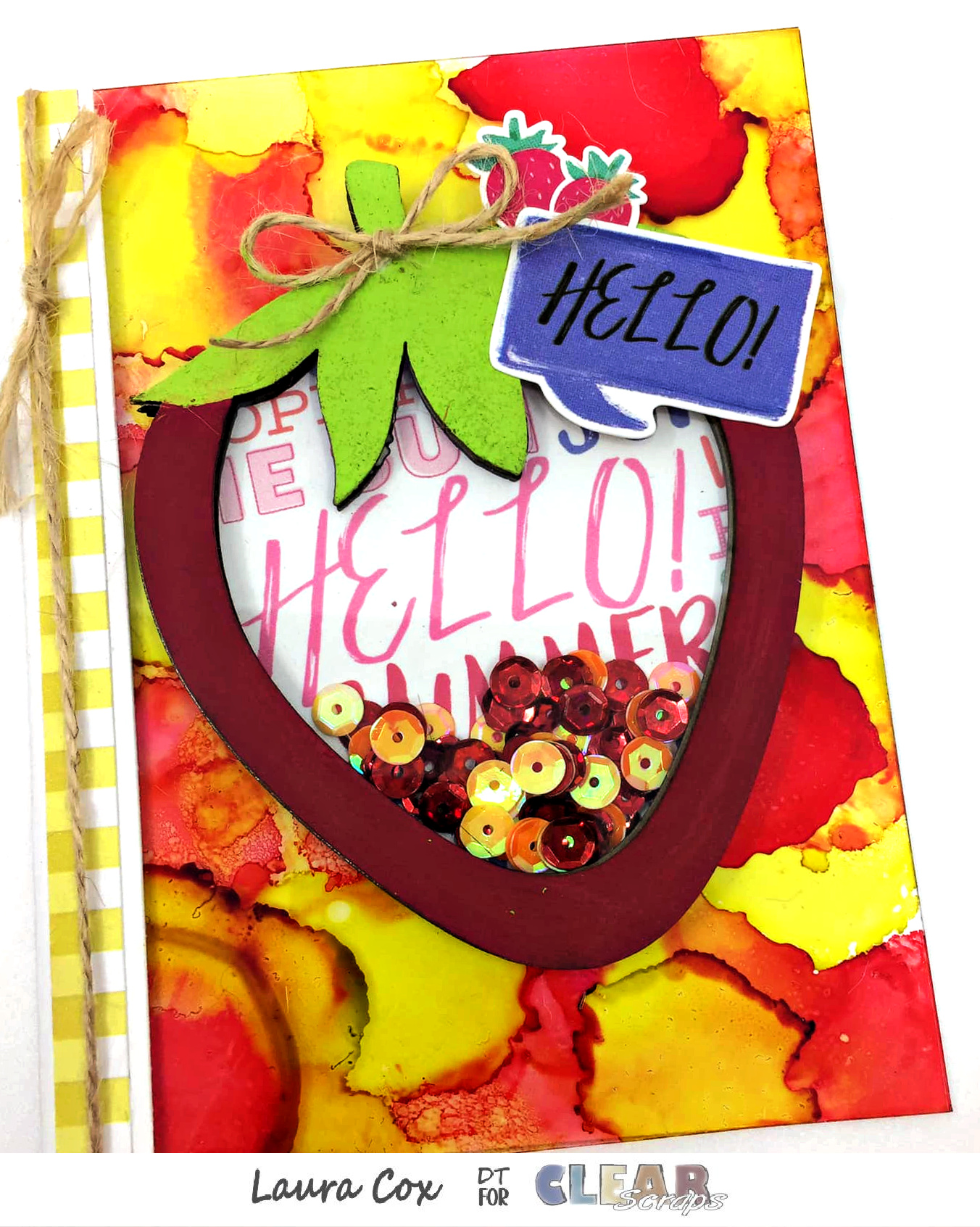 For this juicy strawberry shaker I wanted a fun splashy background so I used a clear acrylic piece and bright fun red and yellow-green alcohol inks!