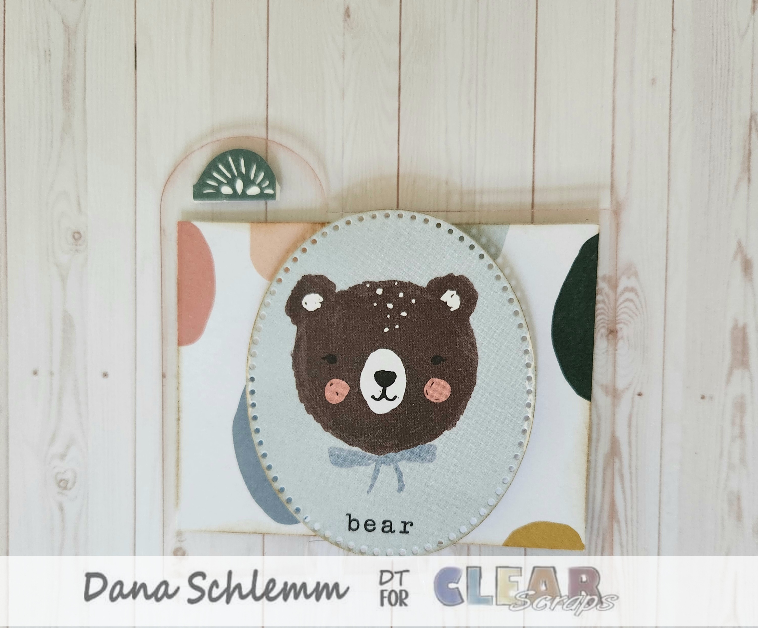 Card 1: I cut my polka dot paper to measure 4 x 2 & 3/4 inches, then adhered onto my card. I applied a scallop sticker on the top tab. Using a Circle die I cut out this cute little bear image and then adhered in the center of my card using foam dots. Here's a photo!