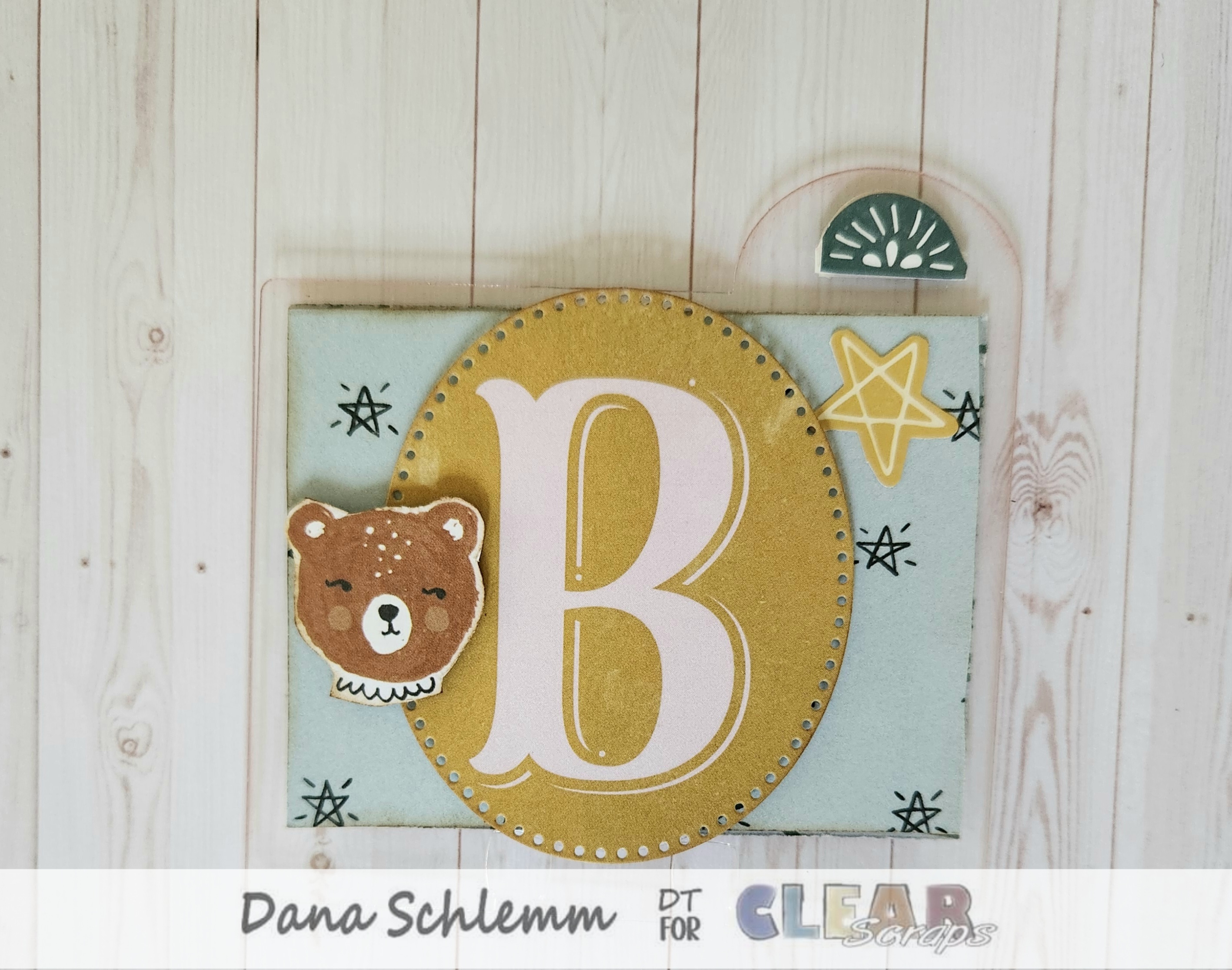 Back of Card 1: I adhered another patterned paper onto my card, applied another scalloped sticker on the top tab. Then using my same die, I diecut the Letter B and adhered to the center using foam dots I fussy cut out a little bear and applied on the left edge using foam dots and adhered a star sticker at the top. Here's a photo: