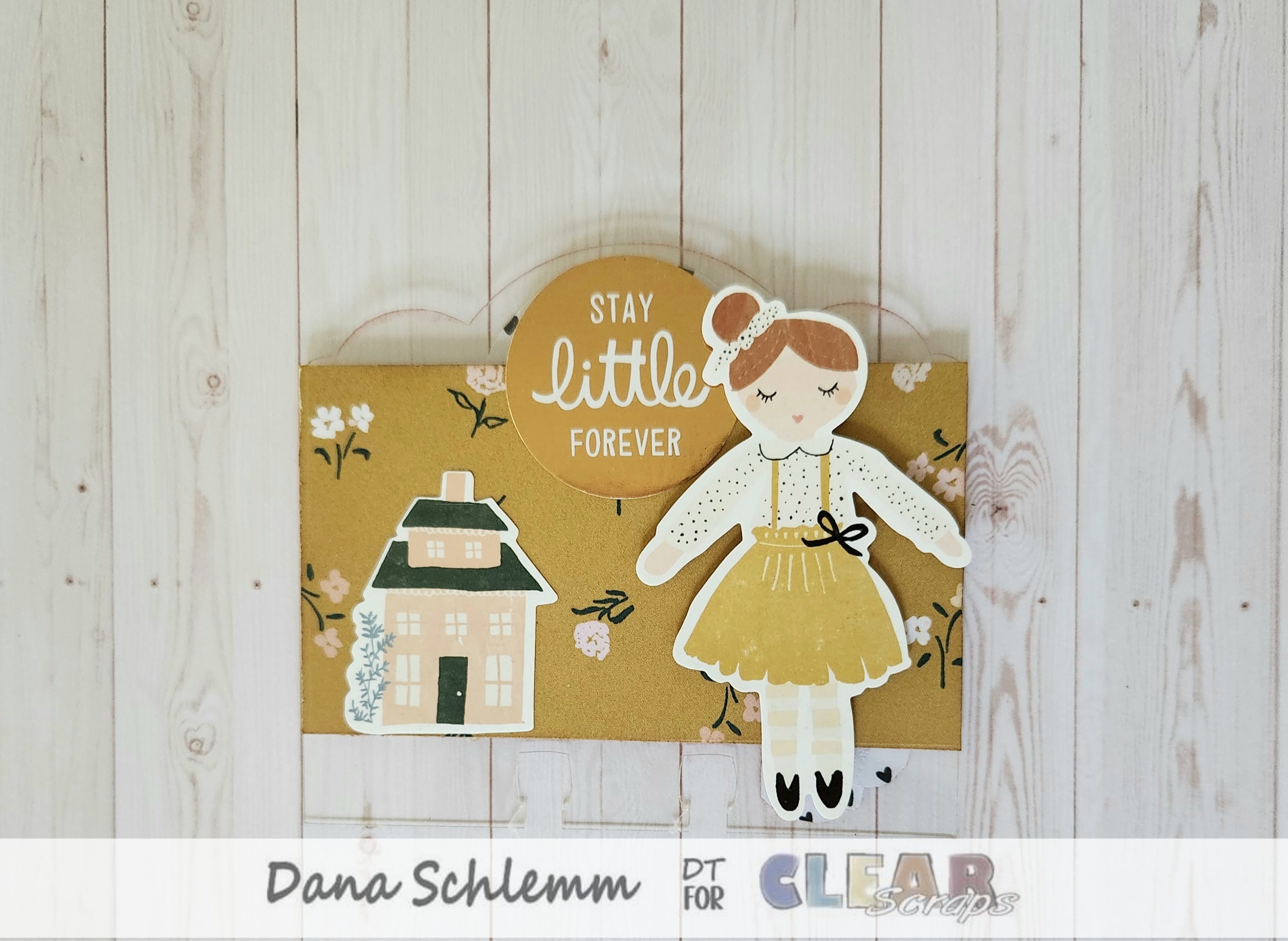 Card 2:( Scalloped) glued a gold/floral paper onto my Divider ccard.i adhered this cute little girl sticker to my card using foam dots. Added a sticker sentiment on the top Scalloped tab and a house sticker on the left side. Here's a closeup!