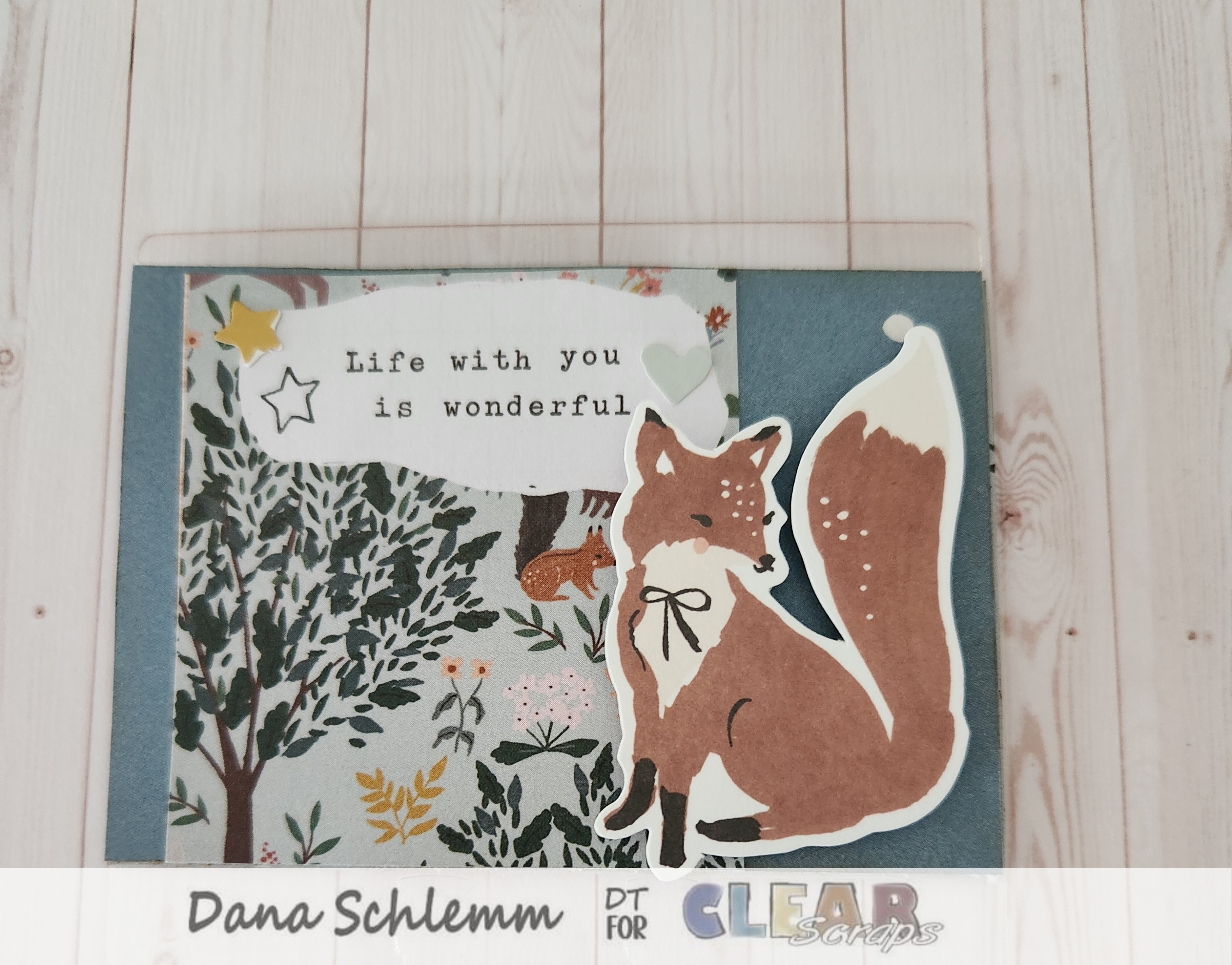 Card 3 Regular: I adhered another patterned paper to my Divider card. Then cut out a small journal card and sentiment on top. Using foam dots I adhered the cute fox sticker and a tiny gold sticker. Here's a photo!
