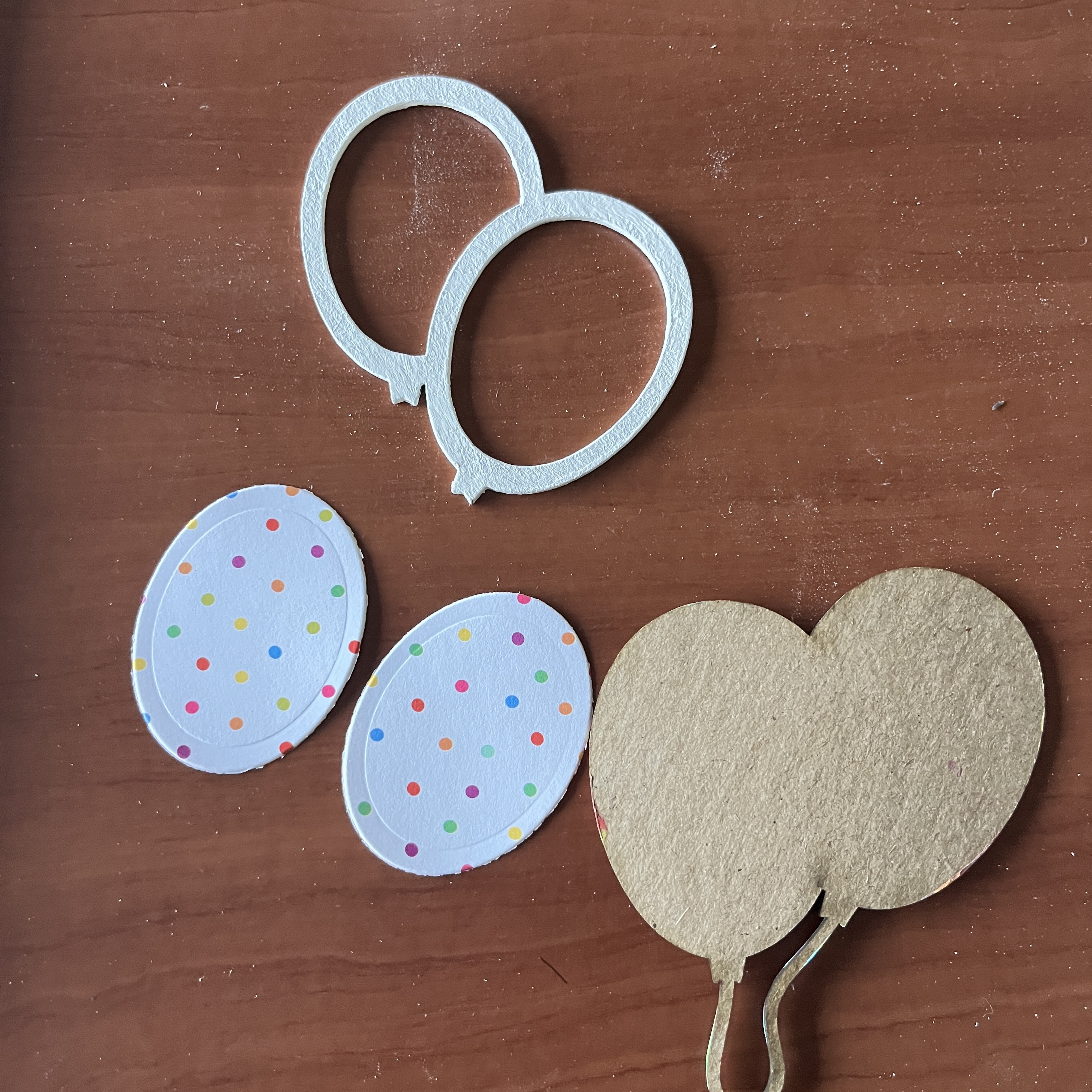 I've chosen the Script Birthday and Balloons chipboard embellishment, and painted the balloons white, and stems black. Behind this on the base piece, I've cut out a polka dot paper and glued it down. This is added to the corner, when dry.