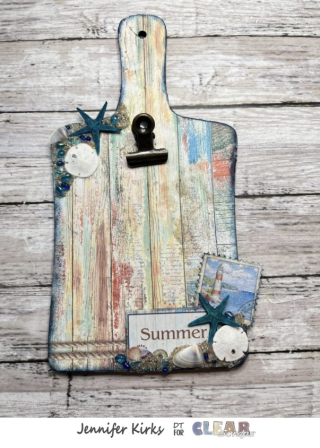 Then I added a hinge clamp with a brad to the middle top portion of the paper. Next I glued the paper to the cutting board using 3 in 1. I added ink to the edges and embellished the cutting board with Ephemera, Seaglass, sand, seashells, and starfish.