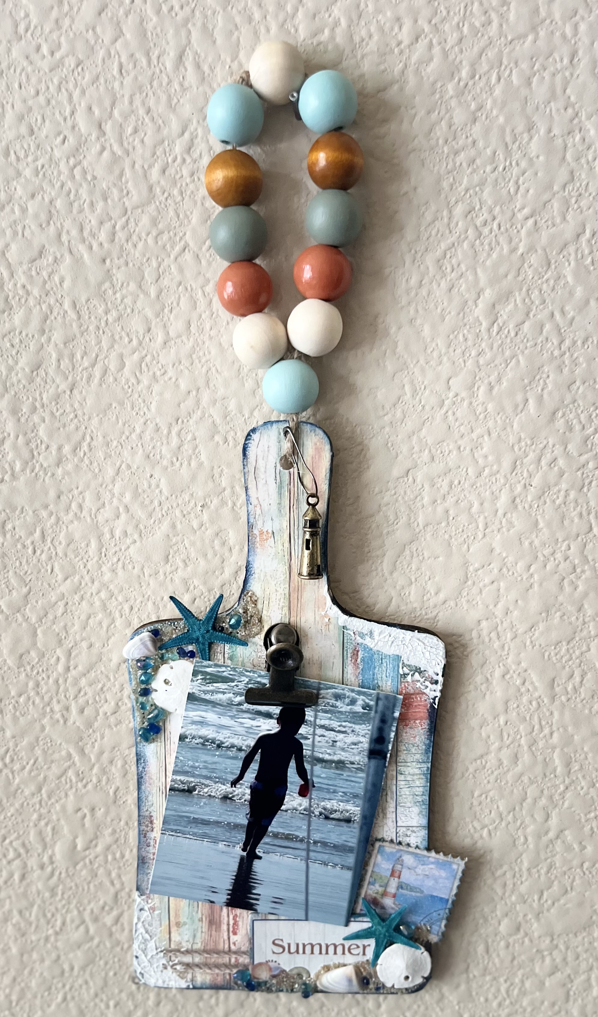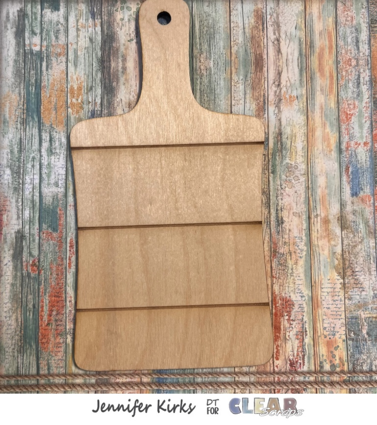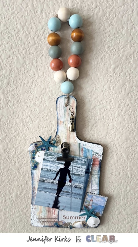 Hi all, this is Jennifer Kirks and summer is almost over, but I wanted to showcase one of my favorite pictures. Using Clear Scraps small shiplap cutting board I created a hanging photo display. I measured out the paper that I needed and using an exacto knife I cut around the edge of the cutting board.