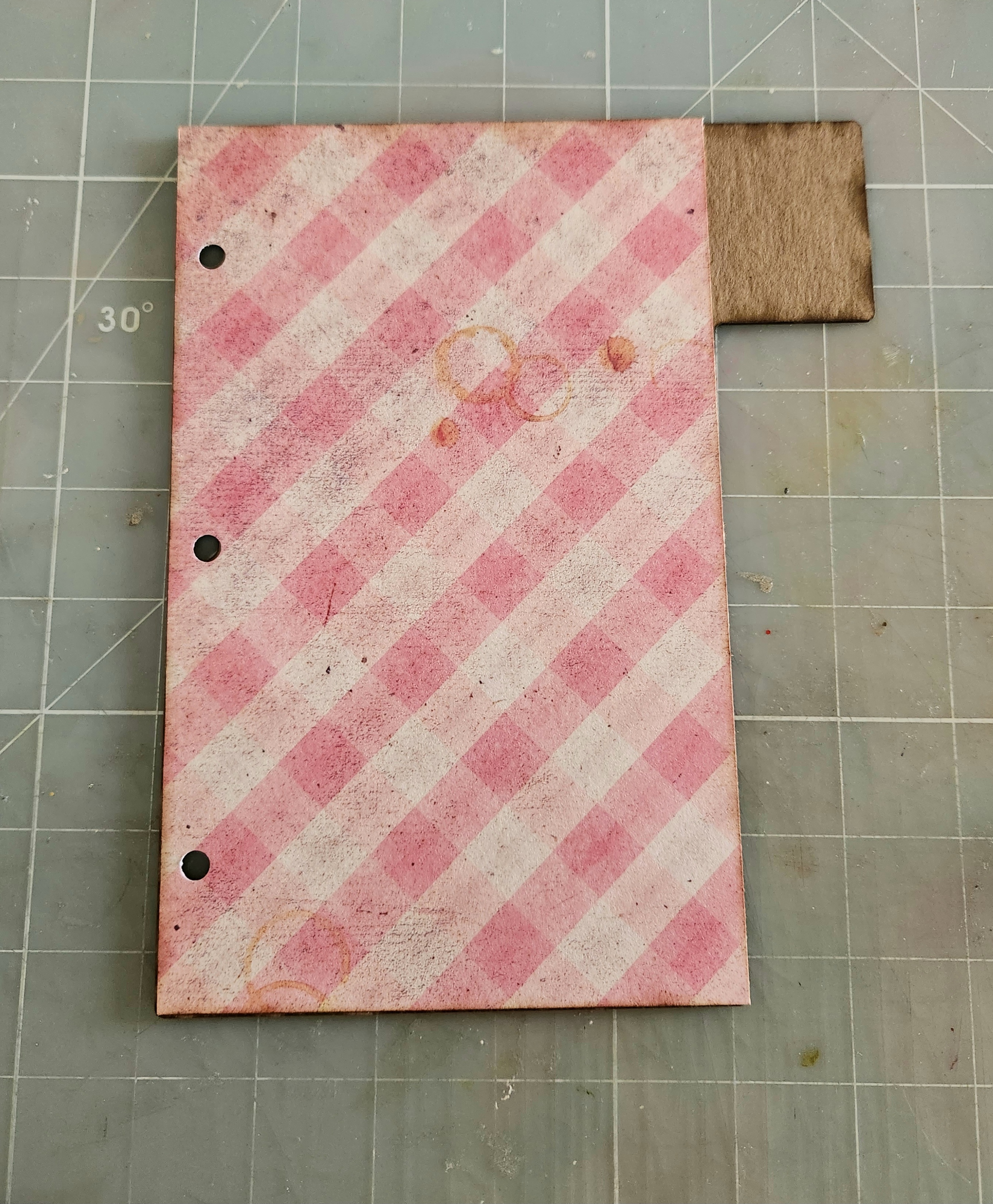 Front Cover: measures 5×8 (I used the same checkered paper for both the front and back covers. This isn't including the tabs. I used a variety of different scrap papers to decorate each tab. I'll list the measurements for those as we go along.