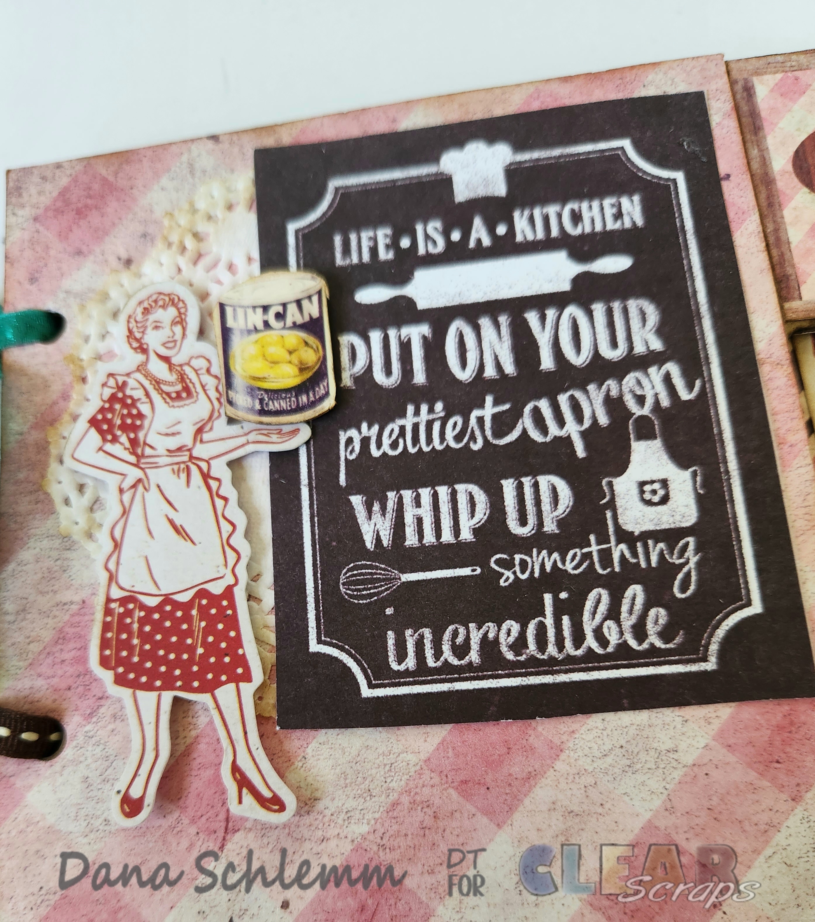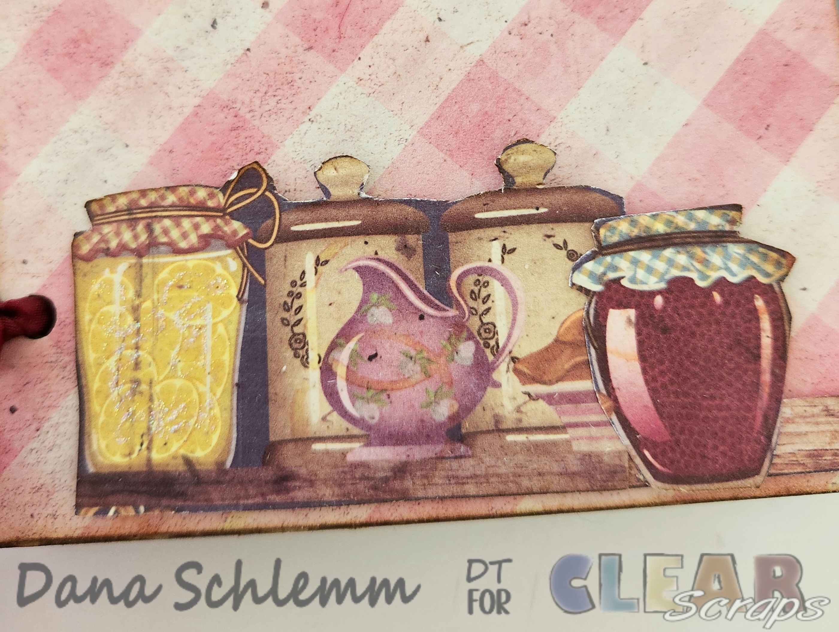 Along the bottom edge, I fussycut some kitchen images and using foam dots I adhered along the bottom. Here's a closeup!