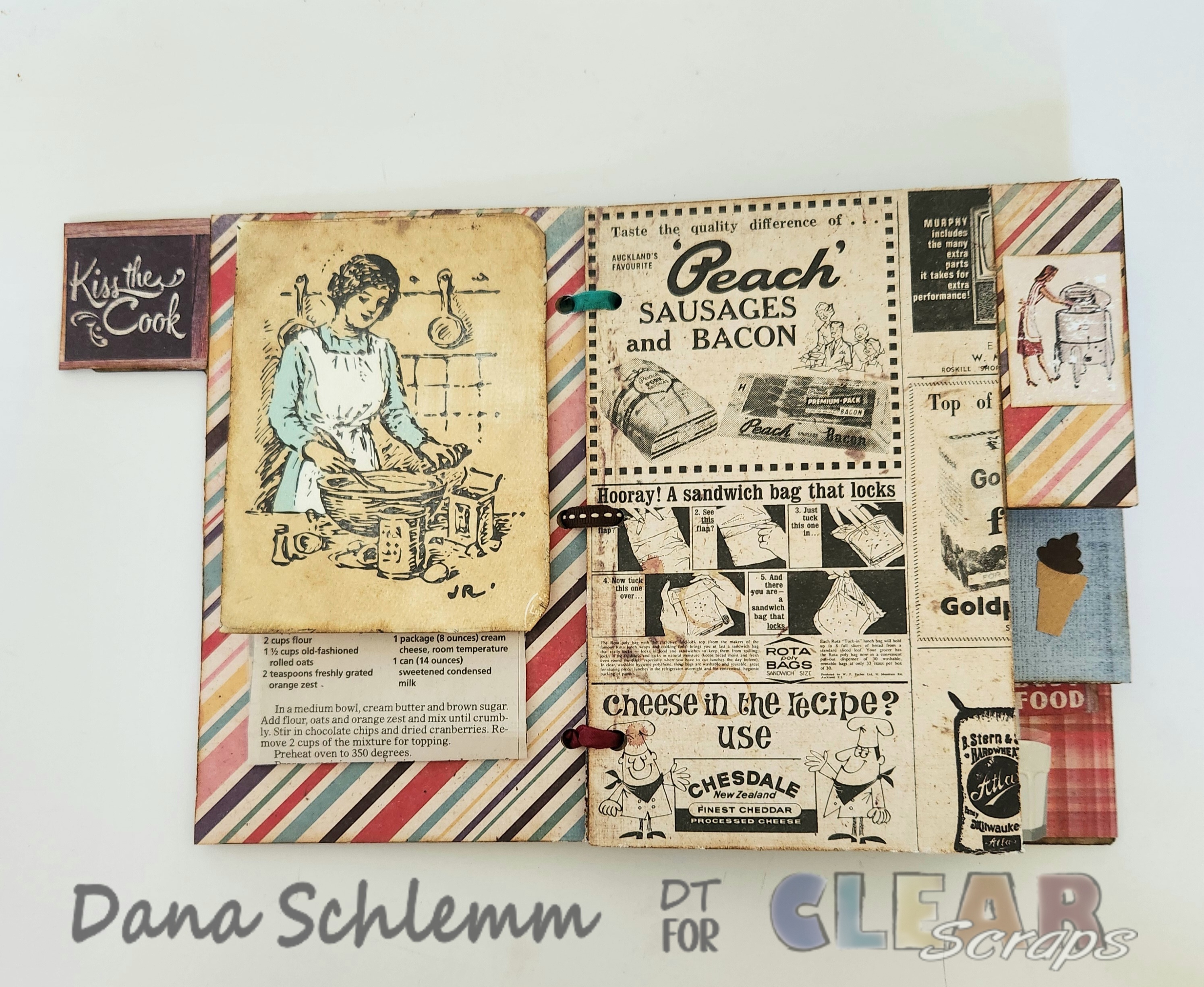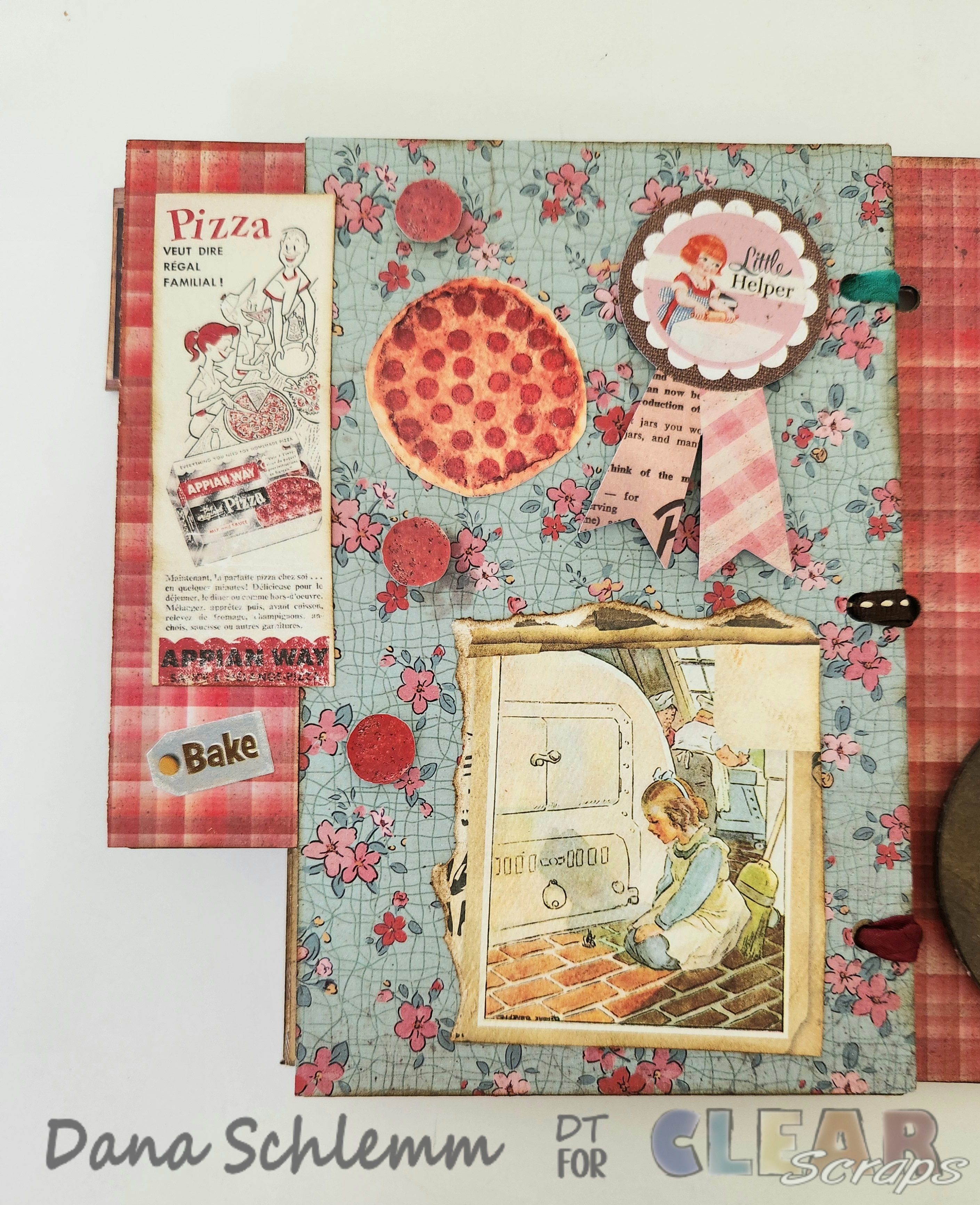 Page 5: I cut and torn along the edge of this vintage little girl card by the oven , inked the edges and glued at the bottom of my page. I cut out this old pizza ad and glued onto my tab and over lapping onto my page slightly. I added some pizza stickers to match my theme. Using foam dots I adhered another ephemera piece Little helper badge. Here's a closeup!