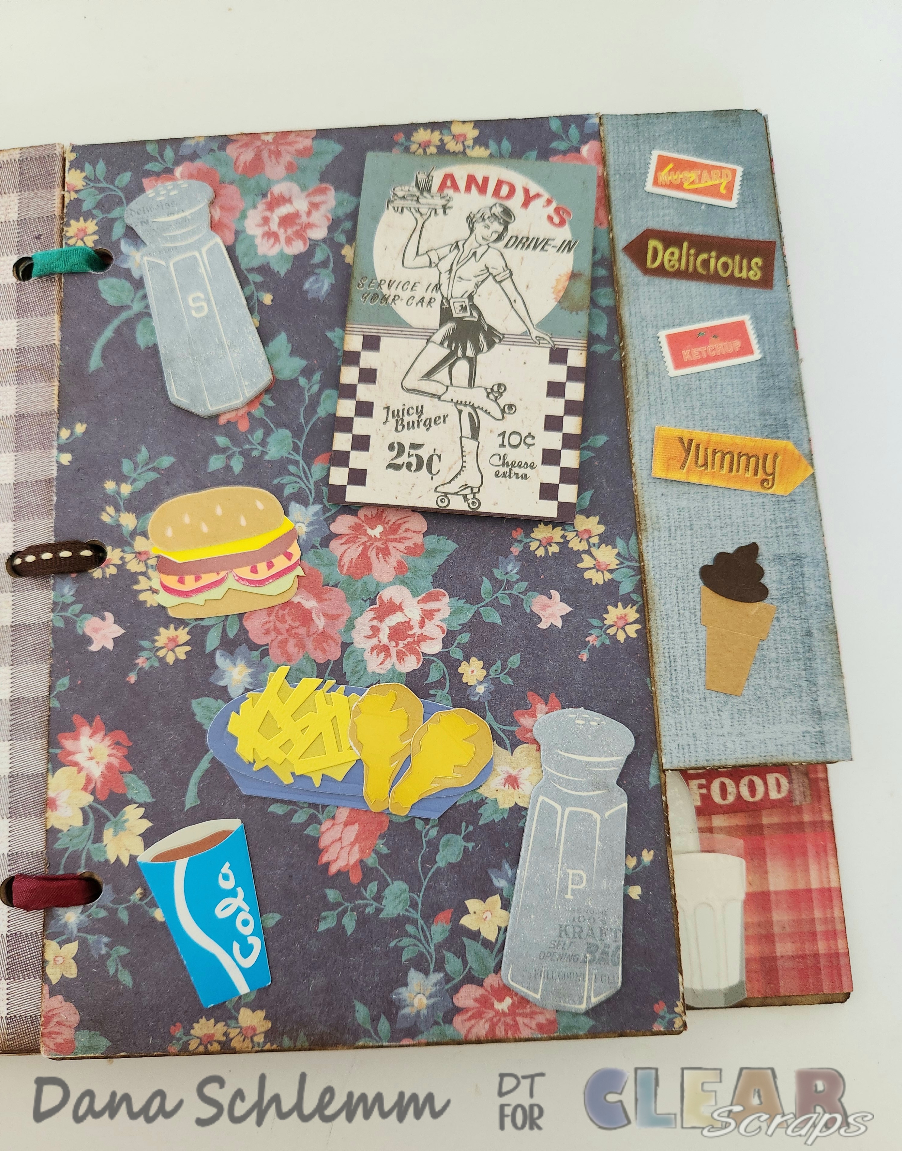 Page 4: I had fun creating this page. Using foam tape, I adhered this old Drive in ephemera card. Then I added some matching stickers and salt/pepper chipboard stickers. The tab I covered with a scrap piece of paper and added some more fun stickers and sentiment. Here's some photos!