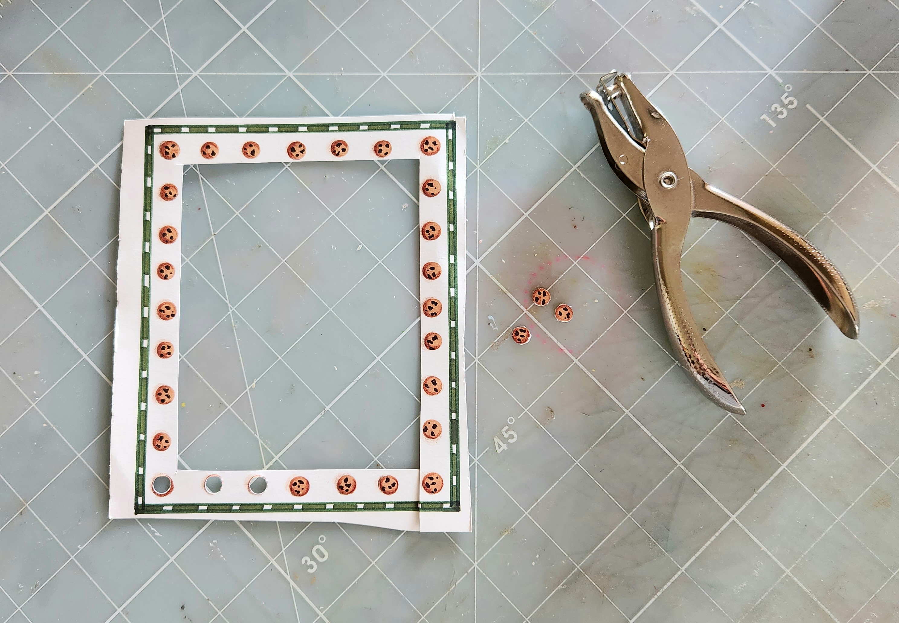 I also found an old recipe card in my stash, I trimmed out the recipe to use on my page. The border around the card had these cute tiny chocolate chip cookies. Using my punch, I punched them out. Here's a photo: