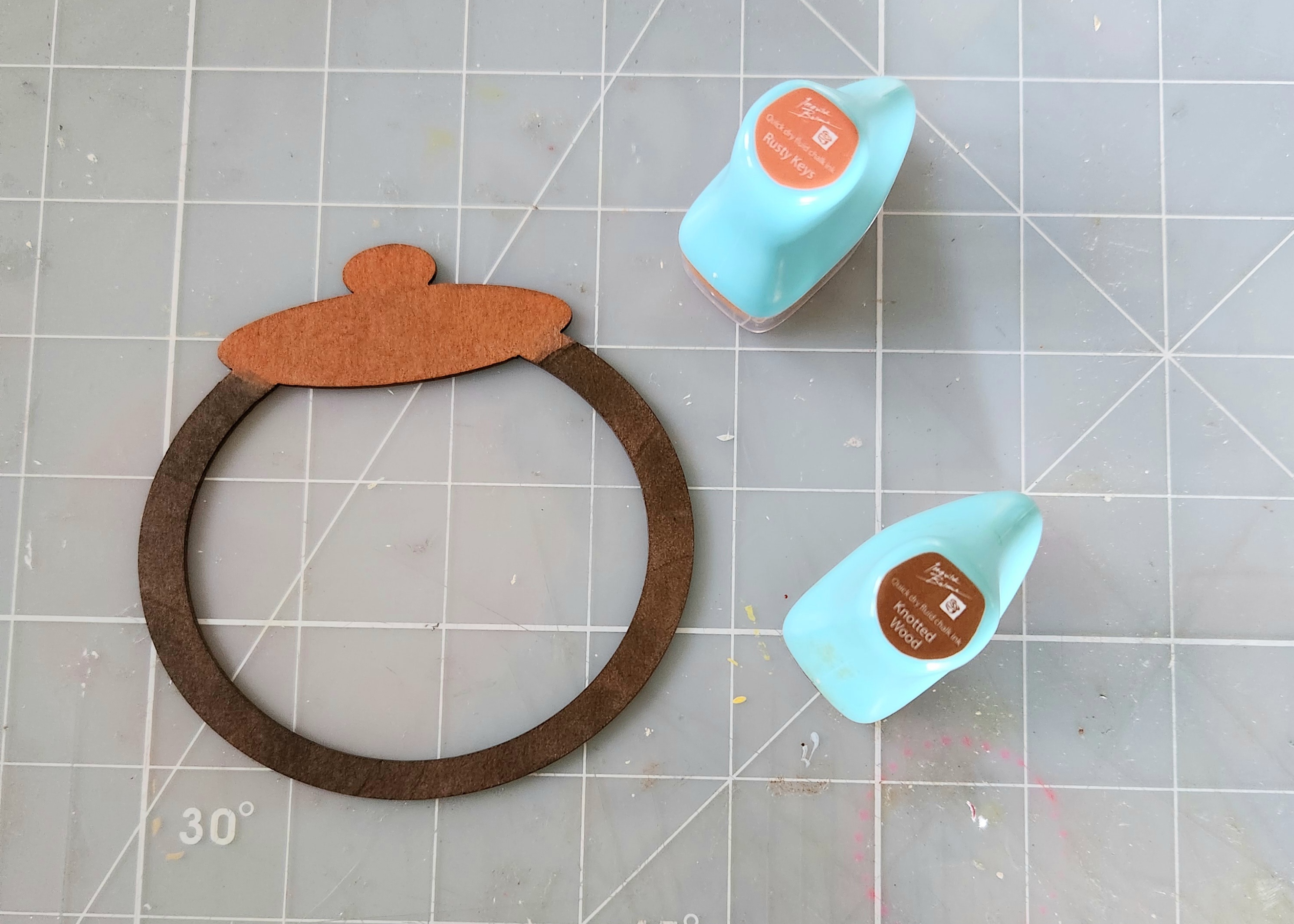 On my top shaker I applied some Chalk Ink Rusty Keys and Knotted Wood. Let dry. Now using Beacon glue, glue your first two chipboard shaker pieces in place. I glued my creme paper cookies inside the bottom of my cookie jar. Then added my tiny chocolate chip and sprinkled cookies inside.
