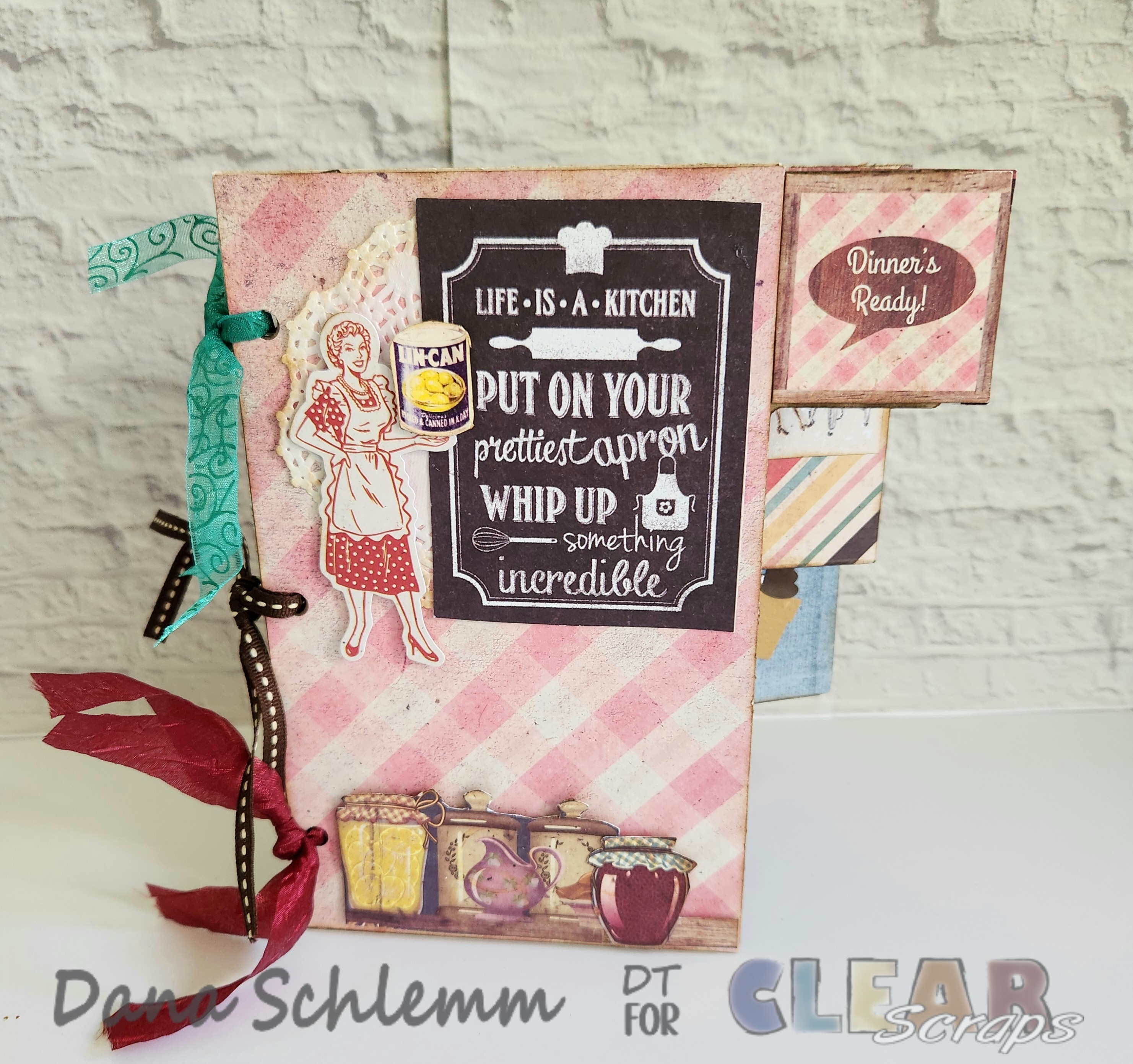 Other Supplies Used: Beacon glue, Score board, foam dots, Ruby Rock it Country Cooking papers and ephemera, Distress Ink Gathered Twigs, Prima Chalk Ink Rusty Keys and Knotted Wood, xaco knife Distress tool, assorted ribbons