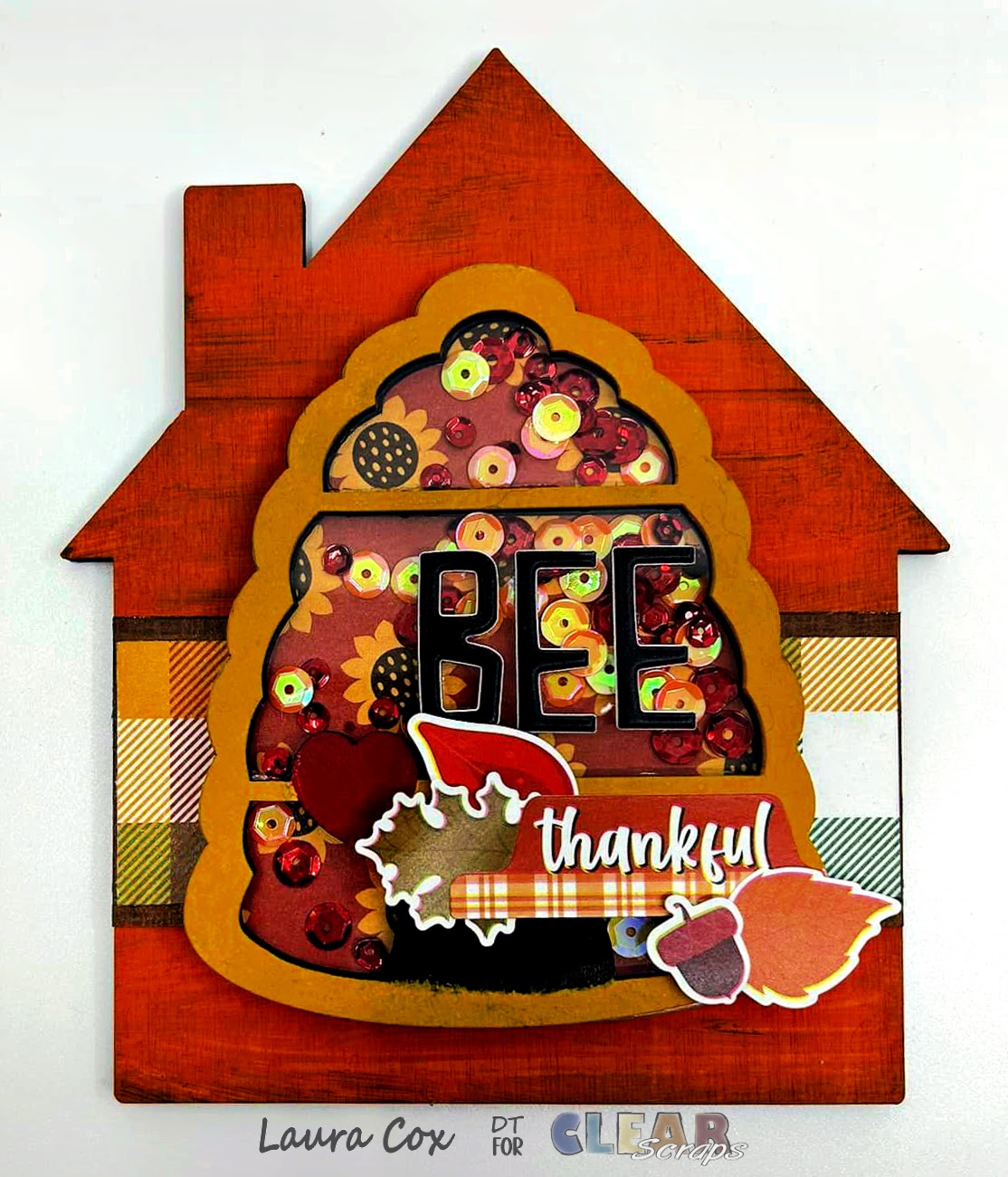 To create the mini shaker, the top frame was painted with gold, red and black acrylic paint. While it dried, the solid back piece was traced onto the patterned paper, fussy cut out and glued down. The layers of the frame were glued down on top of the back–then before the acrylic layer was glued on I added some fall color sequins. Then the acrylic and frame were glued down, and a few letters and stickers added. The beehive shaker was glued to the house piece and project complete! This would be so cute at place settings for a fall get-together!