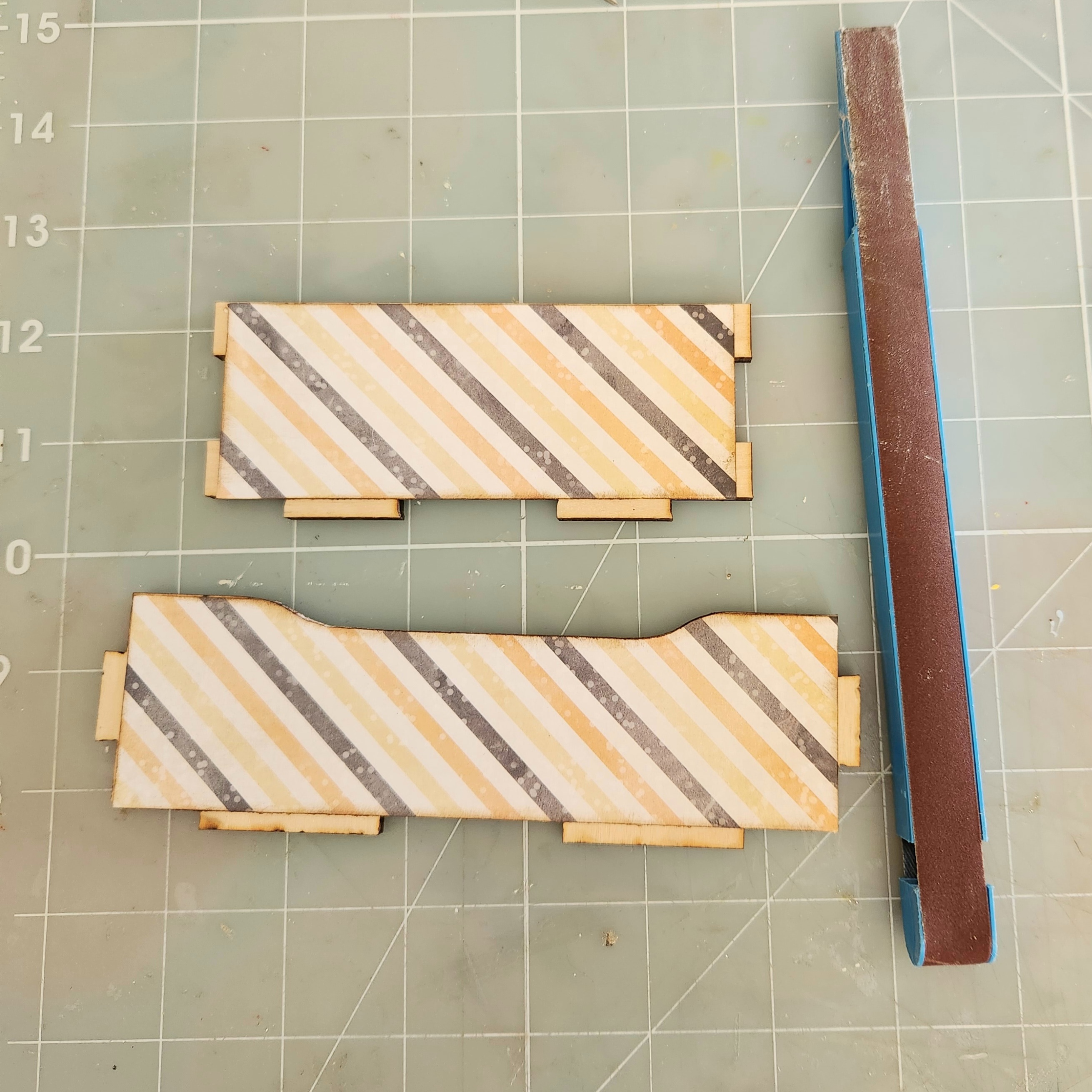 I cover all my wood side, front and back pieces with coordinating papers. The 2 longer side pieces measure 6 x 1 &3/4 inches. The short sides measure 4 & 1/2 x 1 & 3/4 inches. I recommend using a strong permanent glue such as Beacon glue. I trimmed the long top edges and remove any excess paper using my x-acto knife.