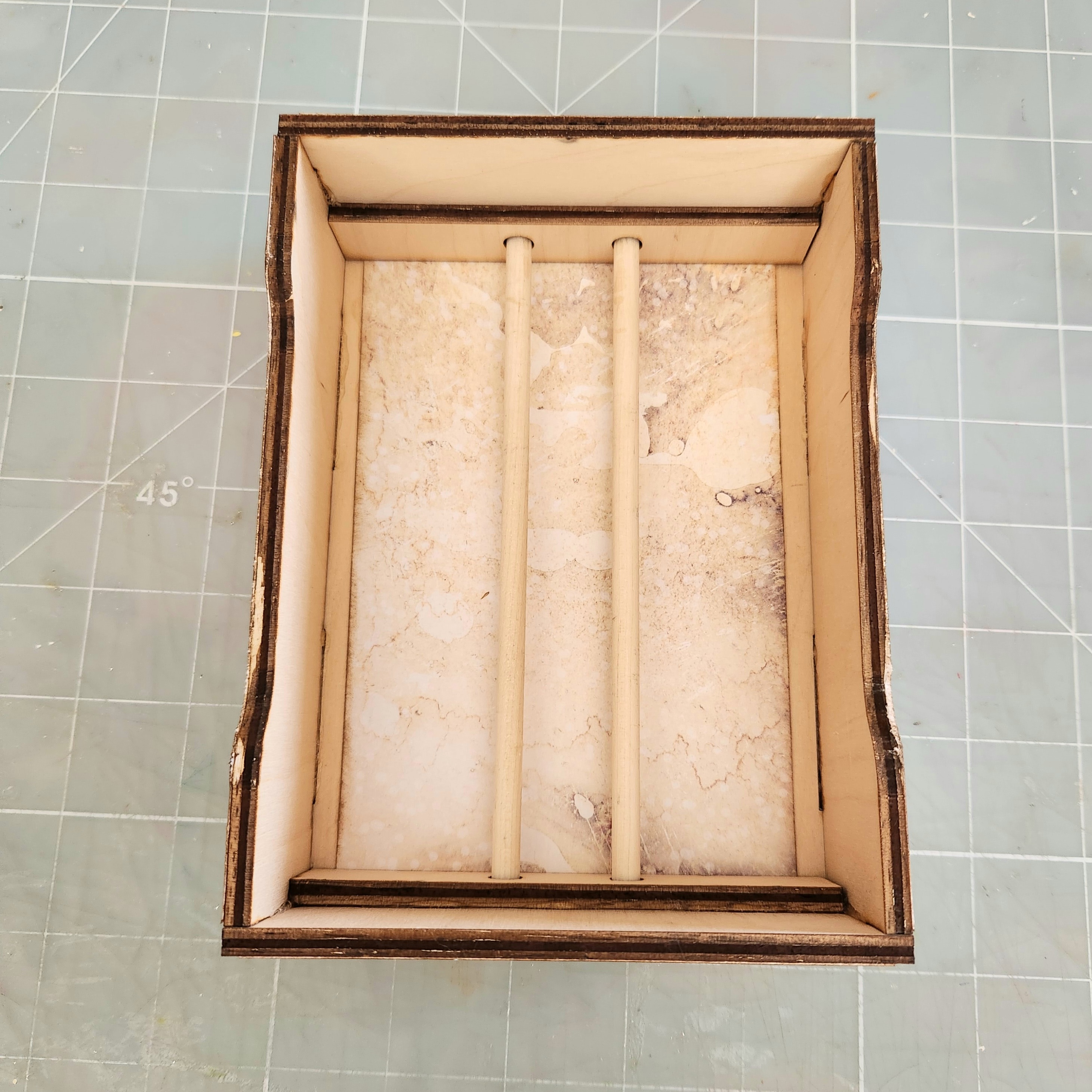 Now you are assemble and glue all your wood pieces in place. Slide the two poles through the holes and adhere each piece onto the front and back sides. Set your box aside for now. Here's a photo: