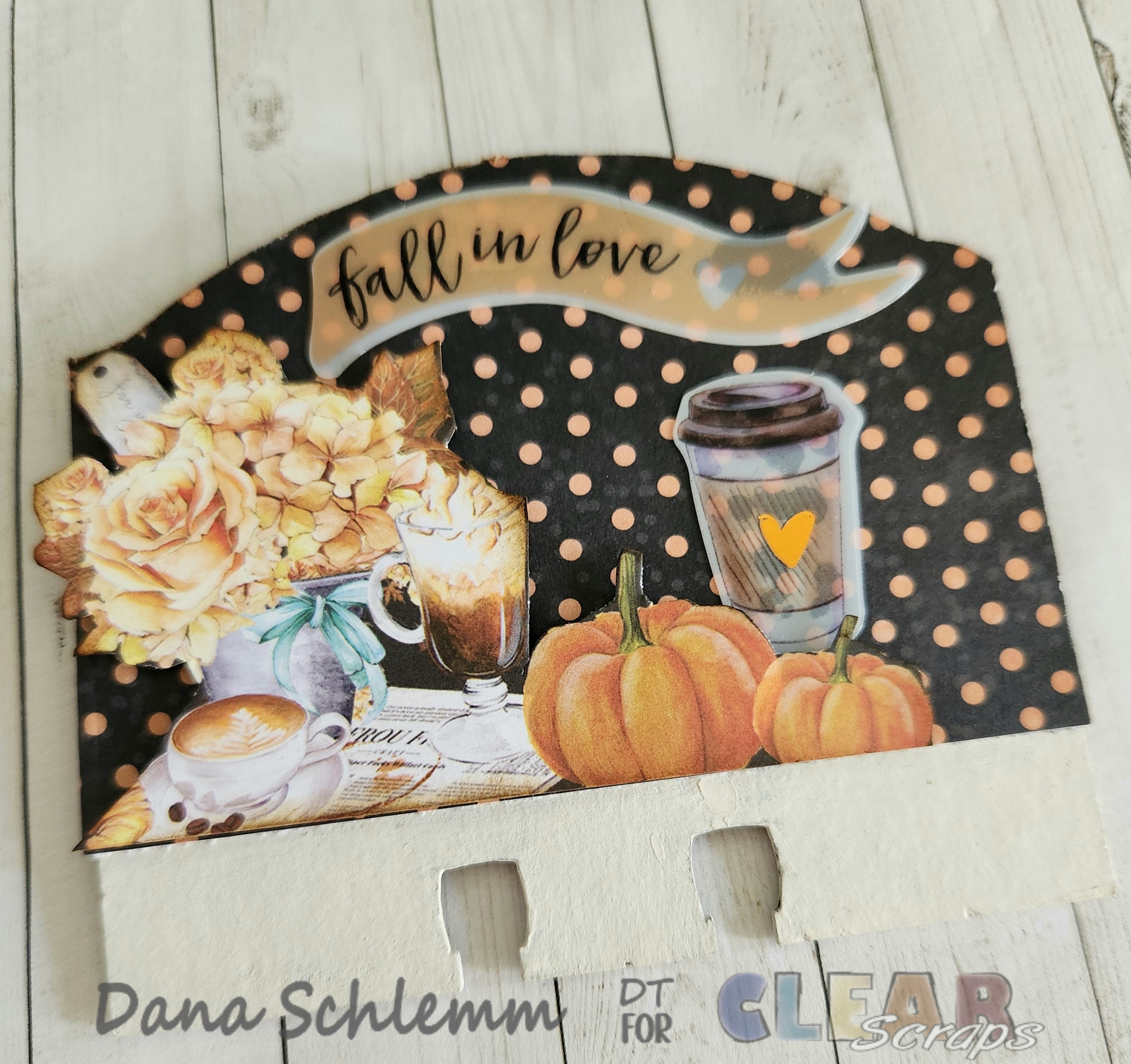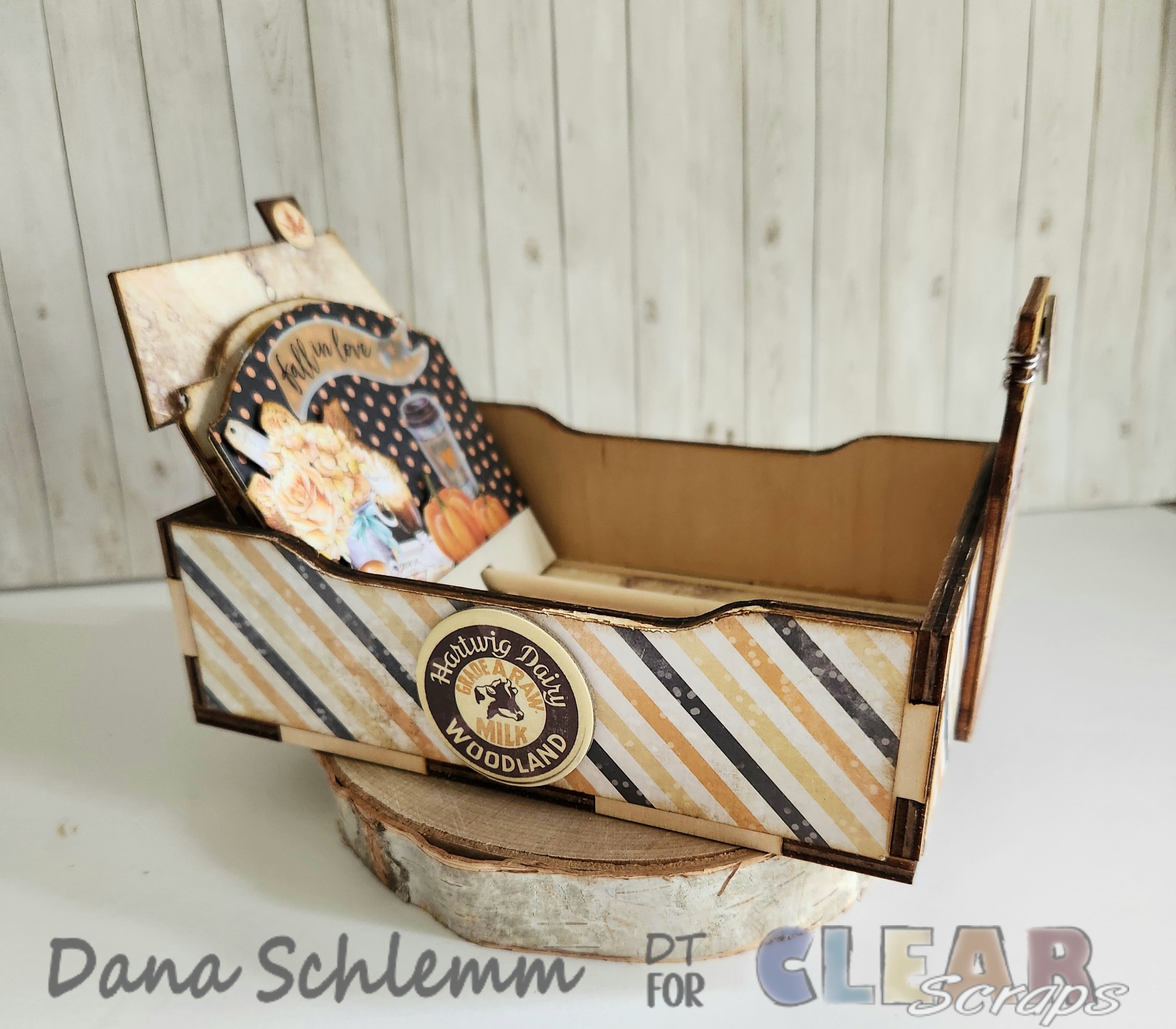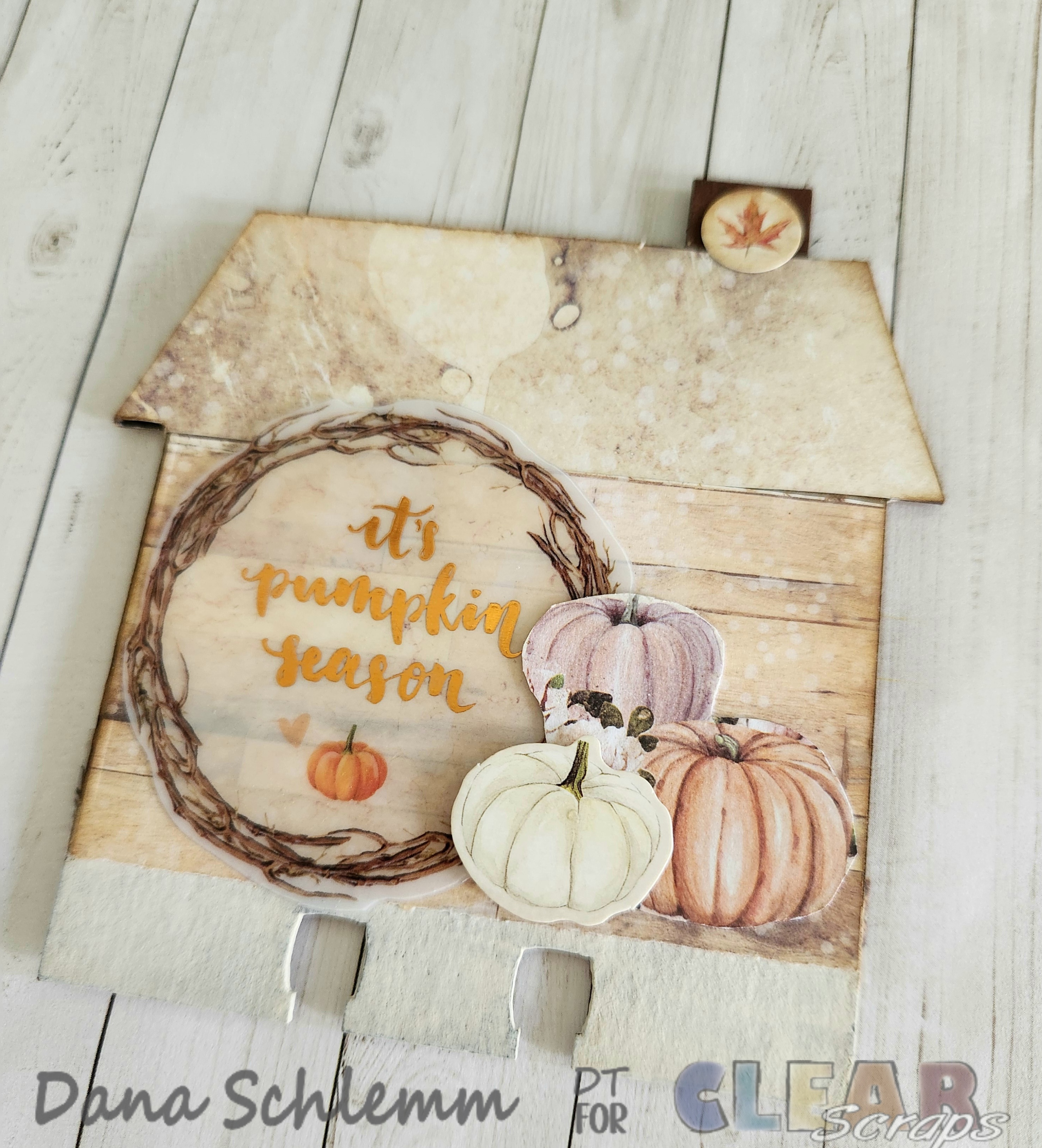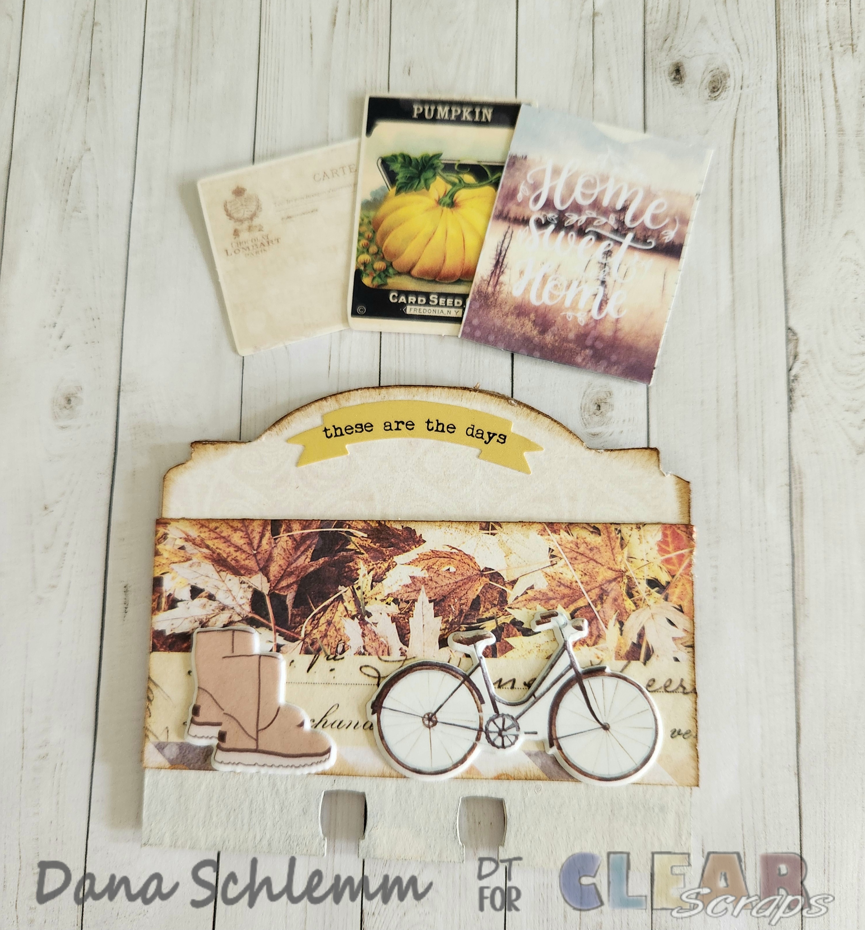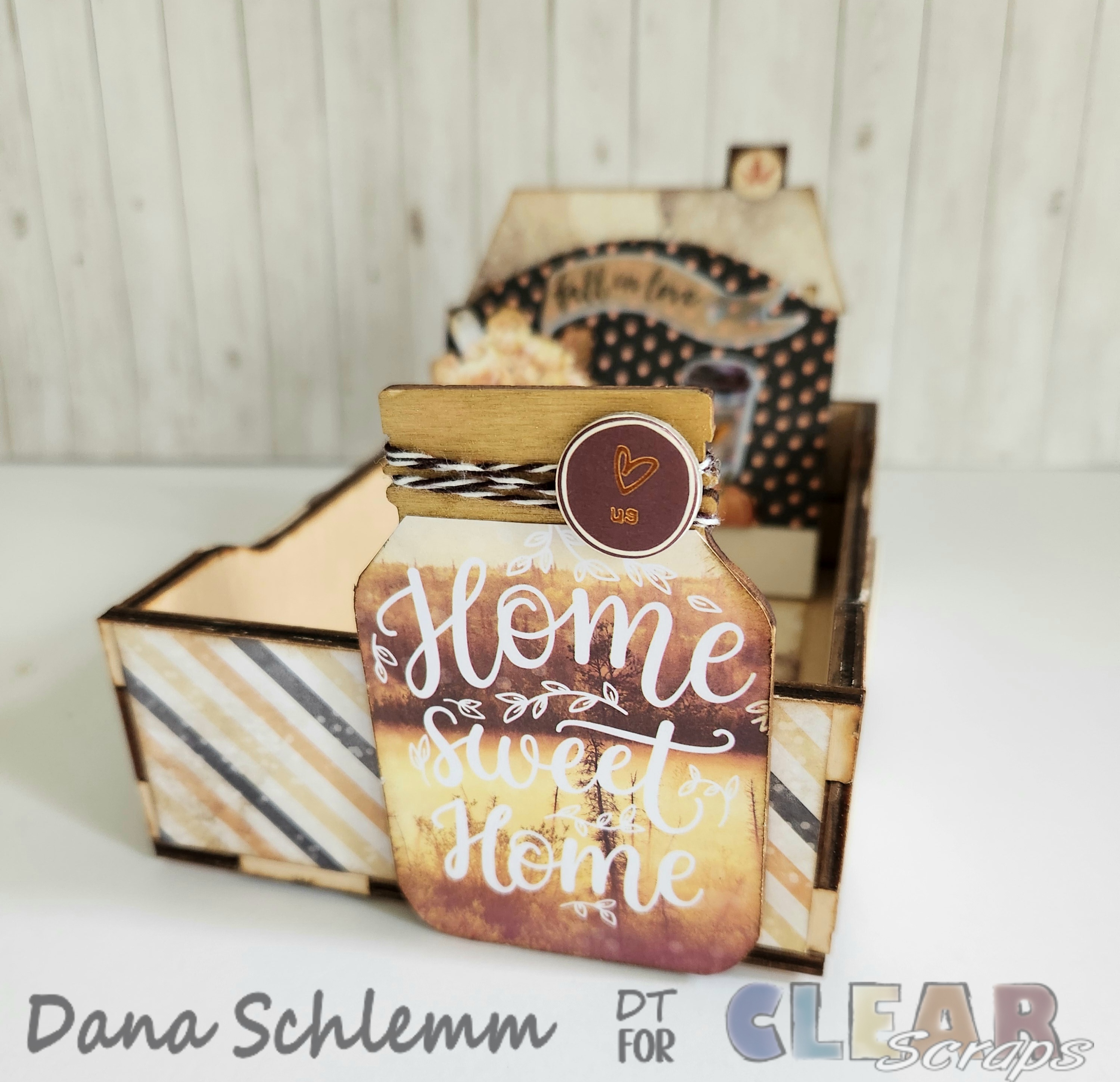 Dana here! I'm back on the blog to share a fun autumn DIY project using Clear Scraps DIY Wood box Click here Welcome Jar shape Click here and Divider Cards House's chip Click here Angle Chip Click here and Rounded Chip Click here