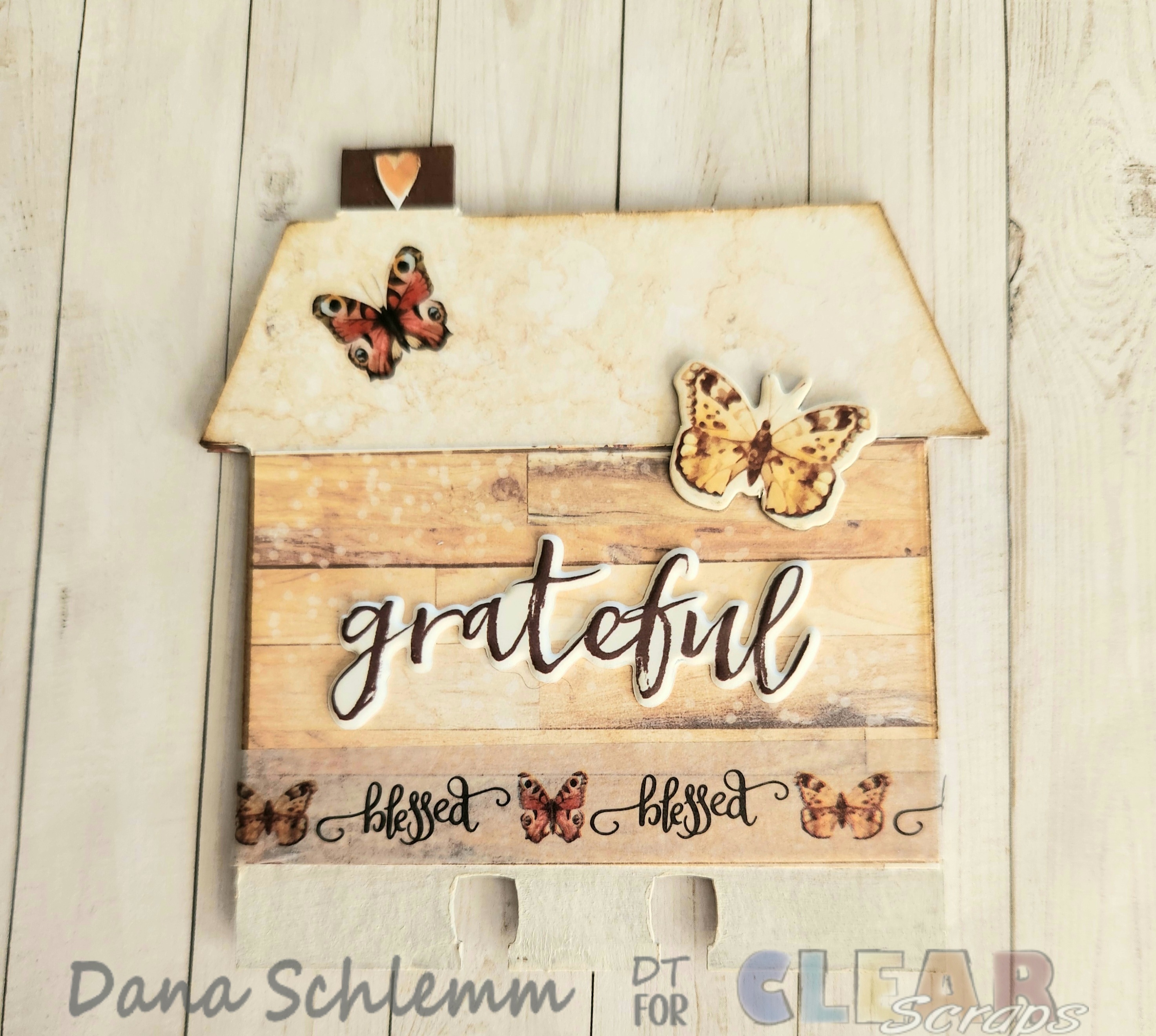 Card 1 back: I covered with the same base papers, applied some Blessed washi tape along the bottom edge. I adhered a puffy sticker sentiment and butterfly pieces and butterfly sticker on the roof! Here's a closeup: