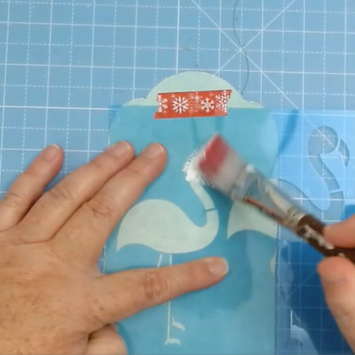 After the paint is dry from using my stencil now I can add more details. I use my stamping inks to give my flamingo a ombre look. I start off by using the lightest color all over the body of the flamingo but leaving the bottom of the belly white, then I rub on a darker pink with my ink blender starting around the top towards the middle lightly and add more ink layers as I move to the top of the flamingo.