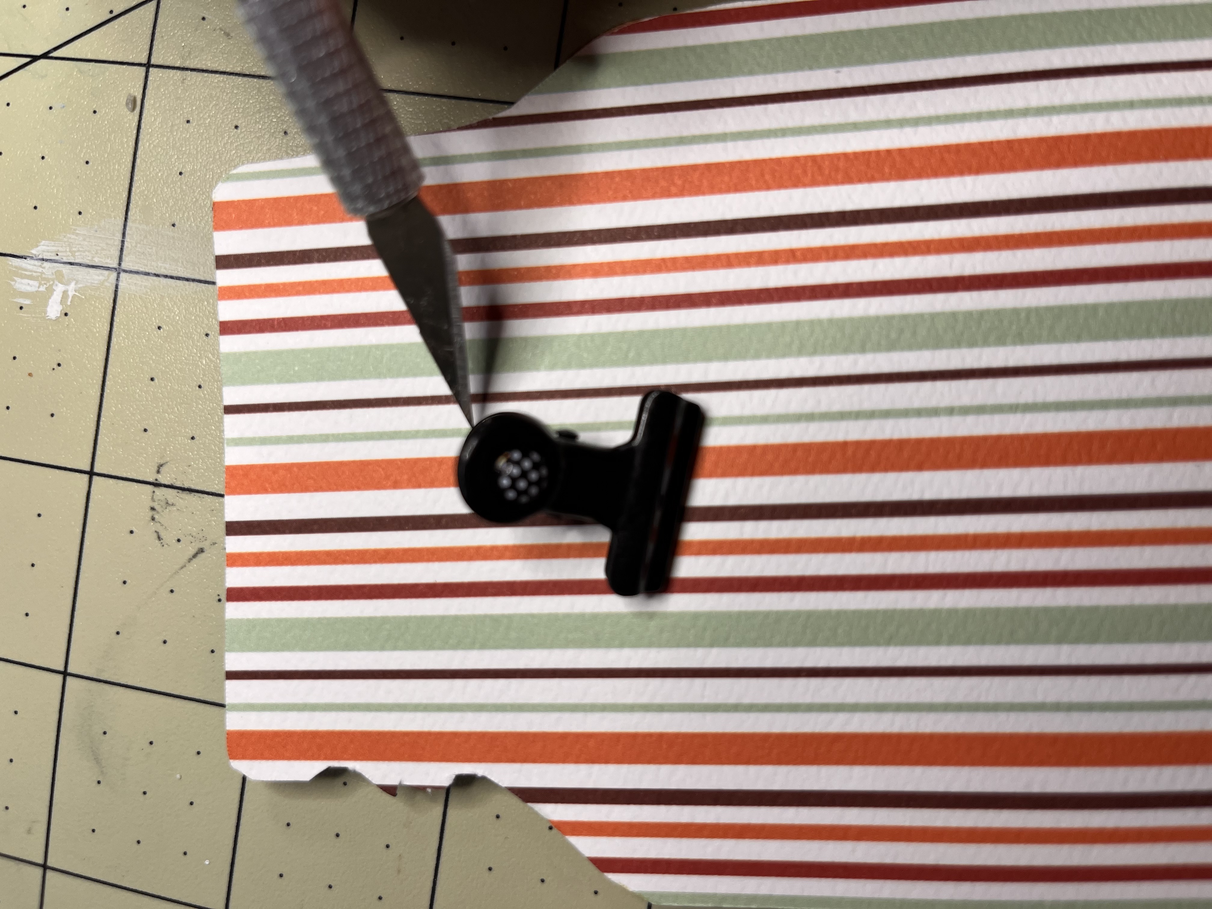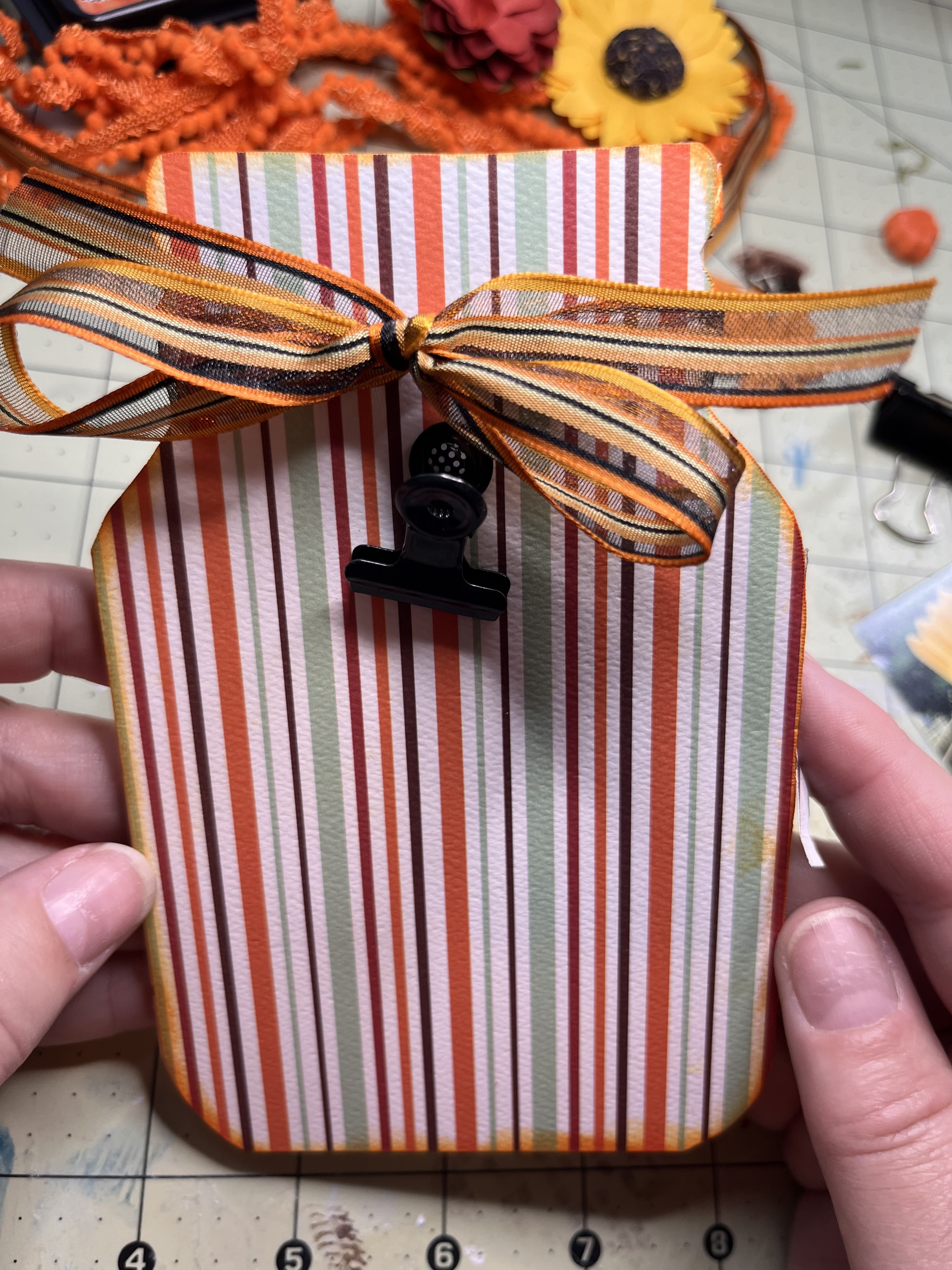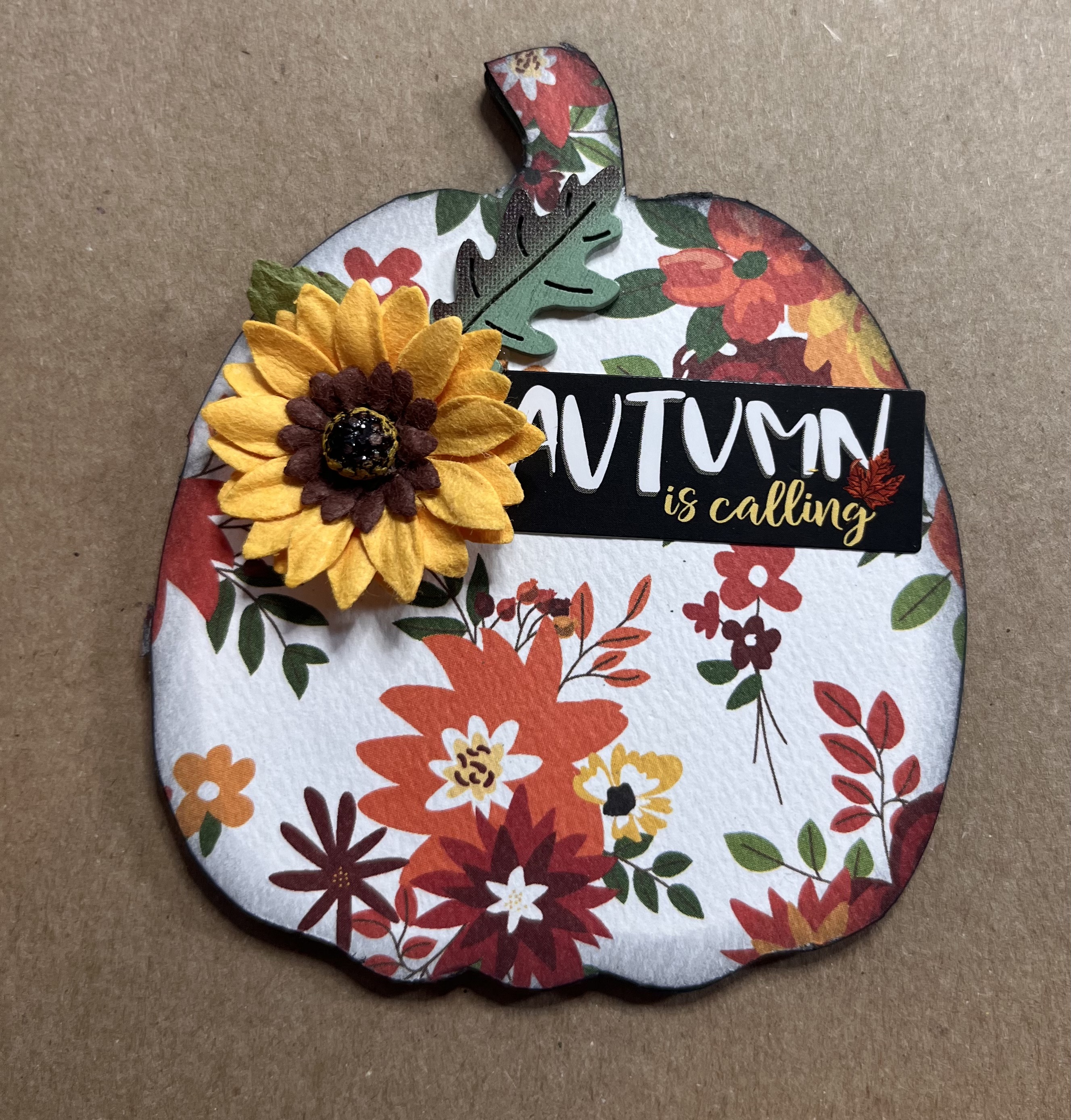 I had an extra pumpkin so I covered it with fall paper, cut around the edges with an exacto knife and smoothed the edges using a files. Finally I inked the edges and added some embellishments.
