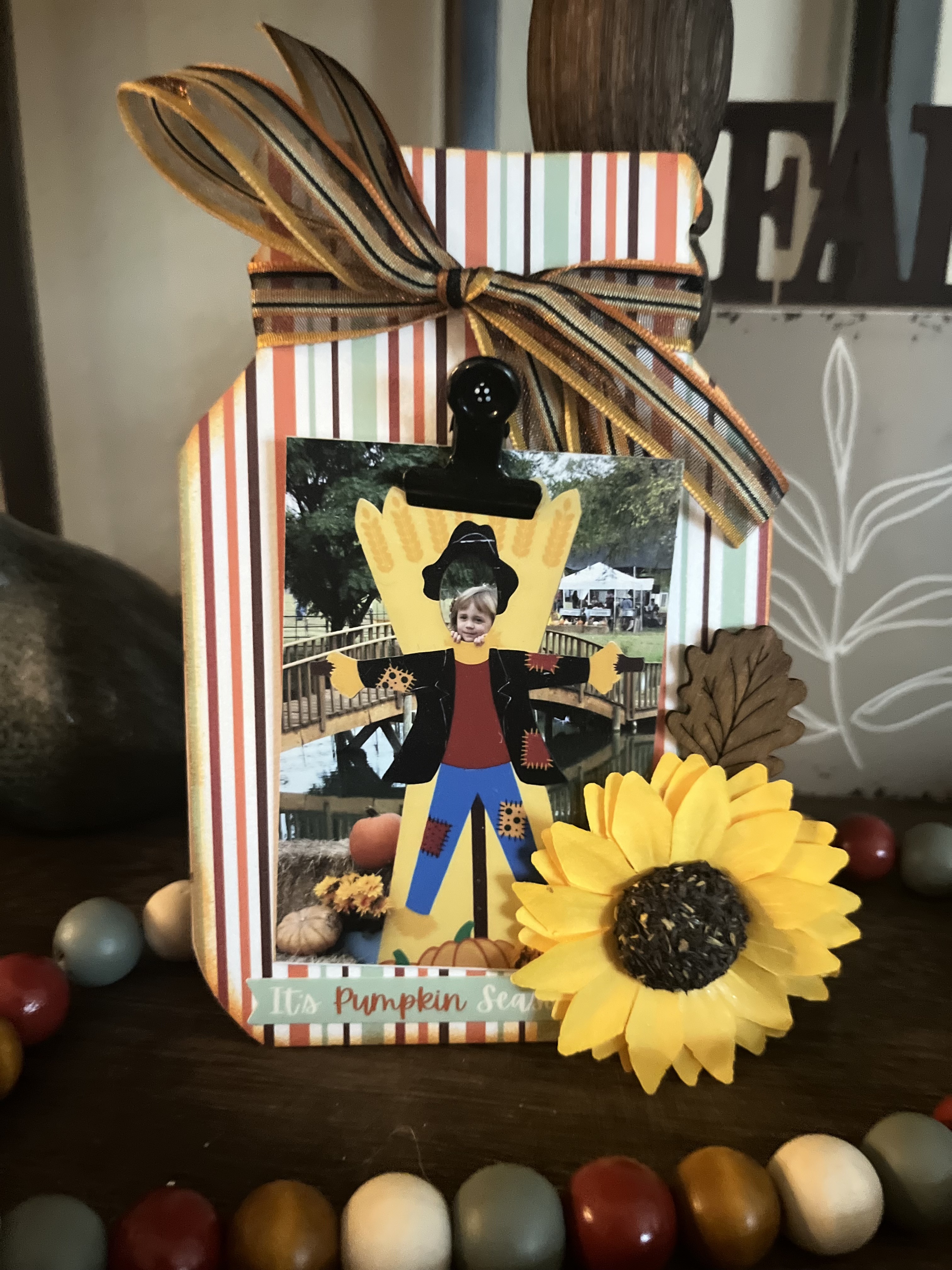 First I made this cute photo holder using the Small Mason jar ShiplapI traced the jar with the paper I wanted to use. I cut the paper, made a slit with the exacto knife where I wanted the brad and clamp to go and finally added the brad and clamp (important to do this before glueing the paper to the wood shape). I inked the edges using Marmalade by Tim Holtz. I then glued it to the jar, added some ribbon, stickers and a flower.