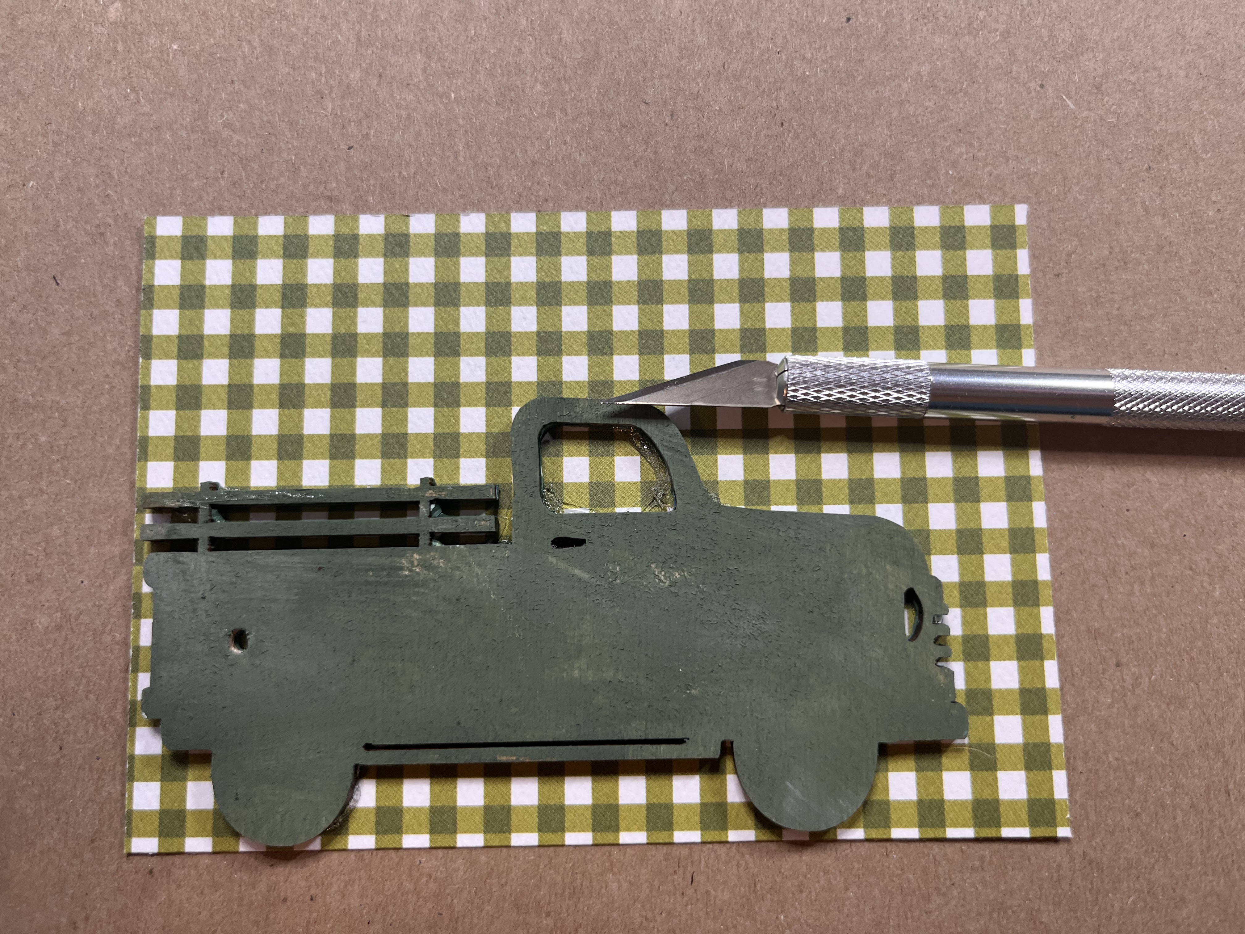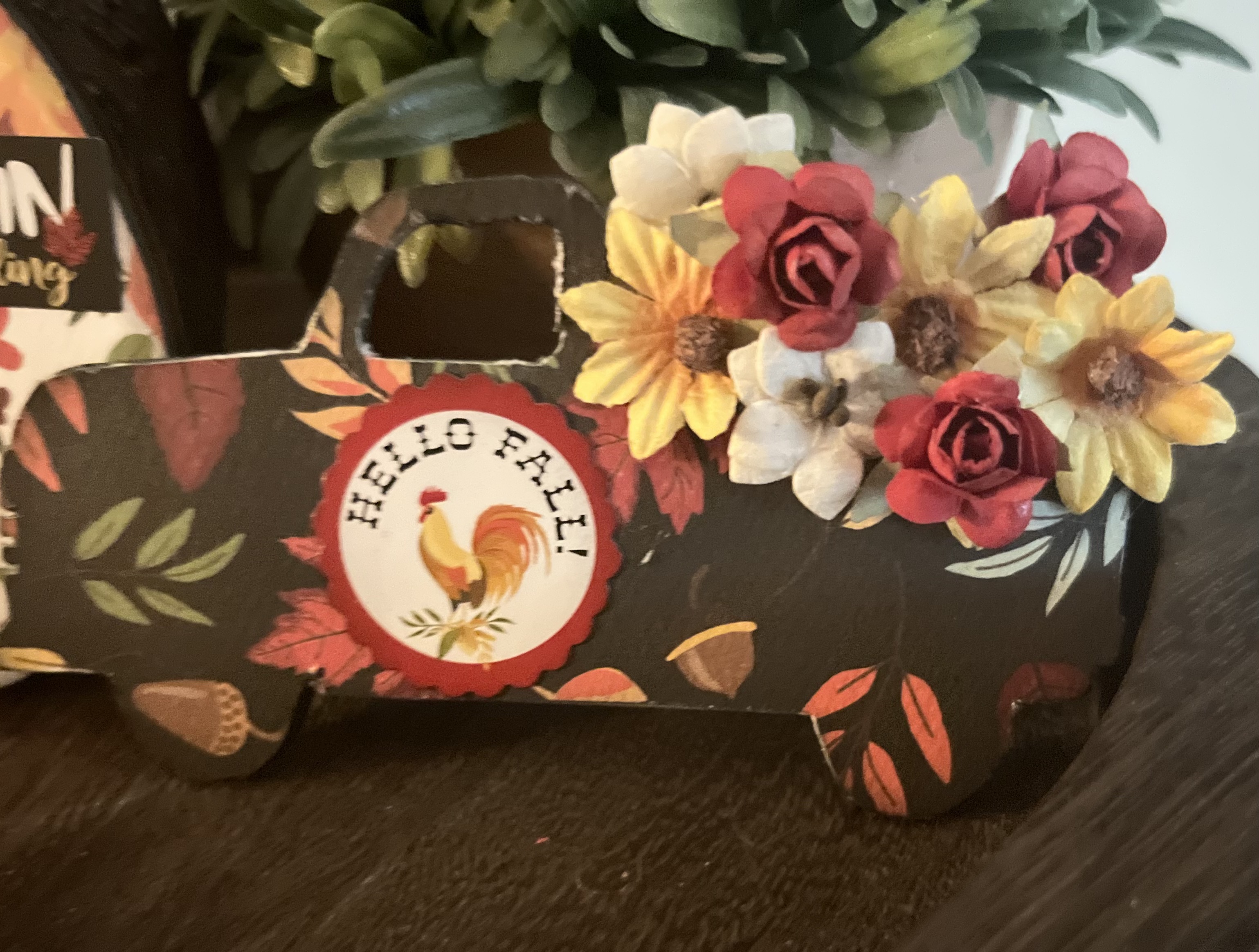 I took the truck from the Word n shape blessed truck painted it green on one side and covered the other side with fall paper. Using an exacto knife, I cut around the truck to get those tiny and tricky areas that scissors just can’t get to. I used a file to smooth out the outer edges and I inked the edges. Finally I embellished with flowers and a sticker.