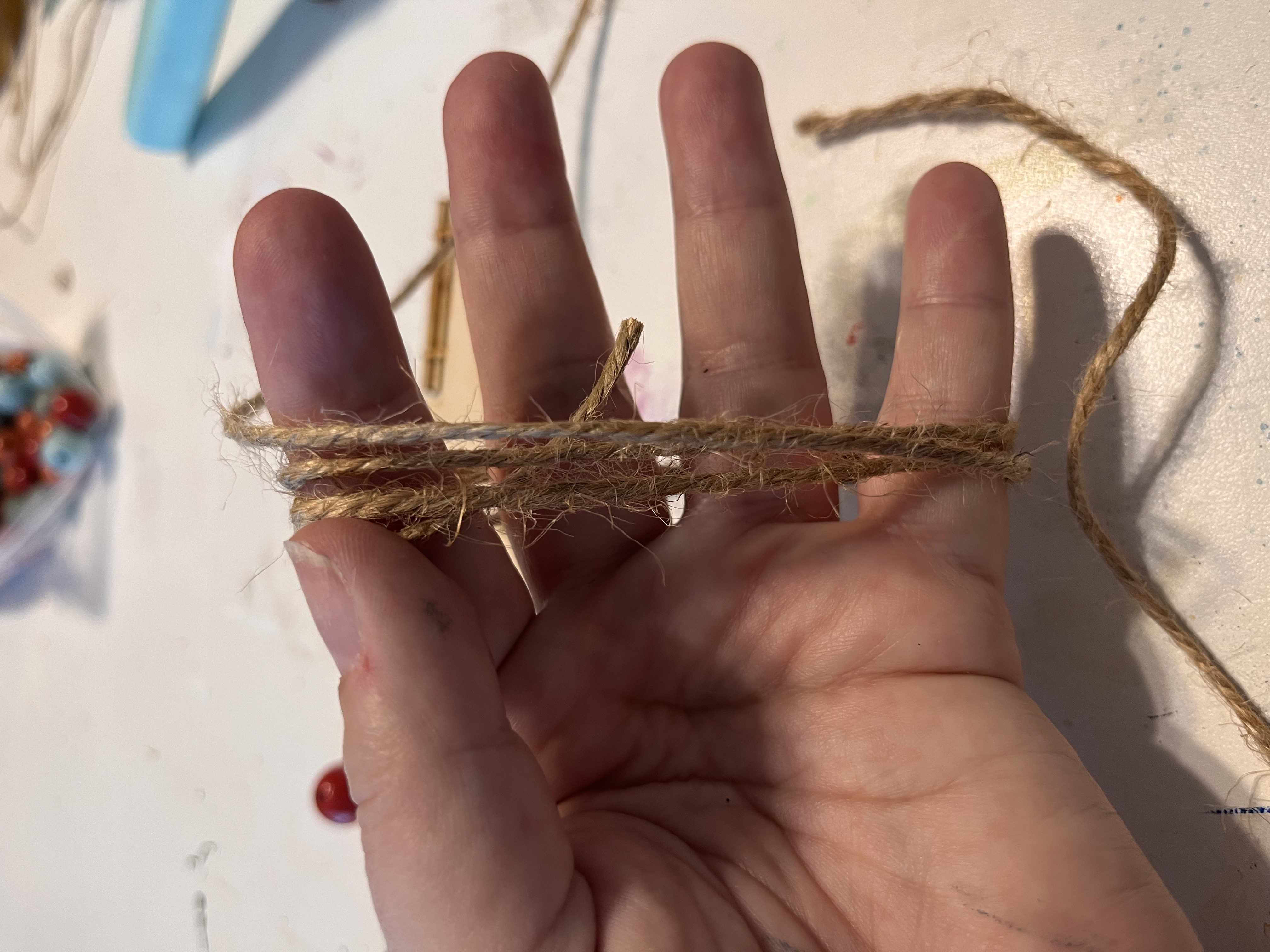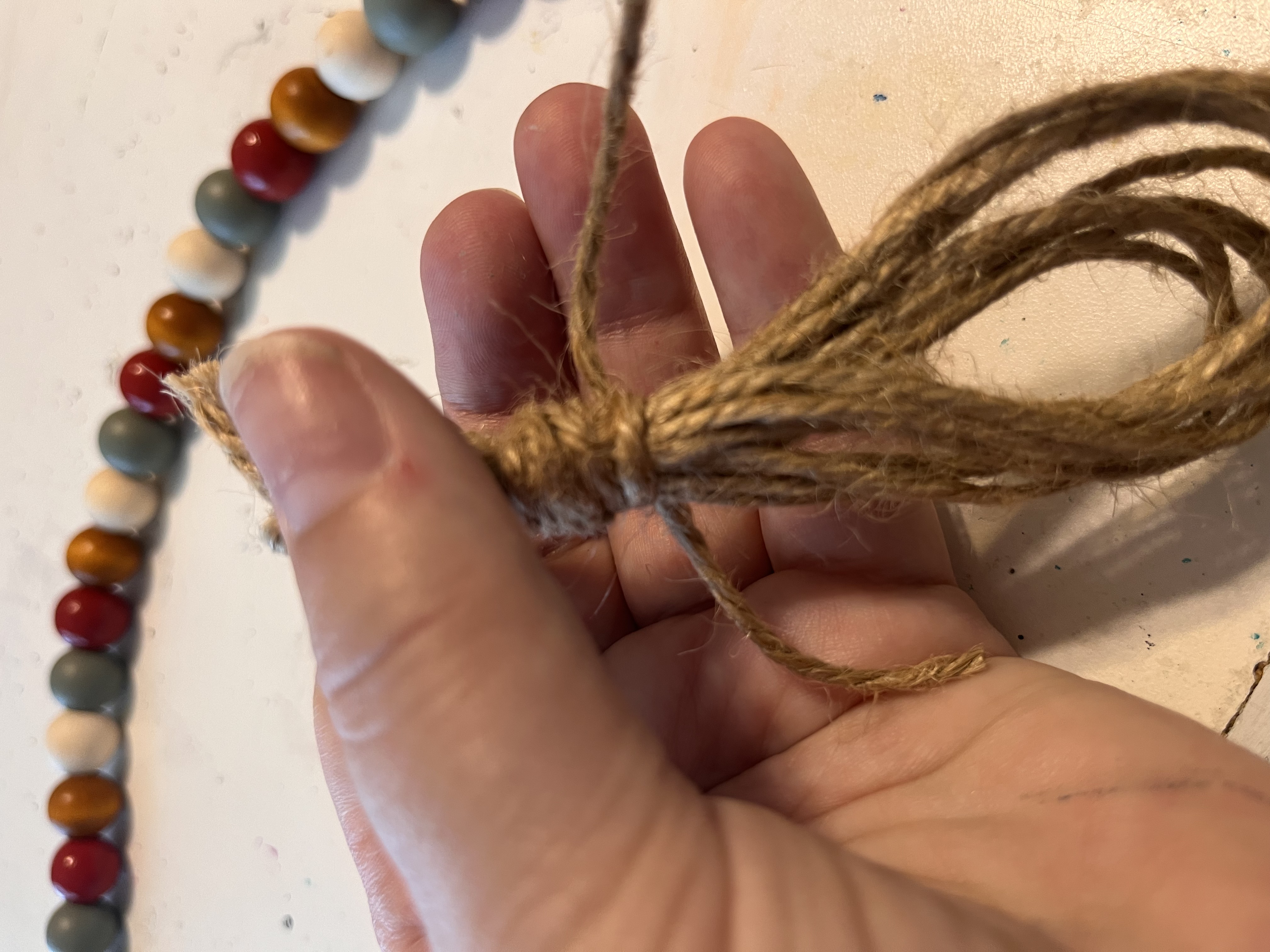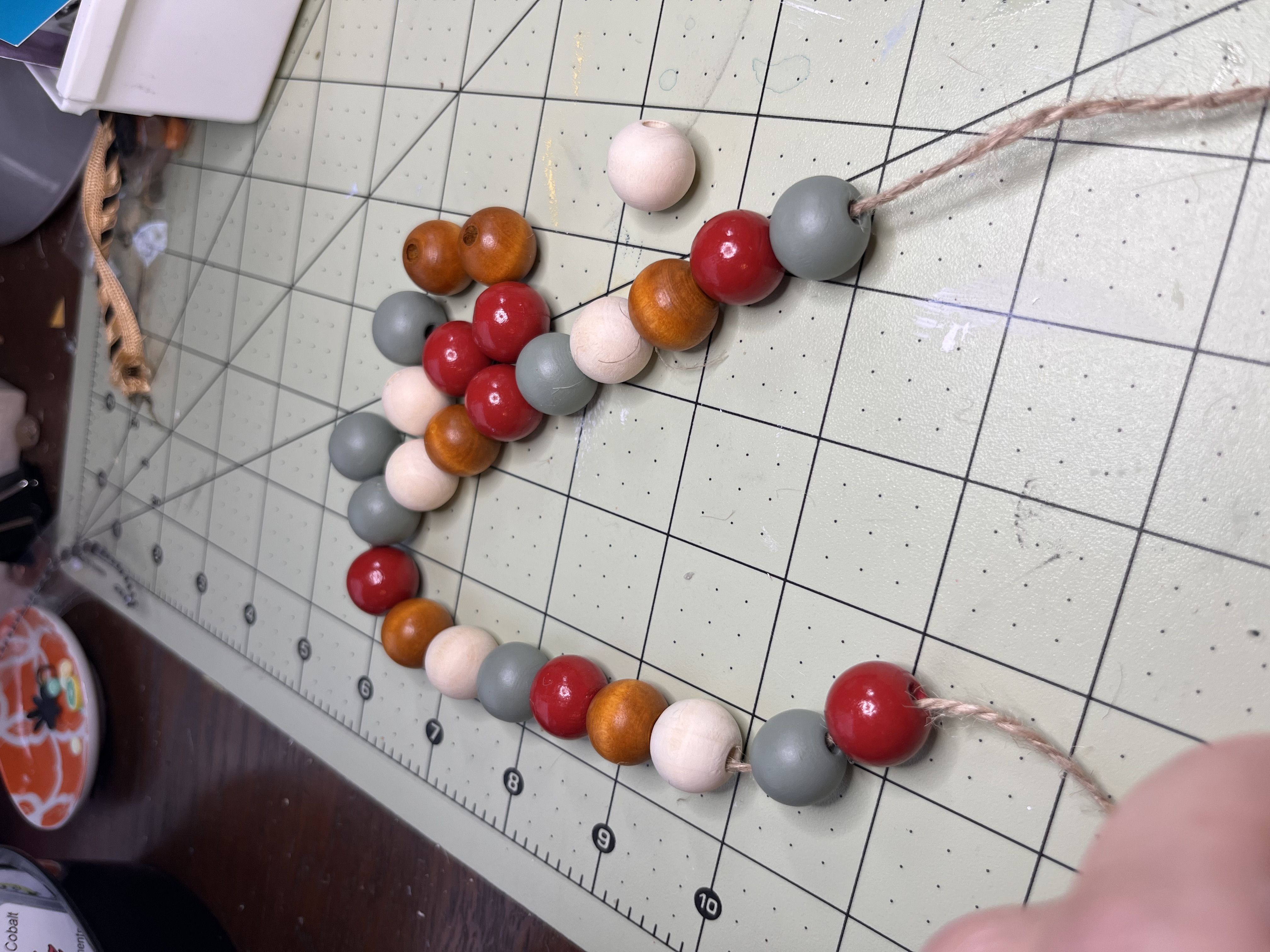 For the garland, I strung some beads together and made a tassel by wrapping twine around my fingers a few times, I tied one end with a piece of twine and cut the other end to create the tassel. Next using some fall print paper, I covered the pumpkin from the Wood n shape fall pumpkin and added a sticker and flower. I then punched a hole in the pumpkin and threaded the twine through the hole. Finally, I painted the wood “fall” word dark brown.