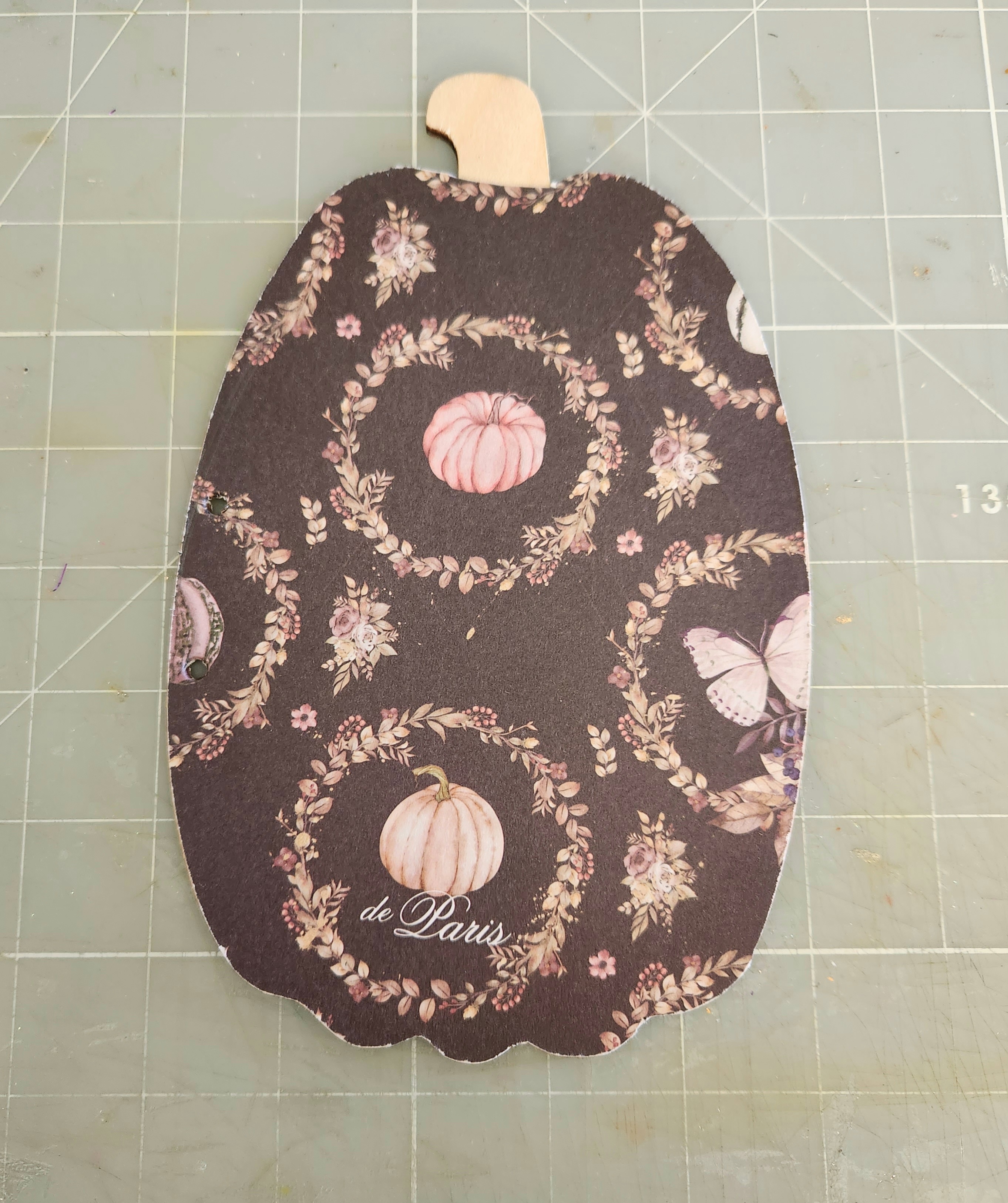 To begin I covered the front pumpkin wood piece with Finnibair Sparks Butterfly Spells paint. Let dry. The top stem I covered with a piece of scrap paper. Taking my xaco knife I trimmed away any excess paper and then using my Clear Scraps Sanding tool Click here I smoothed any rough edges.