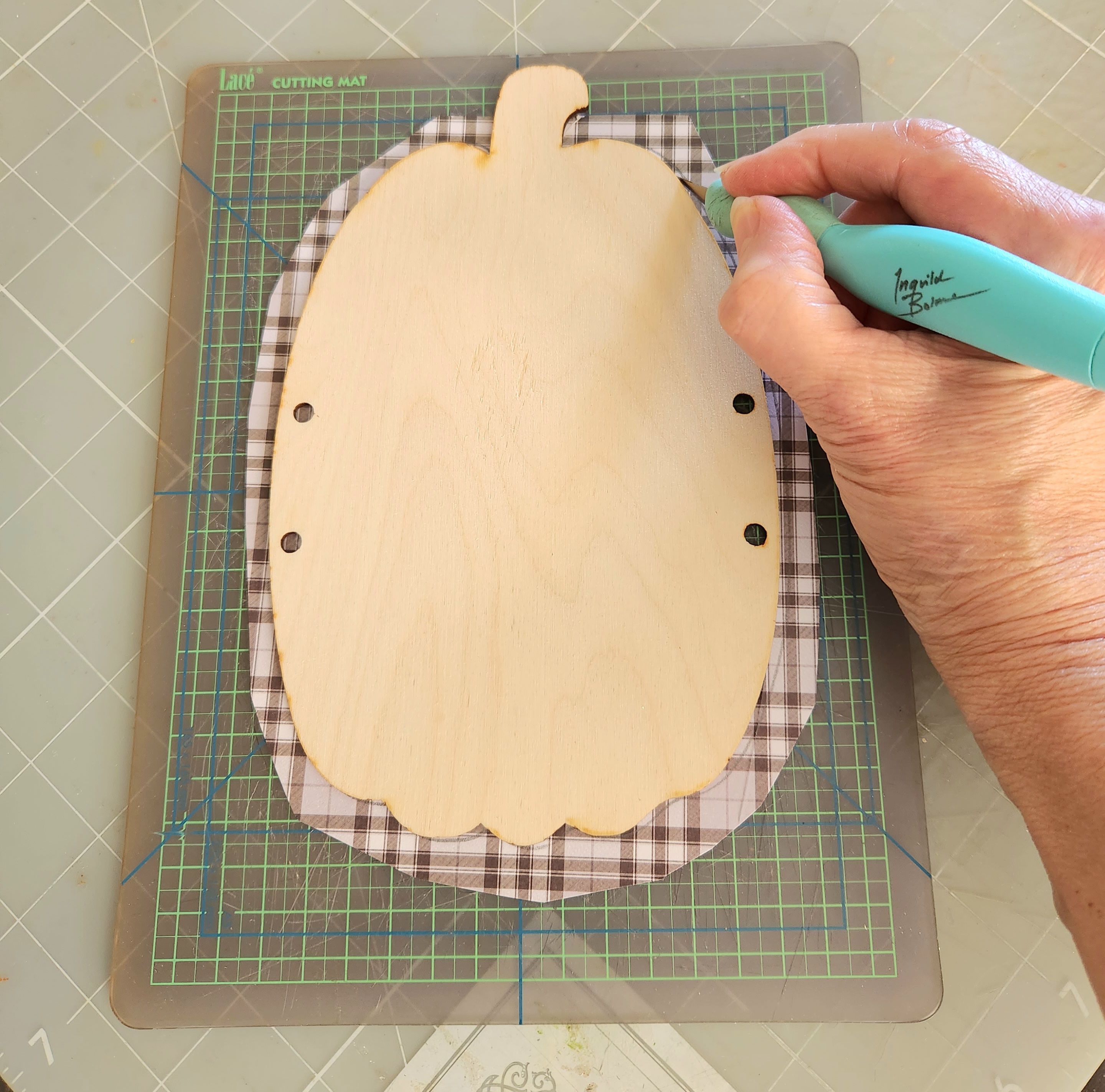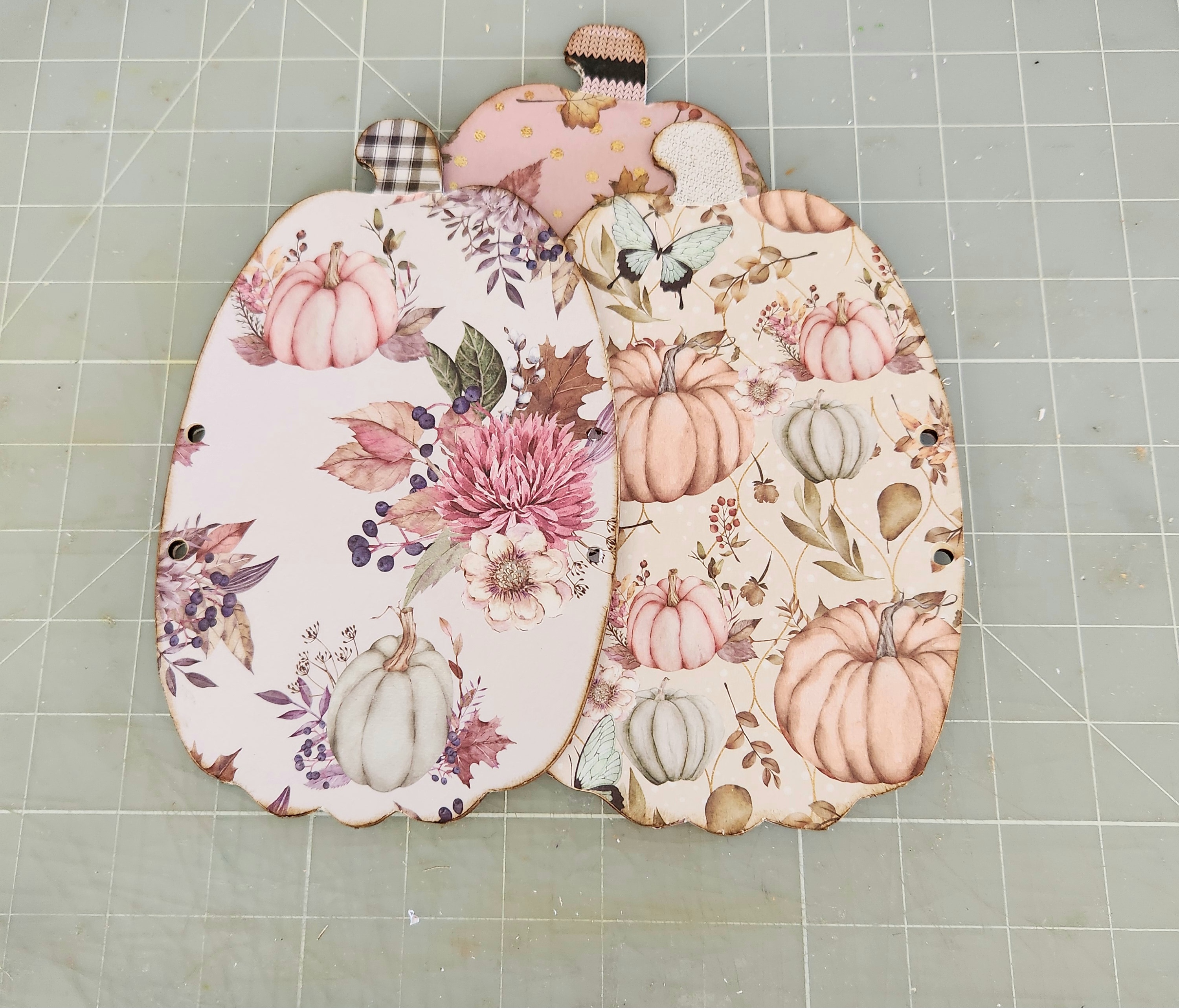 Set this aside for now. Now cover all your remaining wood pumpkin pieces with coordinating papers. Glue, trim and Distress along the edges as we previously did. Be sure to punch all your holes before gluing your paper down. I chose to apply Distress ink around the edges of each pumpkin wood shape! Here's a photo: