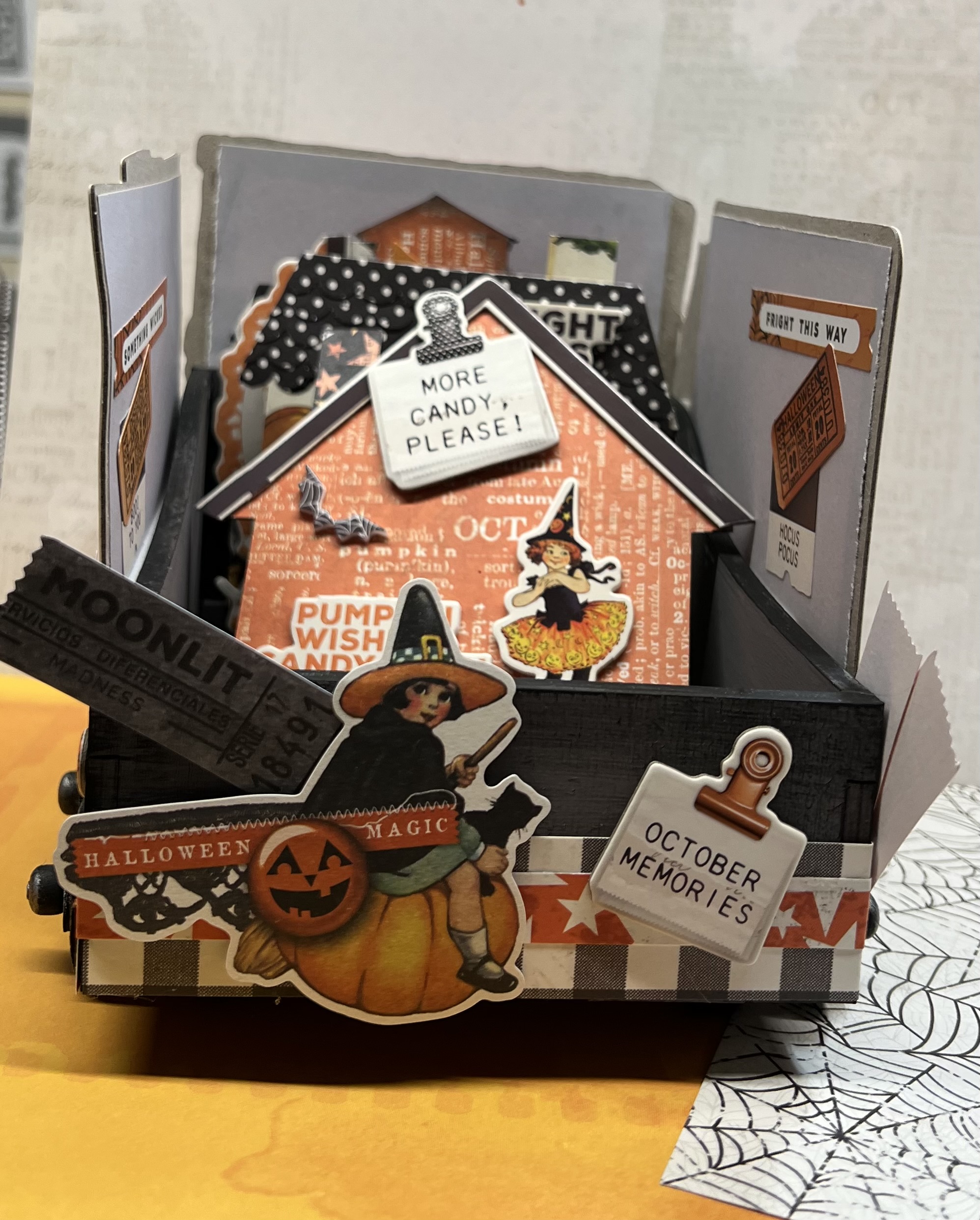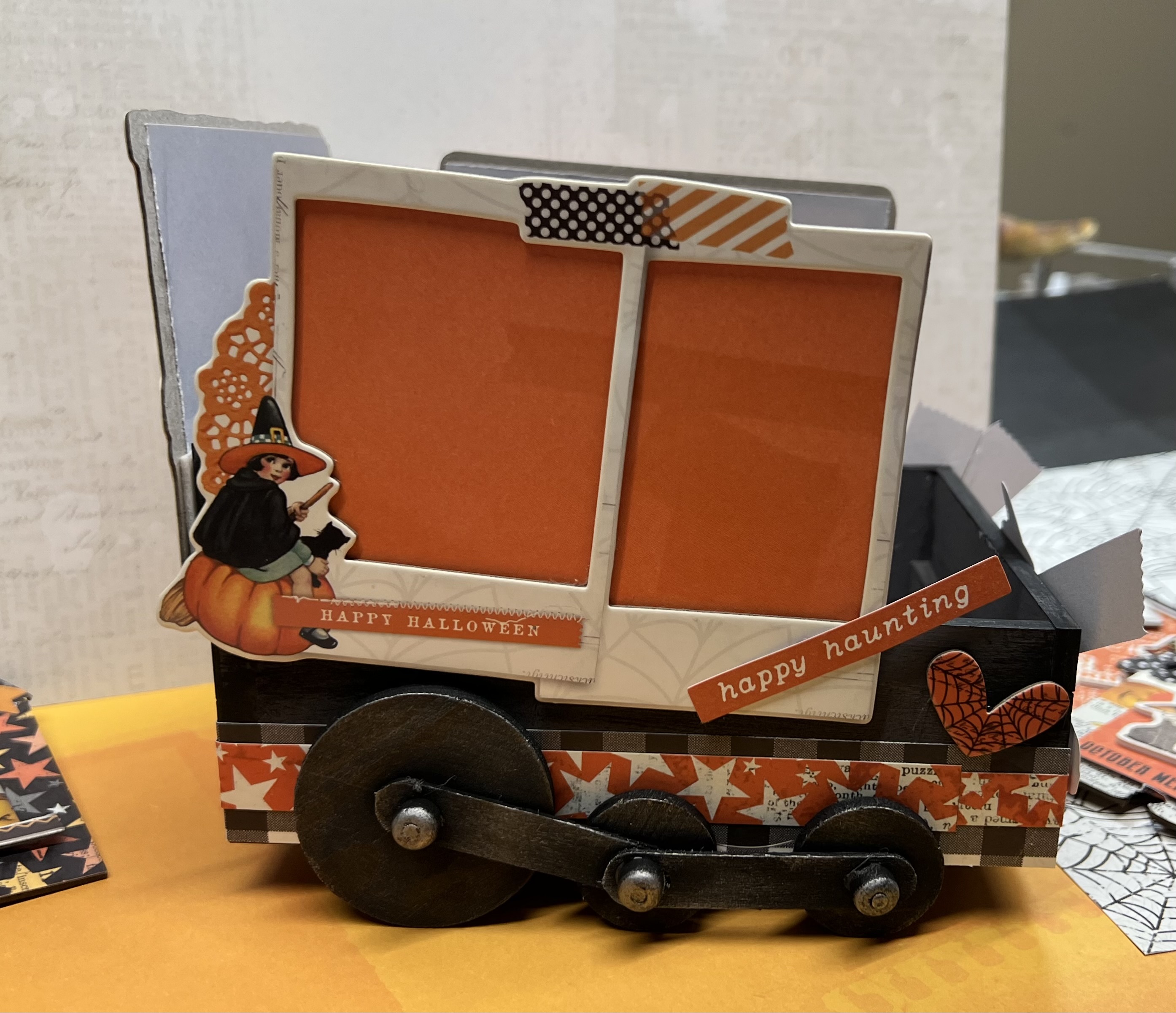 From a previous project, using the Clear Scraps house chipboard dividers that match my train. I added in the “haunted house” dividers and this train is ready to leave the station for Spookyville. Have fun creating a Halloween countdown calendar or scrap your favorite little goblins all dressed up for Halloween fun.
