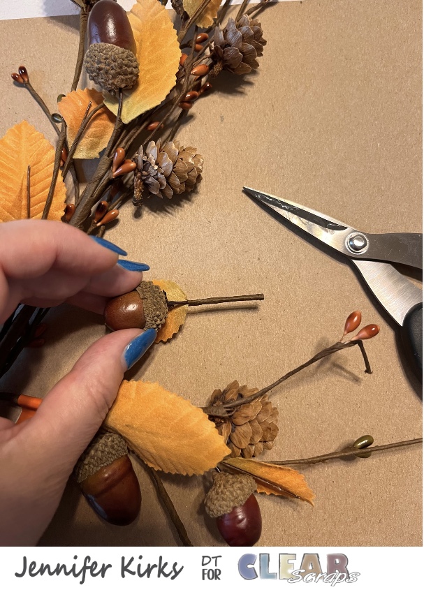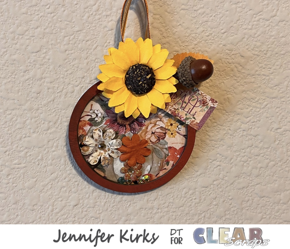 I felt that the ornament needed a little more pizzazz. So I went digging through my fall goodies and found that I had a few fall floral stems and I found one that had acorns on it. I decided cut one off and add it to the top of the ornament along with a sunflower and a sticker from the Hello Pumpkin collection. I glued the pieces down using 3 in 1 glue.
