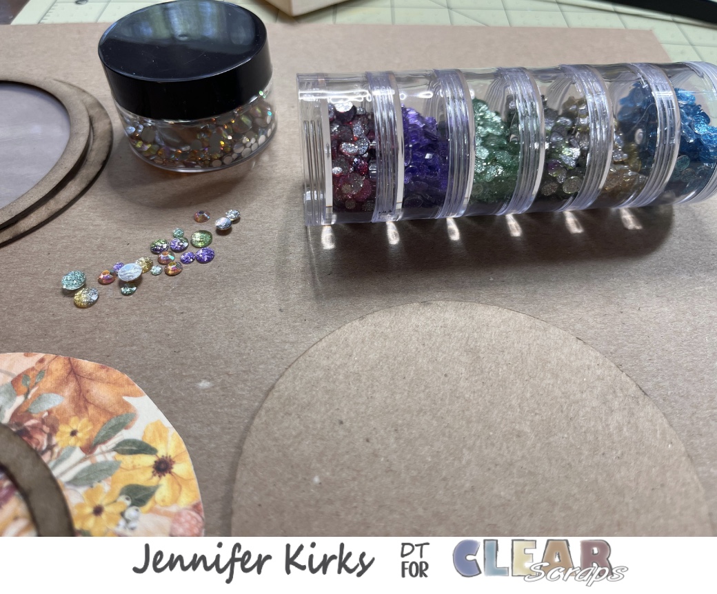Digging through my stash of sparkles, rhinestones and other shiny things, I chose a few colors and gathered 3-4 pieces of each color and placed them on top of the chipboard circle. I then stacked 2 of the rings on top of the circle ( I didn’t glue down yet), then placed the acrylic circle on top to make sure the sparkles, rhinestones etc weren’t too big. I wanted to make sure there was going to be an even layer so that the shaker is sealed and nothing falls out.