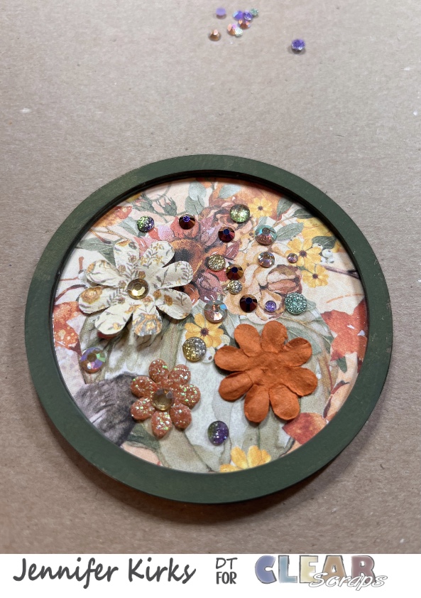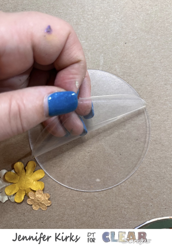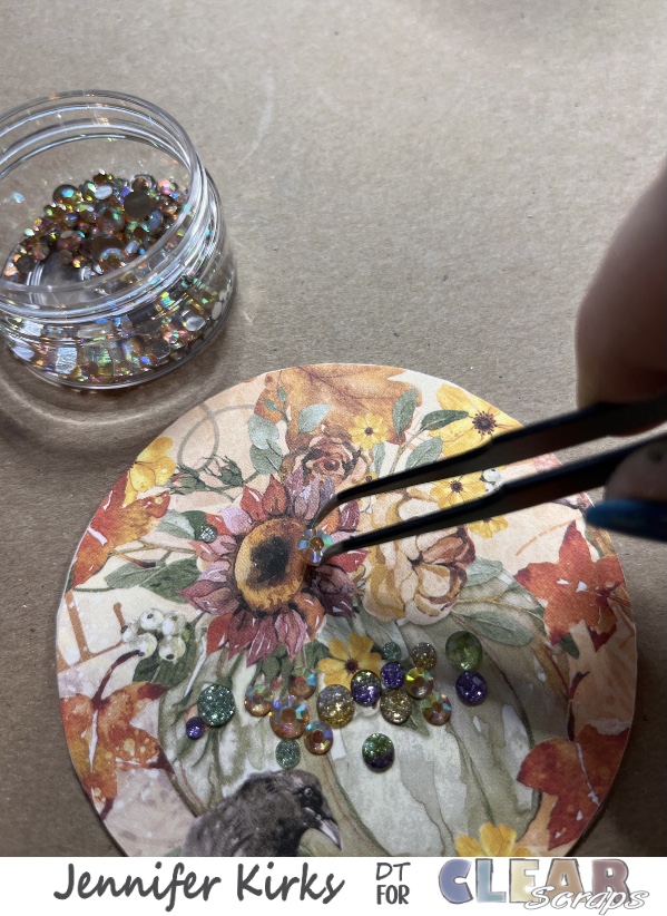 Once I had the rhinestones etc picked out, I stacked and glued 2 rings together. I added in a couple of flowers before adding the acrylic to the ornament. Then I removed the film from the acrylic piece (very important step to not skip) and glued it to the top of the 2 circles. Finally I glued the last circle on top of the acrylic piece.