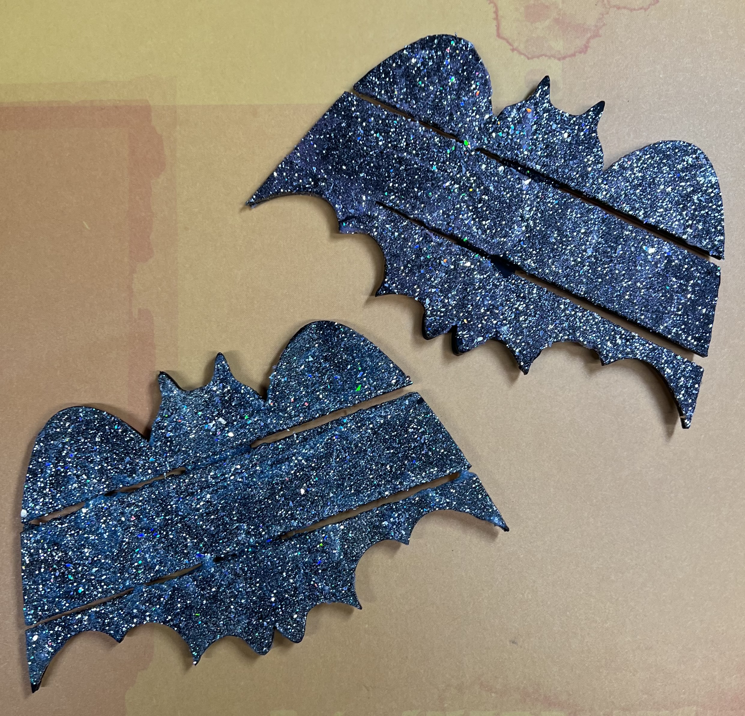 First up are my sparkly bats. I painted them black with acrylic paint and let that dry completely. Next, I used a mixed media soft gloss gel (Prima) as the medium to get the embossing powder to stick. I used a Wow embossing powder that is all the glitter and shine because I want my bats to stand out!