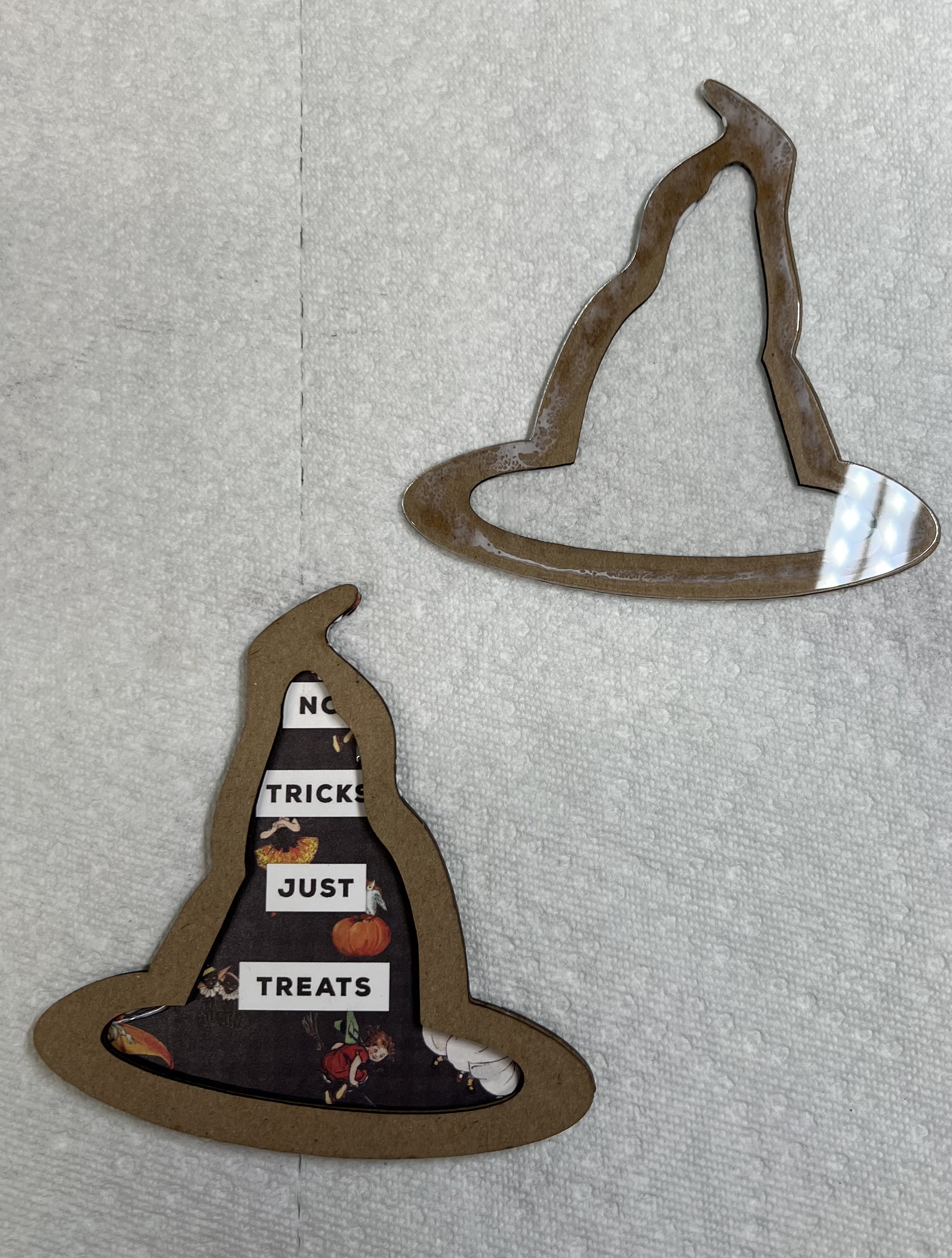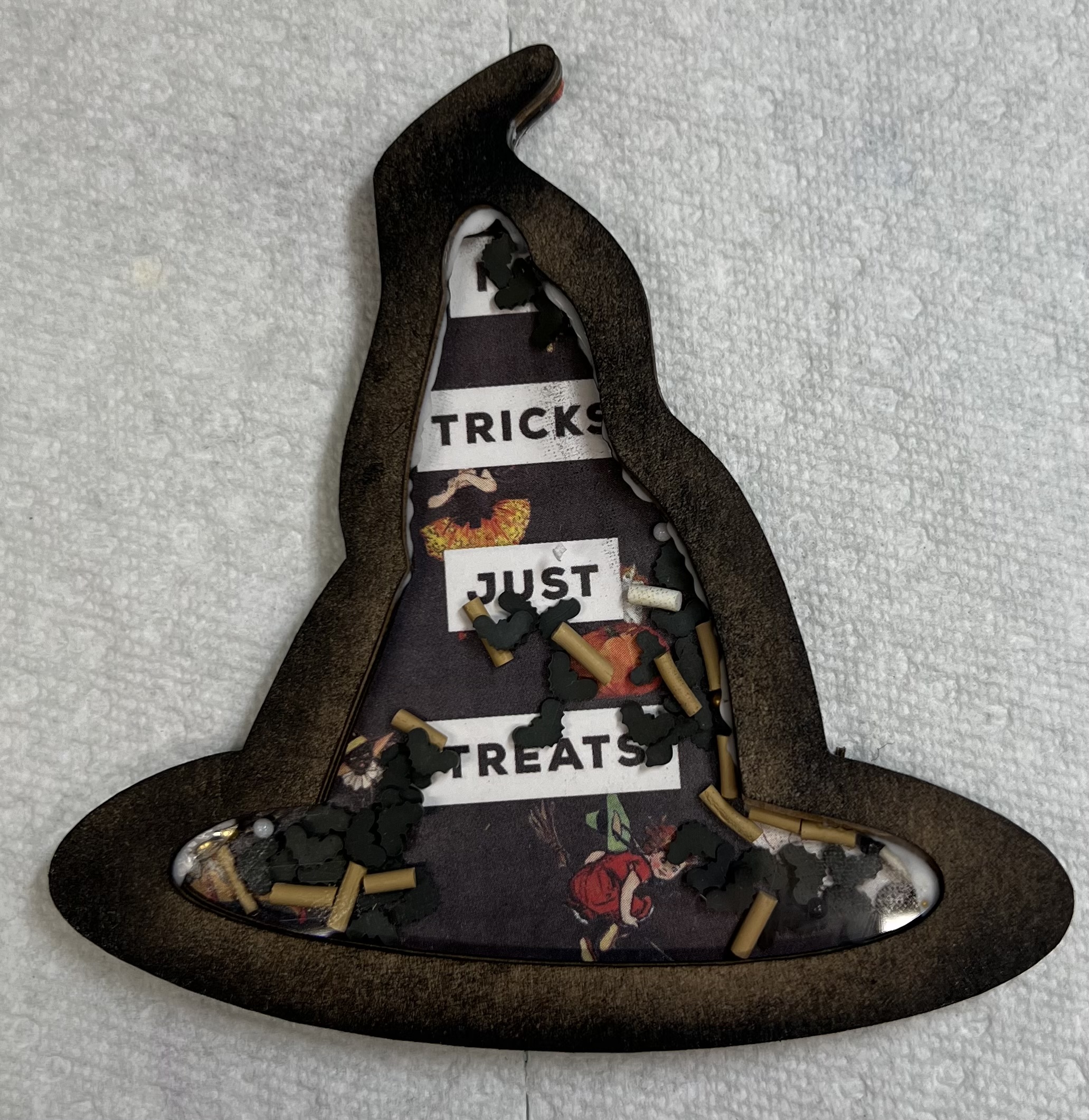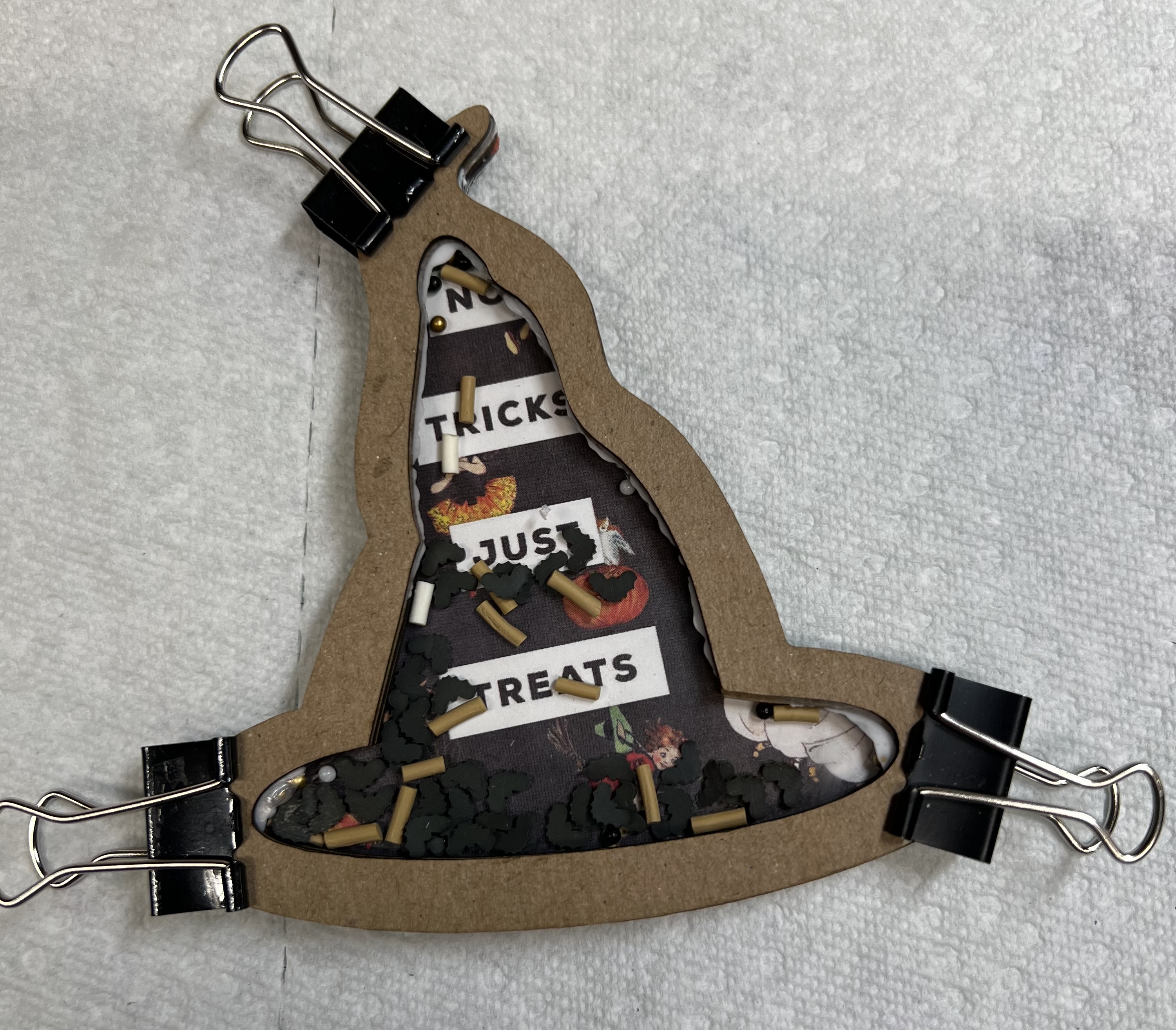 Now for the witch hat shaker. I used a 3×4 decorative paper with saying and glued to the base of the shaker. I trimmed the edges with a craft knife. Next, I glued two of the trim pieces to my base and set aside. I took the acrylic piece and removed the plastic film. I glued the remaining trim piece to the acrylic piece and let dry. I added in the super cute Halloween shaker bits (look closely there are little bats!). Glue together and I use binder clips to hold everything together to dry.