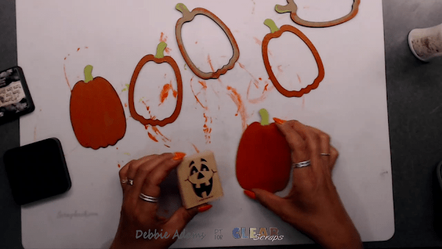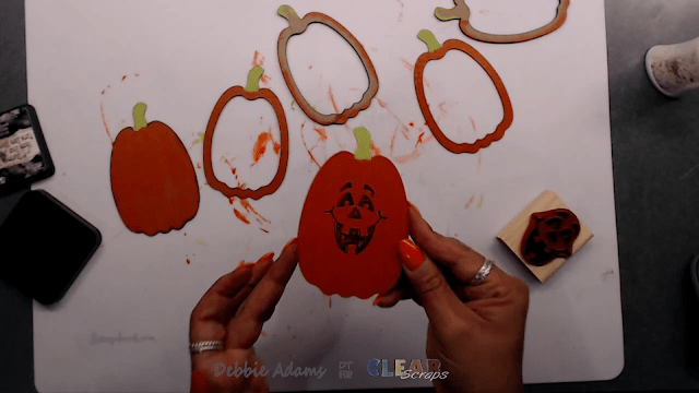 Next I grabbed a funny face stamp from my stash and stamped it on both bottom pumpkin pieces.