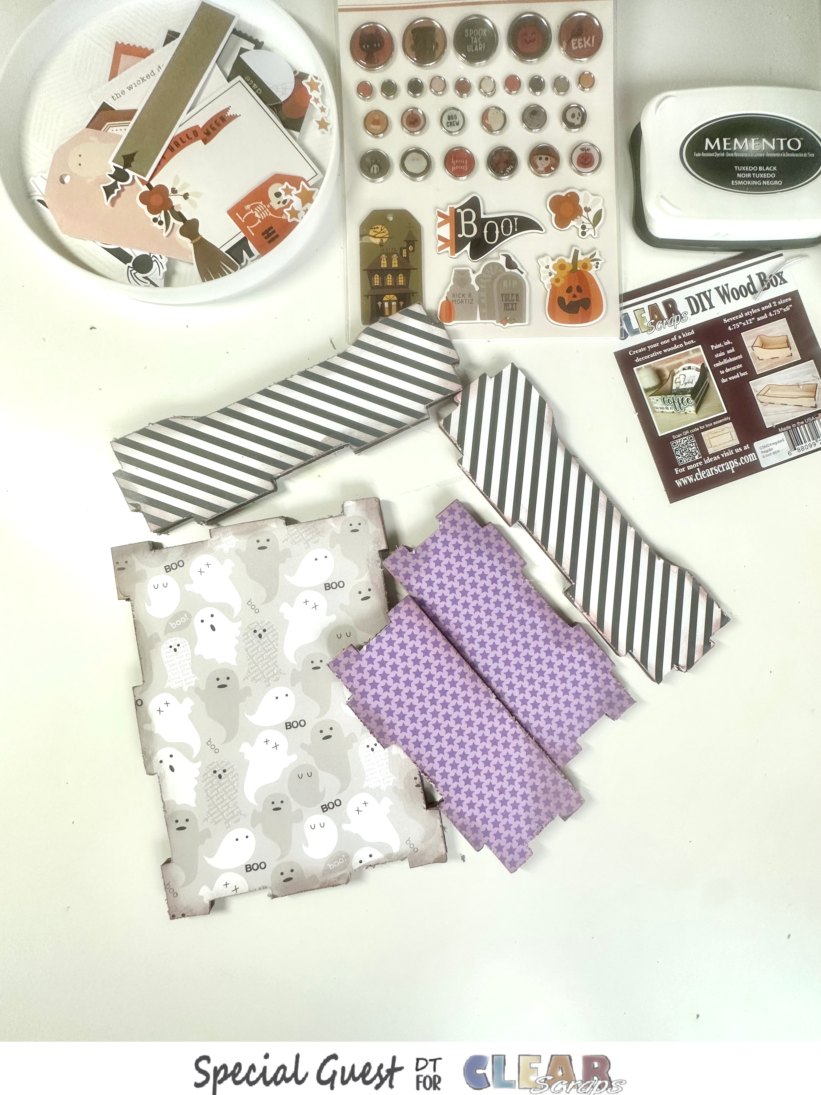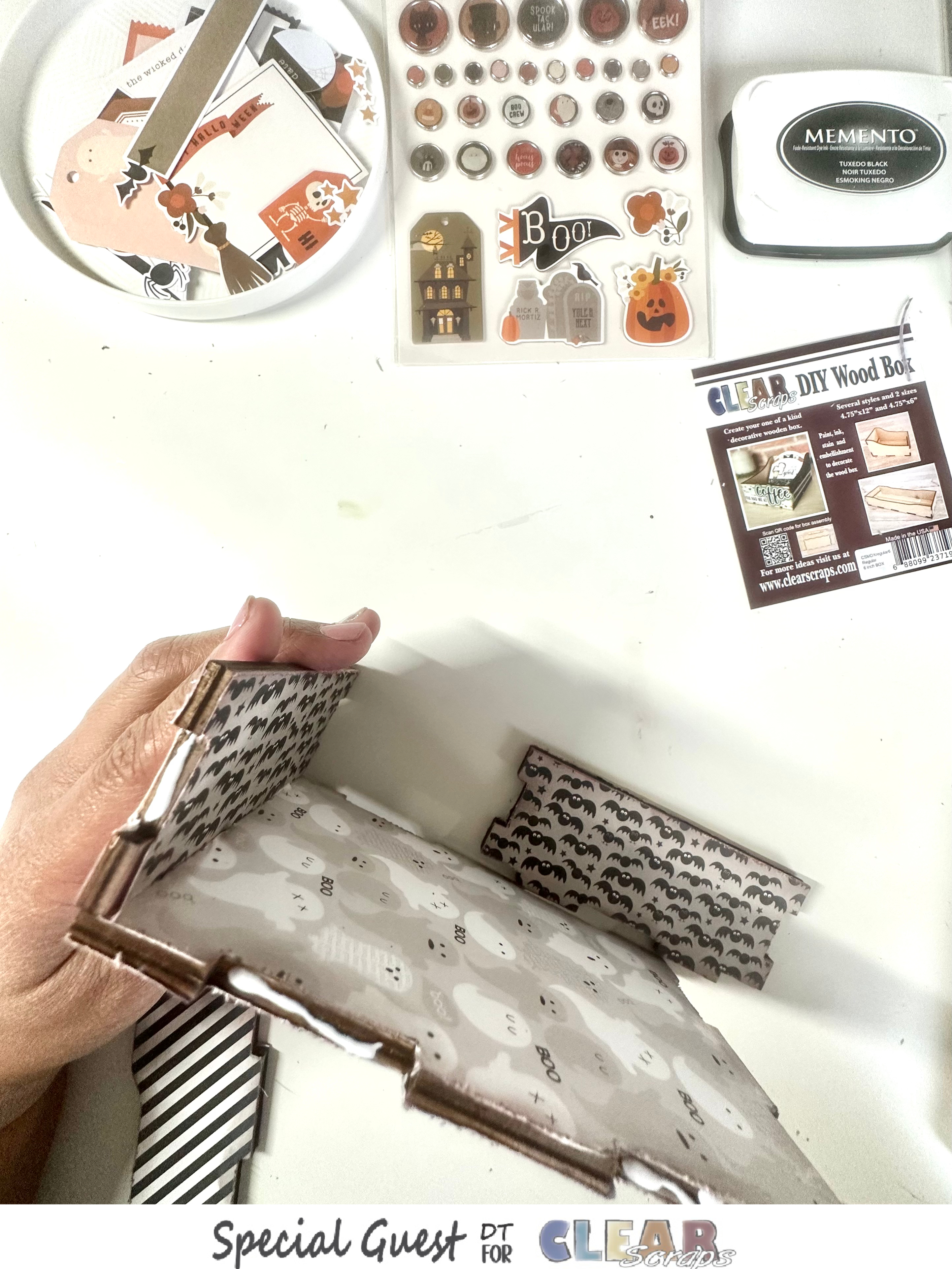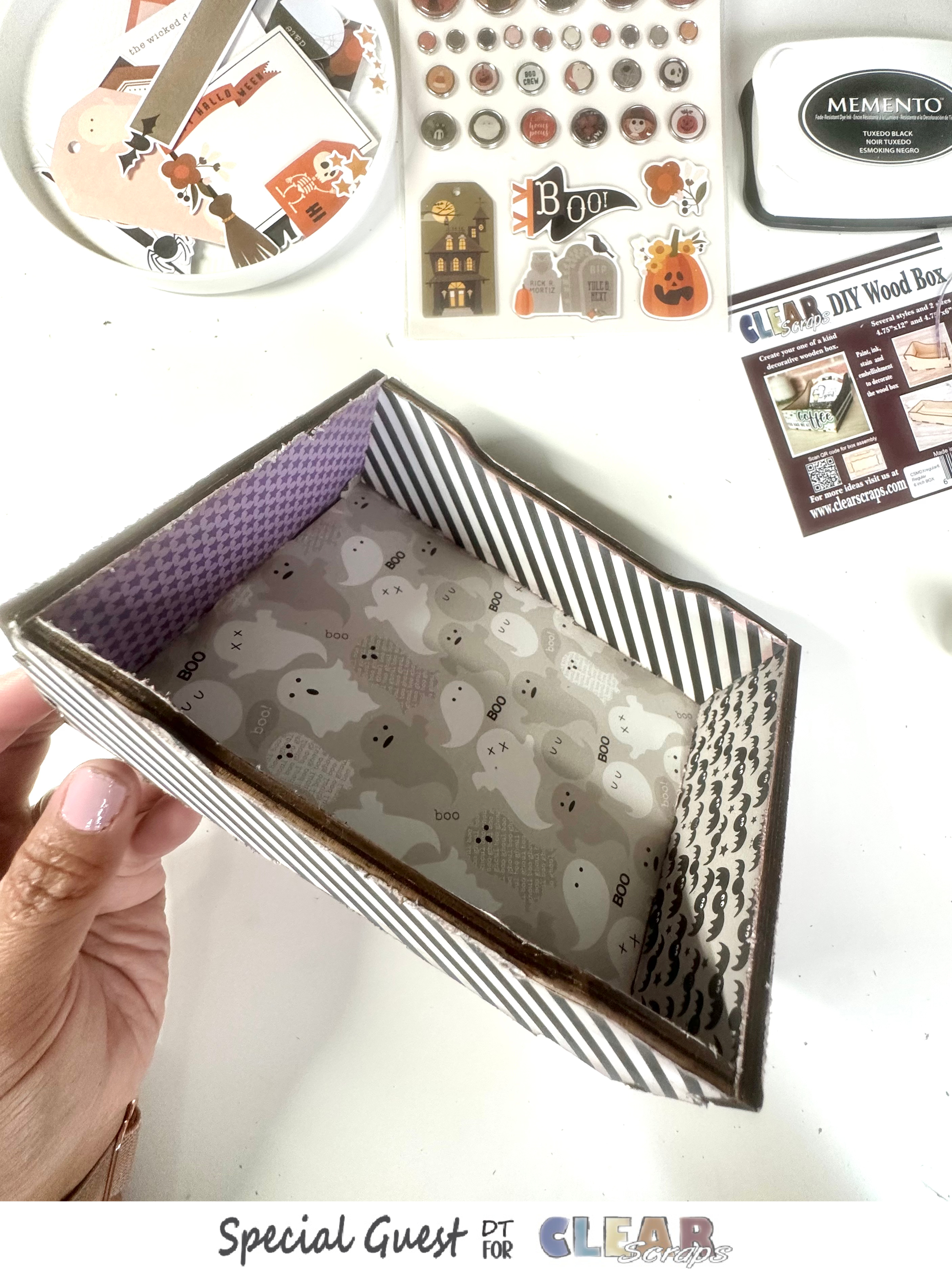 I embellished all the blank sides of the Regular DIY wood box with an assortment of Halloween patterned papers.
