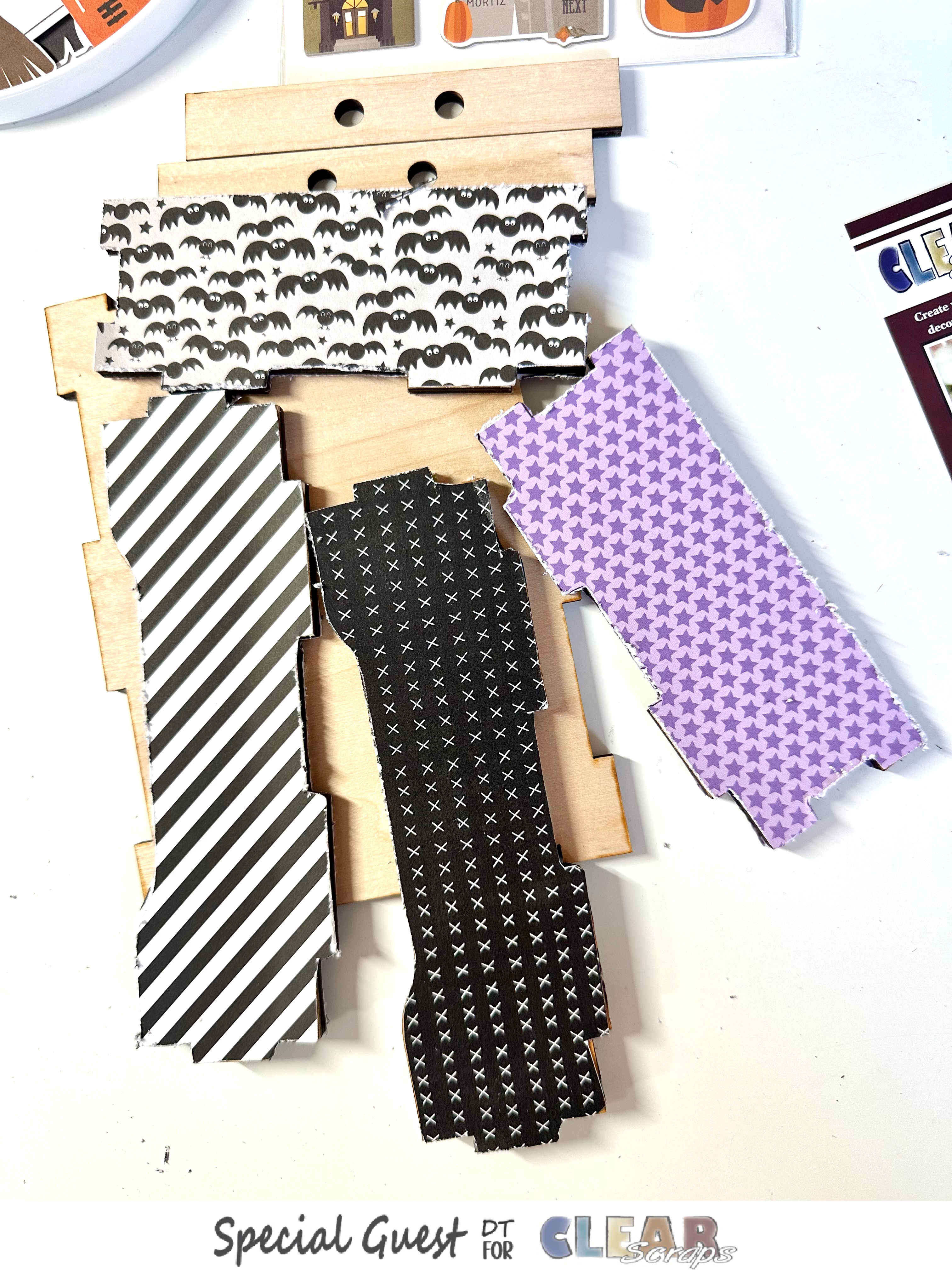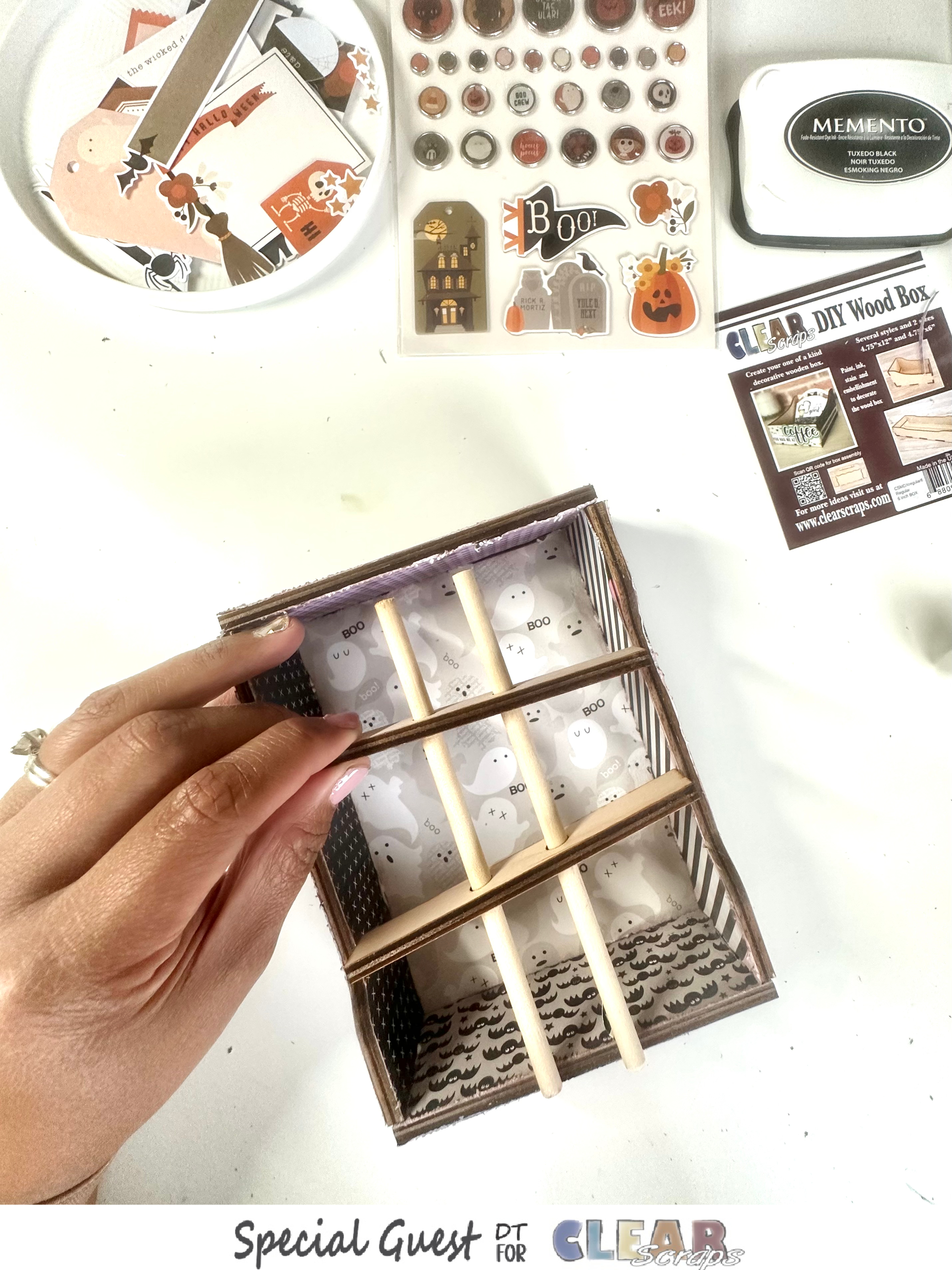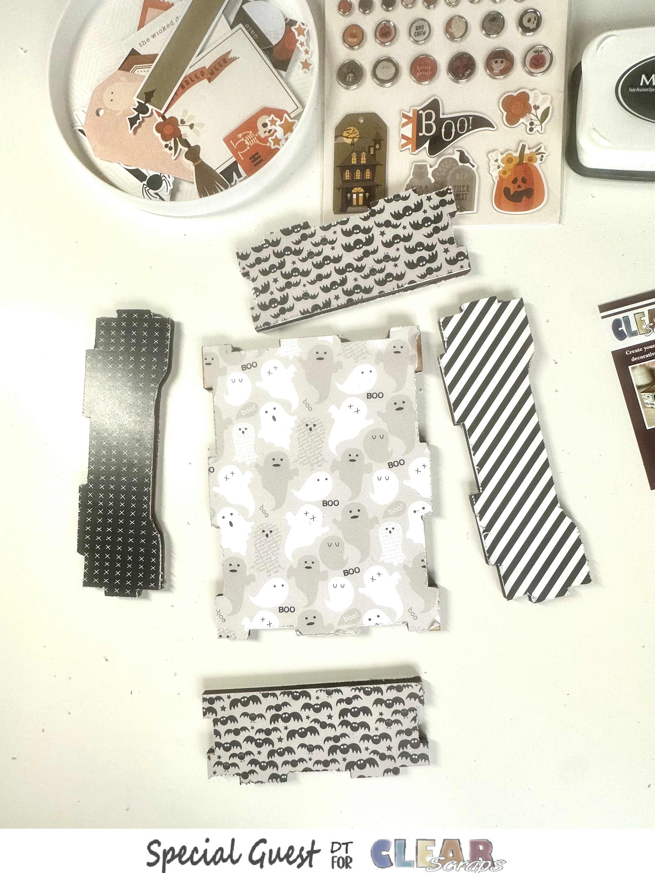 I embellished all the blank sides of the Regular DIY wood box with an assortment of Halloween patterned papers.