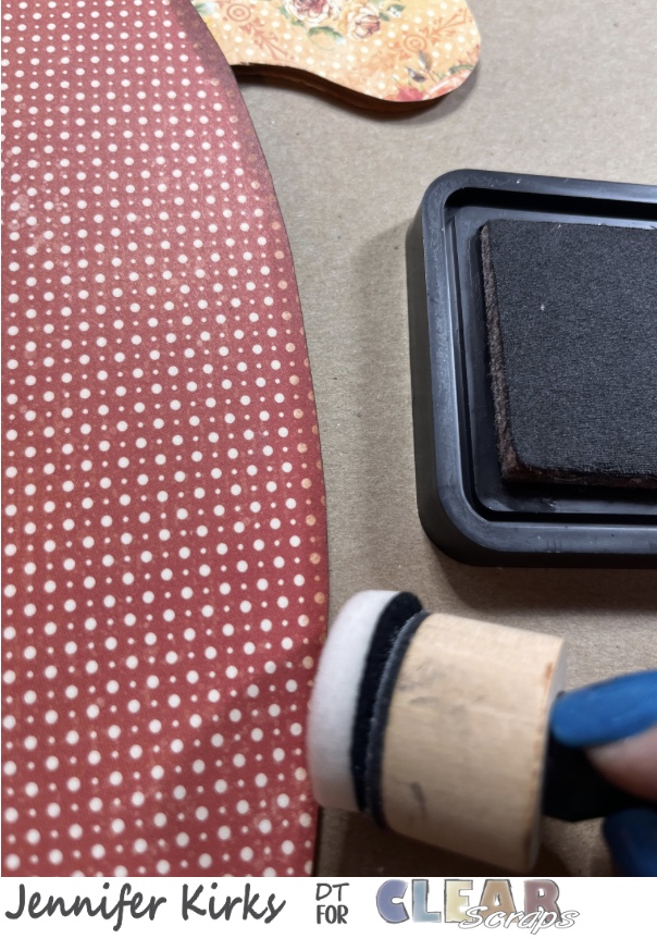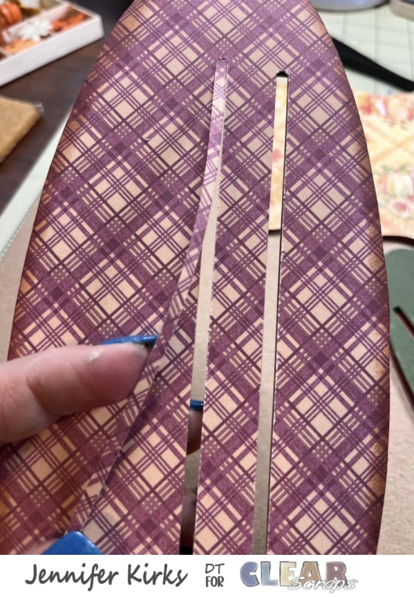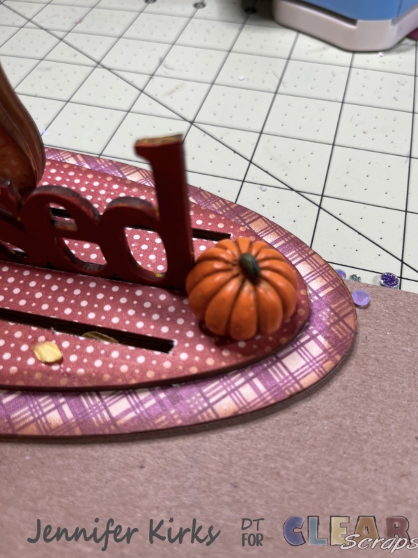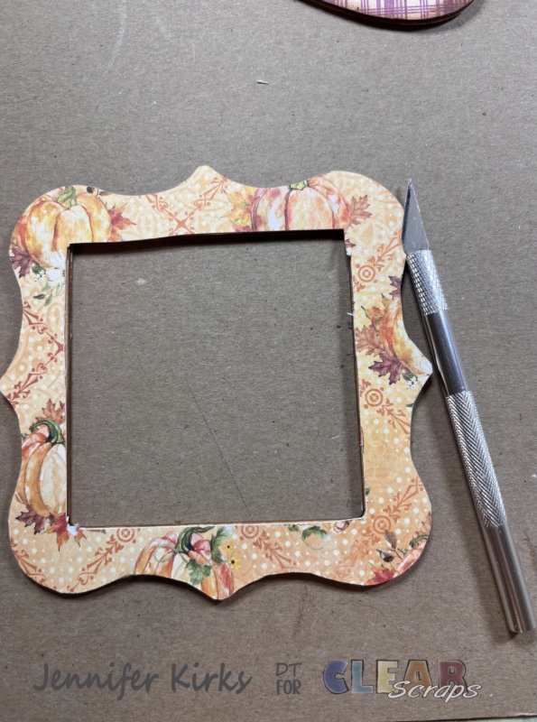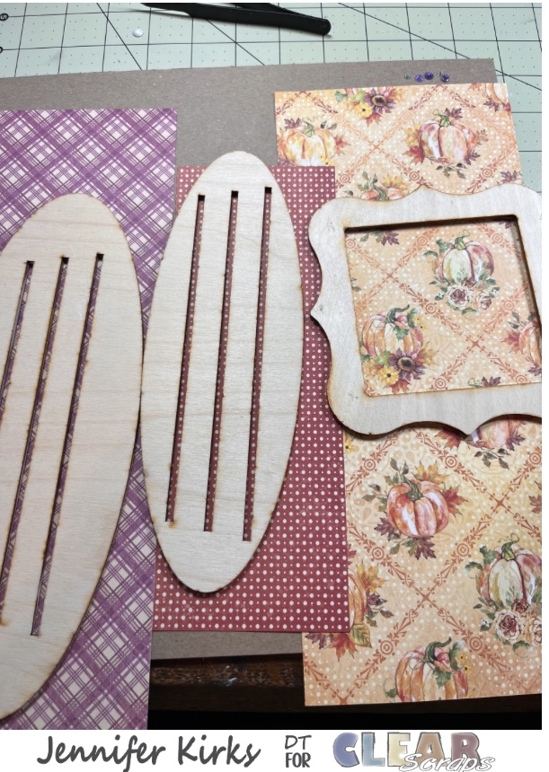 I gathered the papers I wanted to use for the bases and the frame from the Hello Pumpkin collection. I traced around the wood pieces, cut out and then glued the paper to the wood pieces.