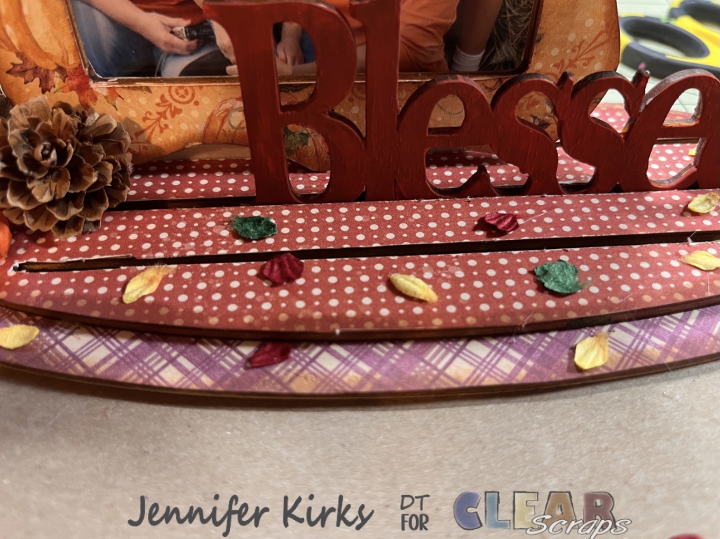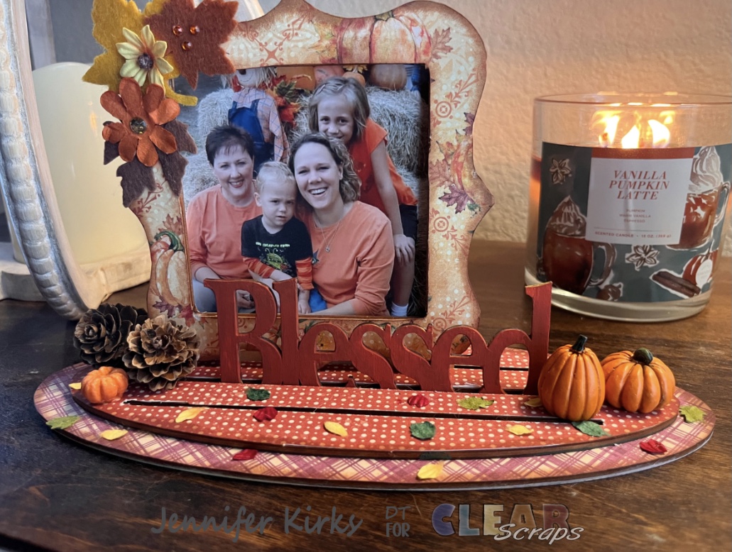 I just love these wood deco frames! The possibilities are endless and I love being able to make it my own. I made a fall frame using the scalloped wood deco frame found here Deco frame , the “blessed” from the word and shape found here Blessed – truck word n shape and the Graphic 45 “Hello Pumpkin”paper collection.