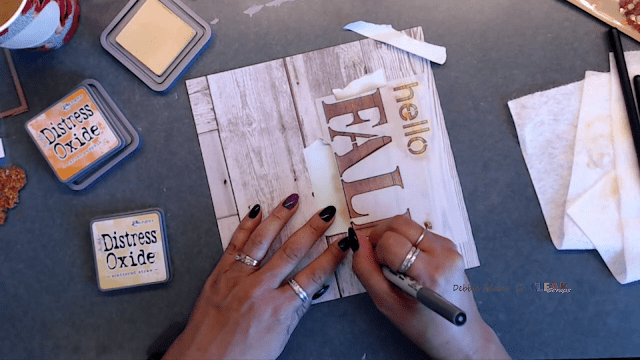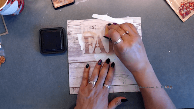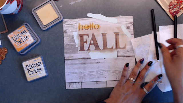 Hello Fall Stencil" from Clear Scraps. I saw this in the shop and had to get it. For the FALL portion of the stencil I used TH Distress Ink Vintage Photo.