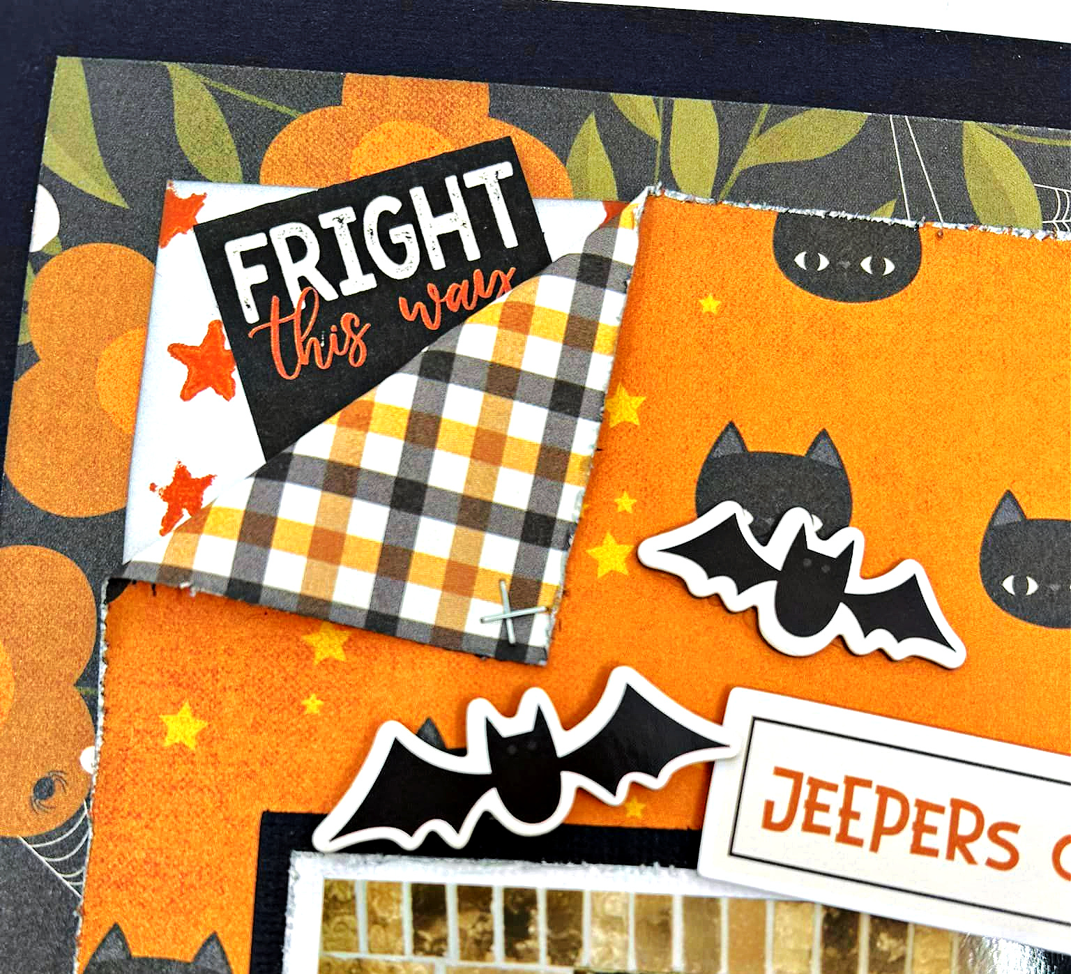 The frame was painted with black paint and some cute Halloween sequins were used to fill the shaker. After the top frame was glued down, a few stickers were added to the top to create some interesting layers! The turned back corners also give the LO a little extra something and the Clear Scraps 4×6 Stars stencil made the perfect background for the little pieces peeking out!