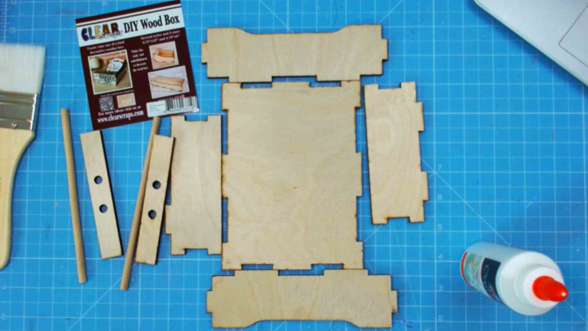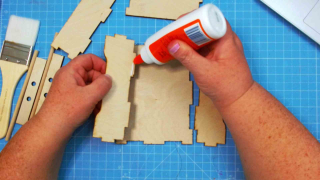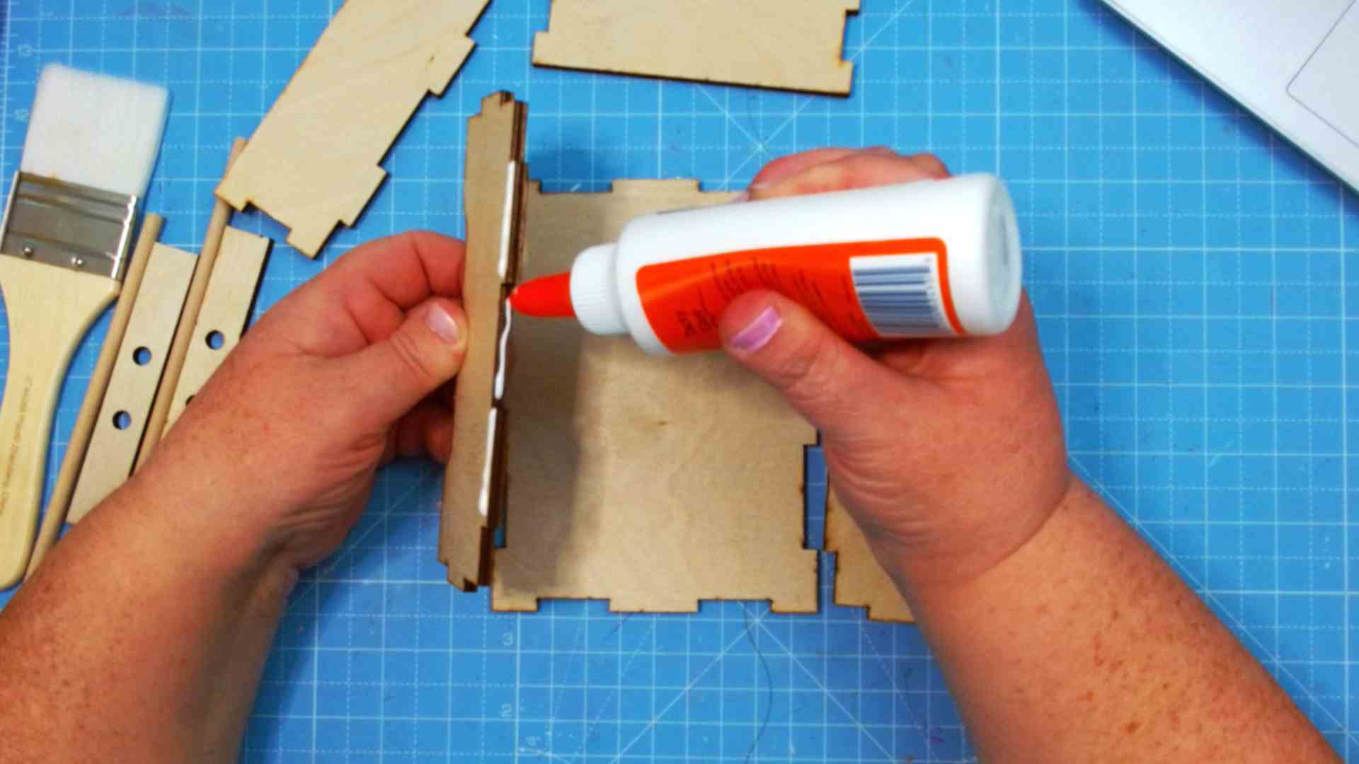 After I have grabbed my crafty supplies, I line up the wooden pieces where they need to be attached to the base of the box. Crafter tip: Be sure to fit everything into the slots before adding glue to see which direction fits best. Usually, you will feel or hear a click, when you slide them into the cut-out grooves. That's when you know you've chosen the best side or direction to place them. Next, I place a line of glue on each tab and underneath the open slots. See images below.
