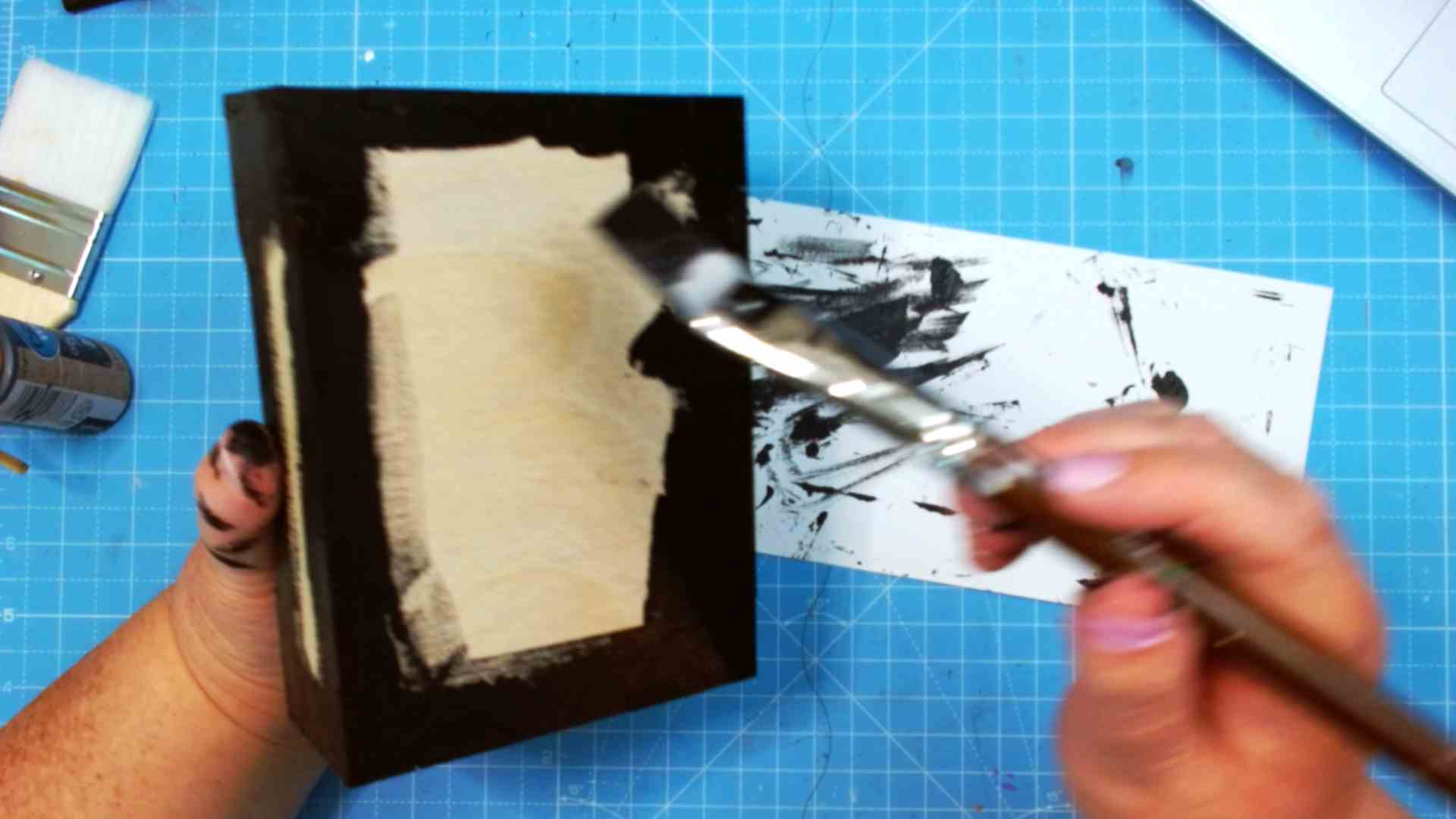 After everything has dried, check to make sure the box is sturdy and that you did not miss any areas that need glue. Next is the fun but messy part. Well for my anyway, I'm always messy when it comes to painting. Just grab your paint brush and your black chalk paint and start painting the areas that you know will not be covered by paper. I painted all the edges around the box and then made sure all the corners and cervices inside and outside the box were covered liberally with paint. See images below.