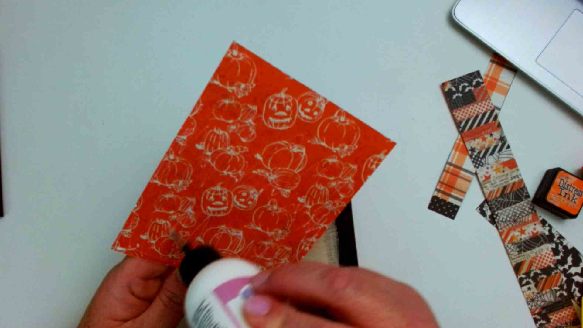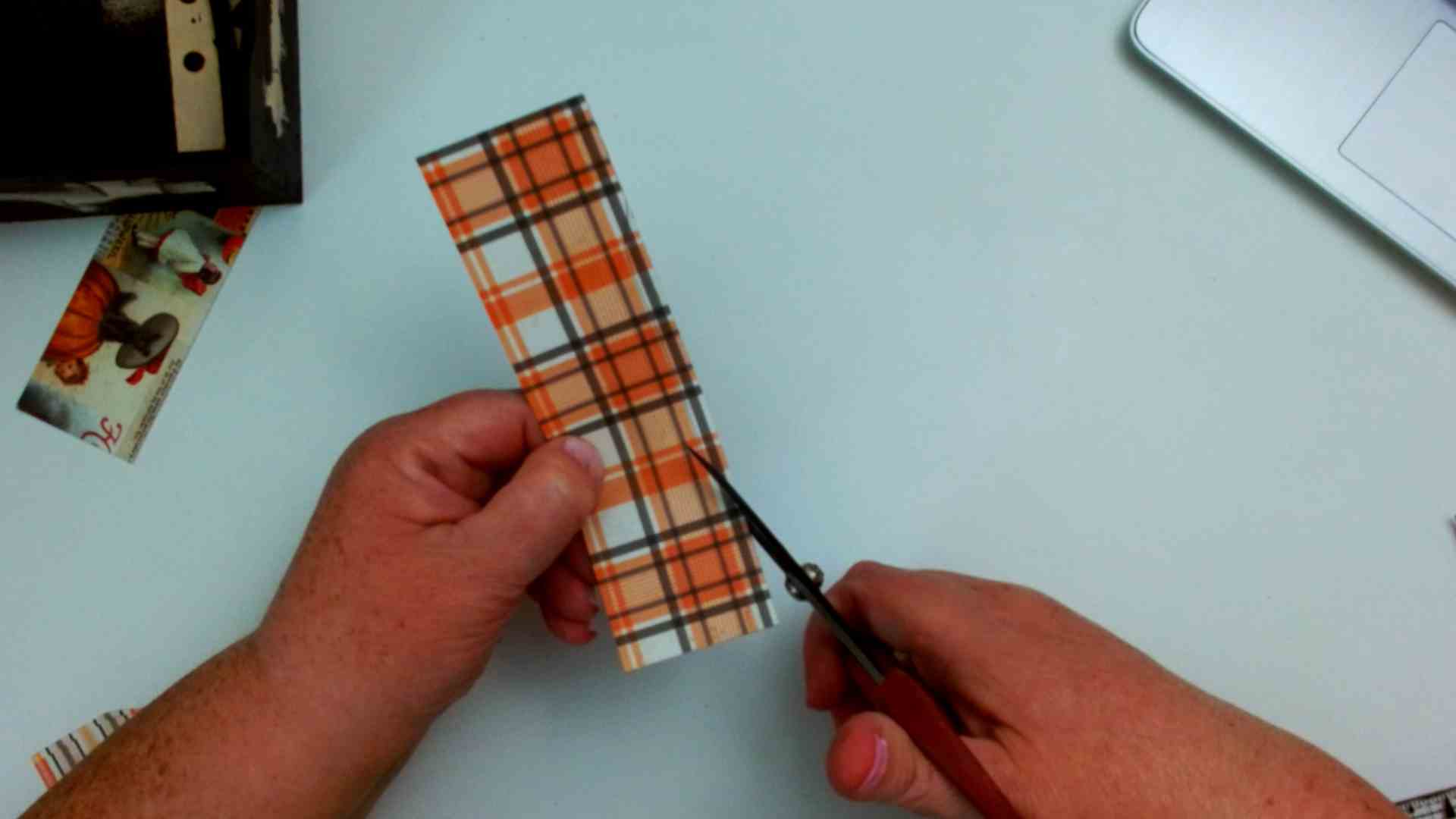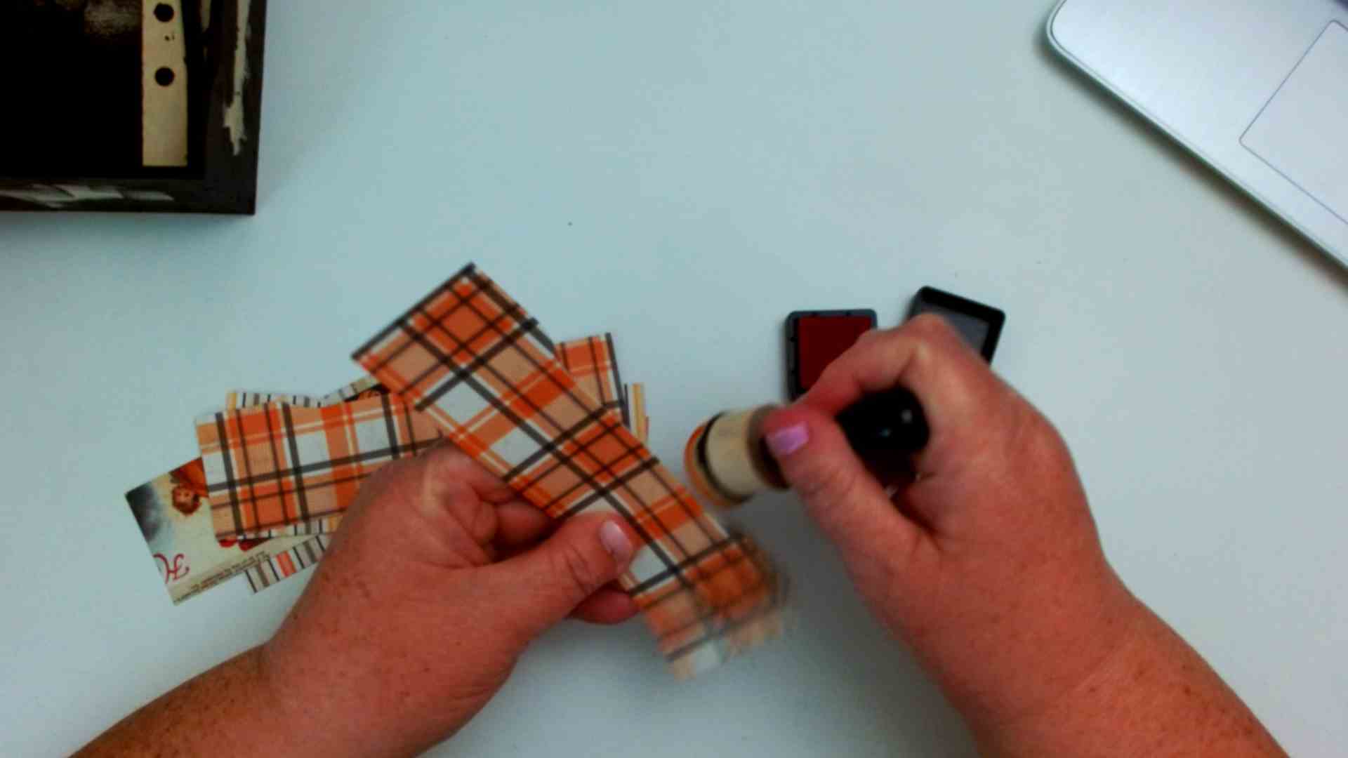 Once you have finished cutting out and inking the papers for the long side now you will need to cut four more pattern papers at 4 5/8" by 1 7/8" inches for the front, back and inside of the box. Then ink the edges with Tim Holtz Carved Pumpkin ink. You will also need 2 sheets of pattern paper cut to
