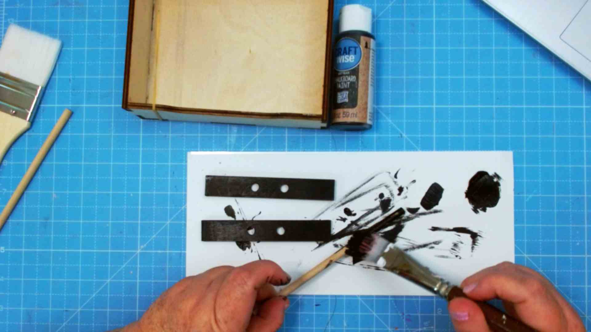 Now that I have the entire box painted, I grab the dowls and paint them along with the dowl holders. Once I have finished my painting, I set them aside to dry.
