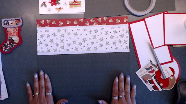 Here is a photo of the supplies you will need for this layout, of course you can use your own pattern papers and ephemera pieces to create your pages. I did use the Chipboard Snowflakes and the Mini Shaker Stocking along with the Christmas sequins.