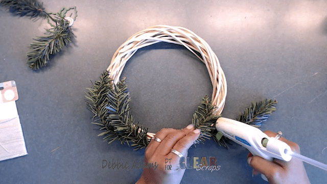 Next I added some foliage to the wreath with hot glue.