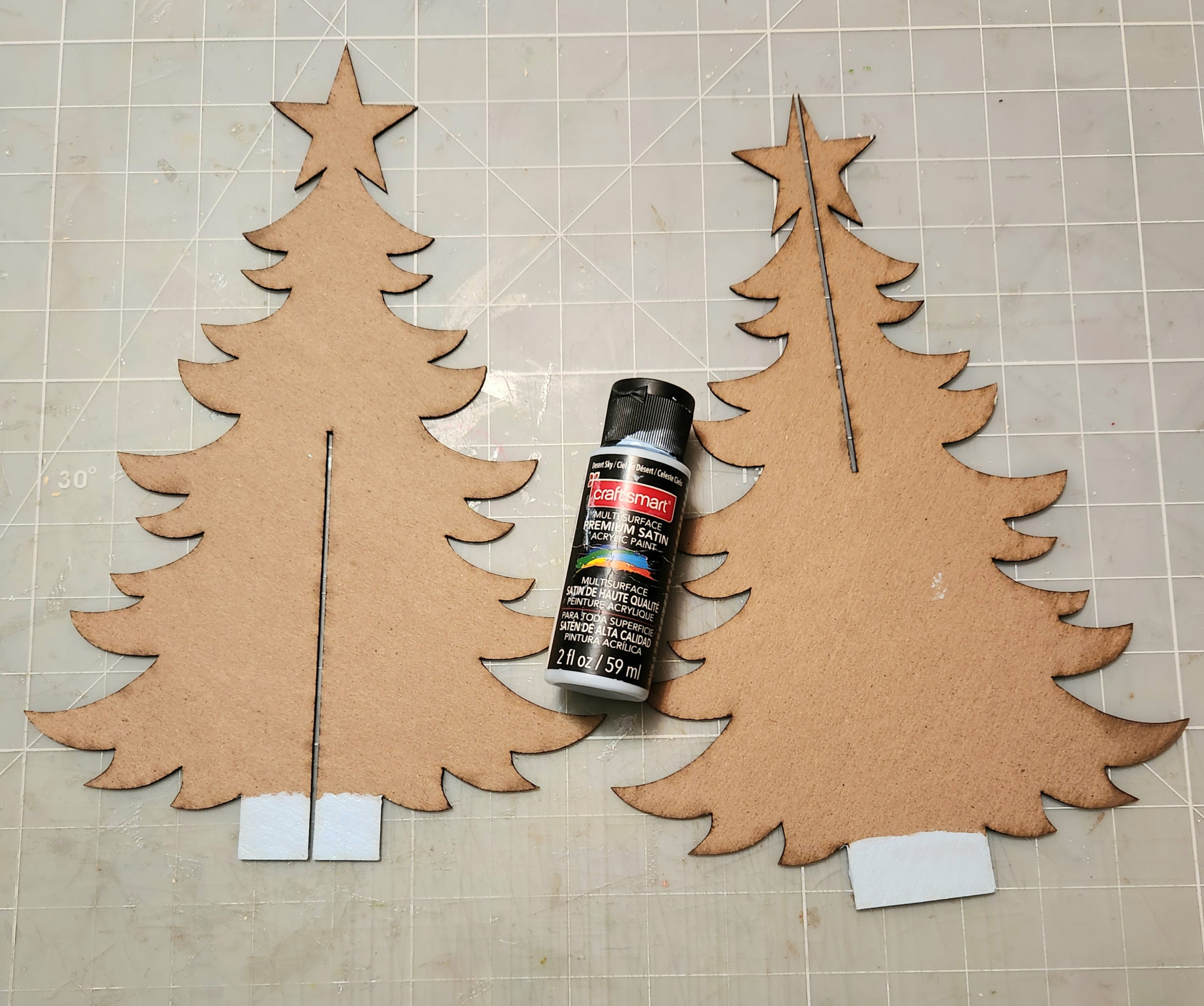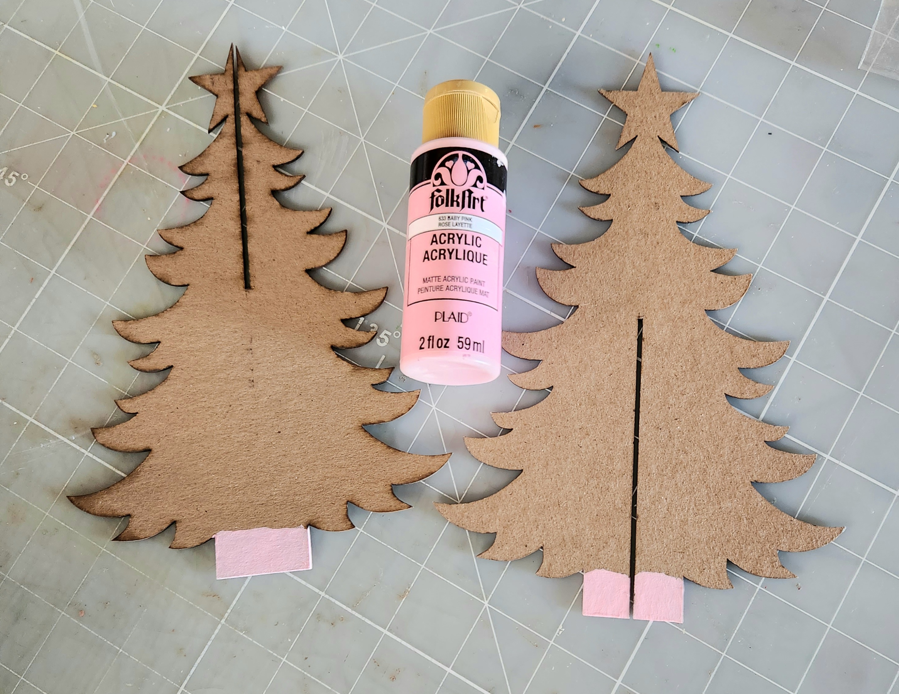 To begin our project, I took some acrylic paint in light blue Desert Sky and Folkart Conch Shell and applied on both sides of each bottom base on the medium and large tree shapes. I also painted all sides of each star on both trees.