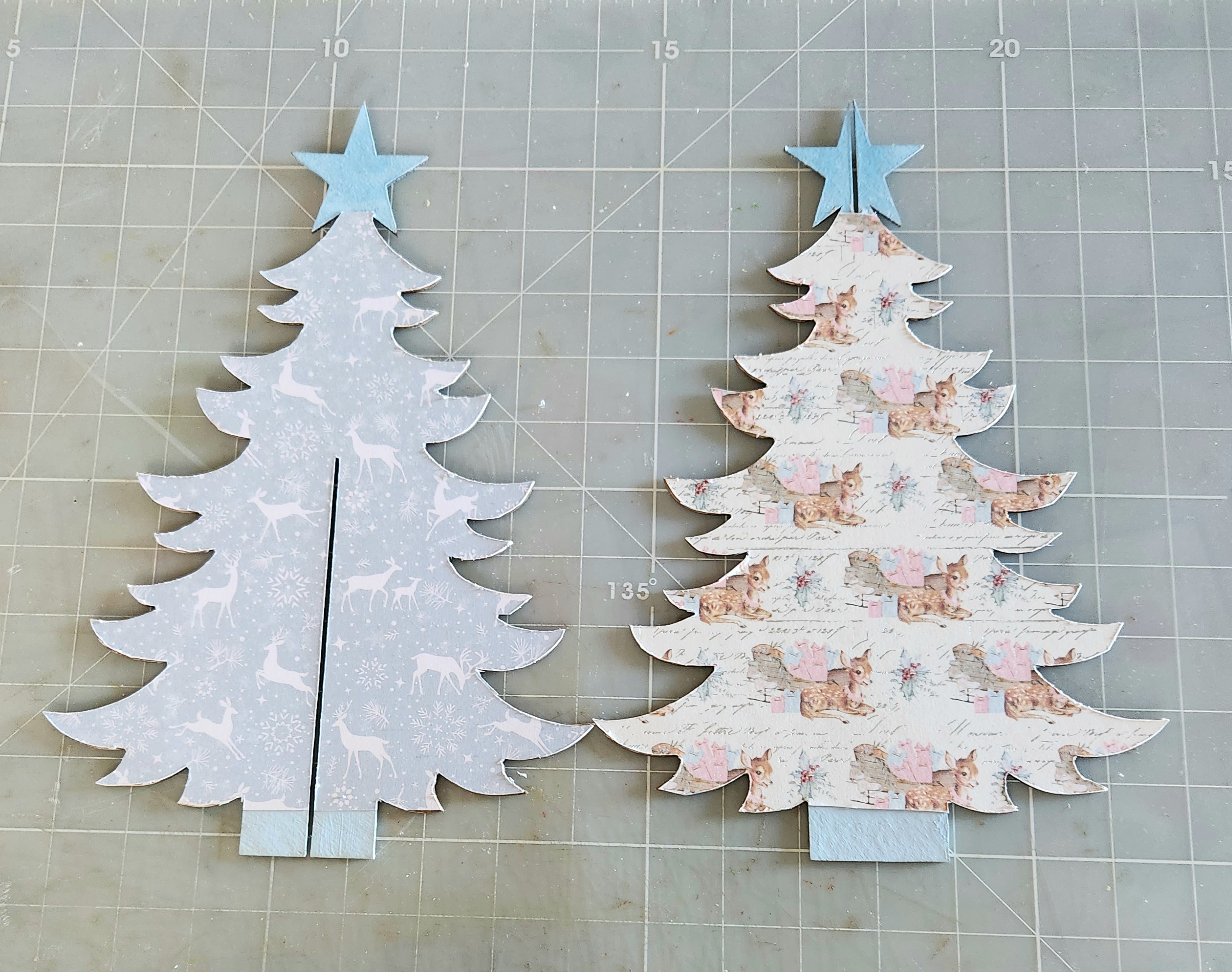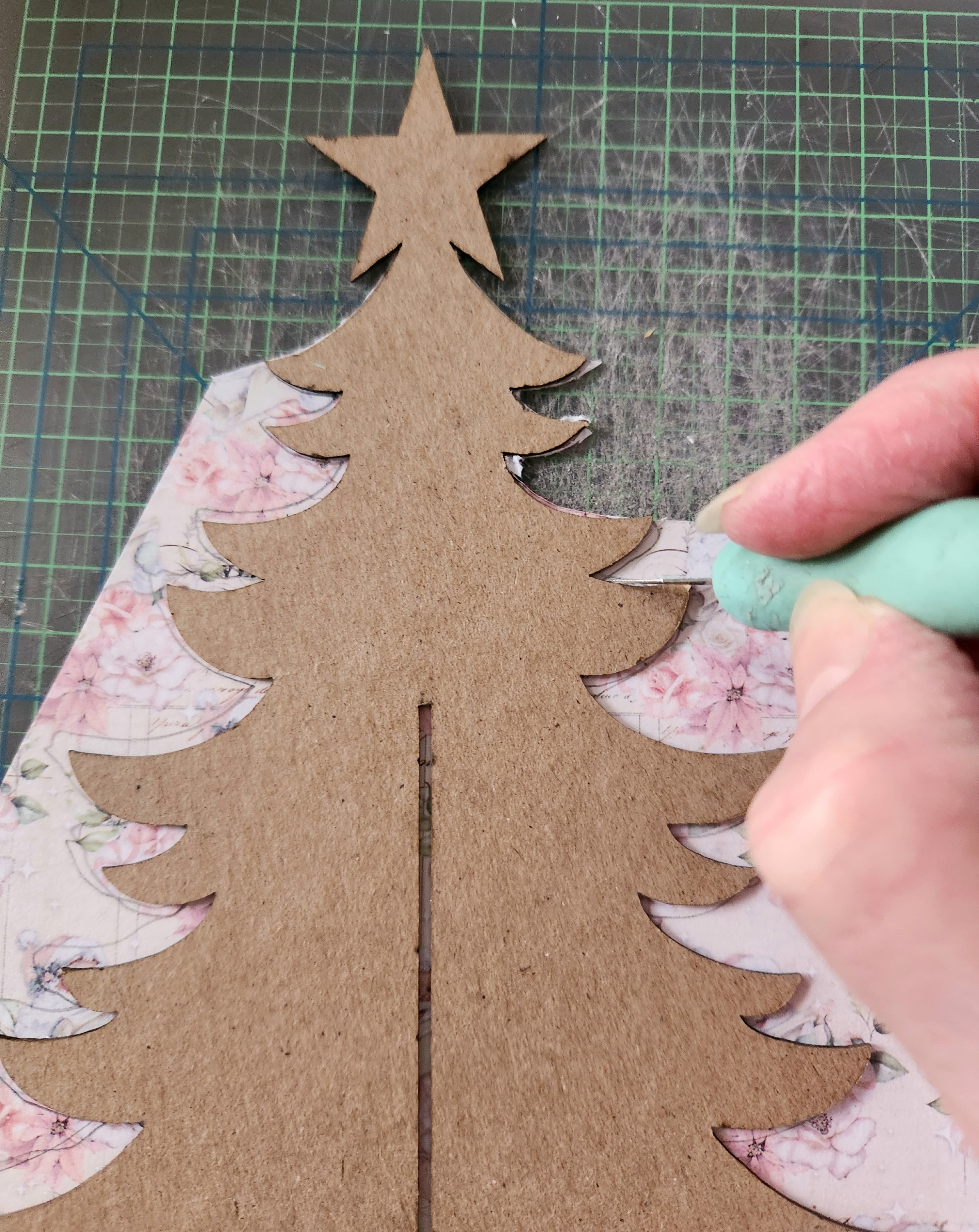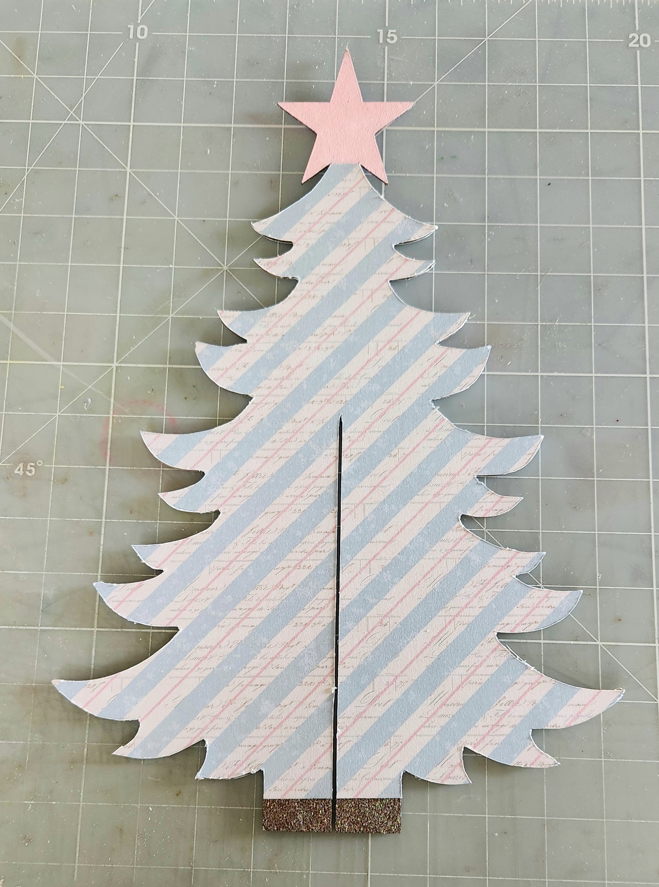 Next trace coordinating patterned papers to all sides of your tree. Trim away any excess paper using a x-acto knife. Then using my Distress tool, I smoothed any rough edges. Repeat this process for each tree. Be sure to cut the slot in the middle of each tree.